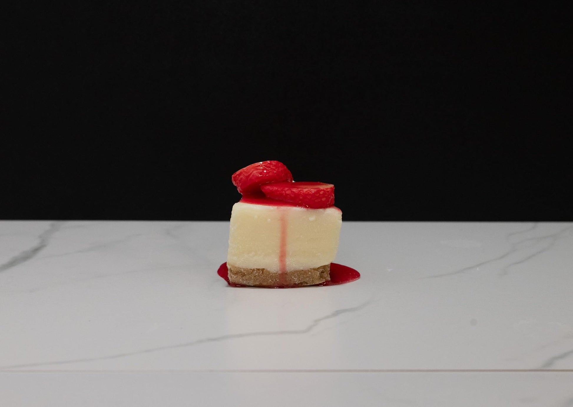 A slice of fake cheesecake with a graham cracker crust, topped with strawberries and sauce.Great for displayEasy to cleanExtremely durableLooks incredibly realHandmade in the USA