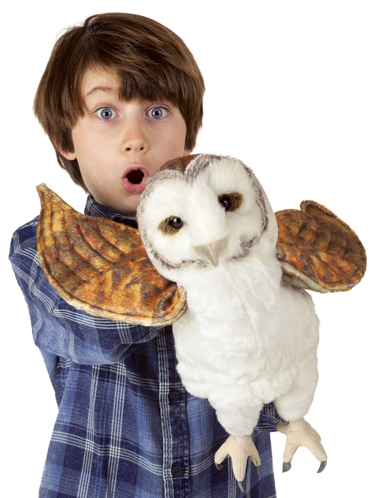 Folkmanis Barn Owl Hand Puppet, White, Brown, 8"Easily animate the antics of this engaging barn Owl hand puppetIdeal for stage and puppet theater, storytelling, teaching, daycare, Pre-School, pretend play, role-playing, presentations, games, parties and giftsInsert hand to move the wings and head mouth of this interactive bird puppetConstructed from high-quality materials with exceptionally realistic details; easy to care for years of playComfortably slips over the hand; measures 10 x 7 x 14 inches (LxWxH)