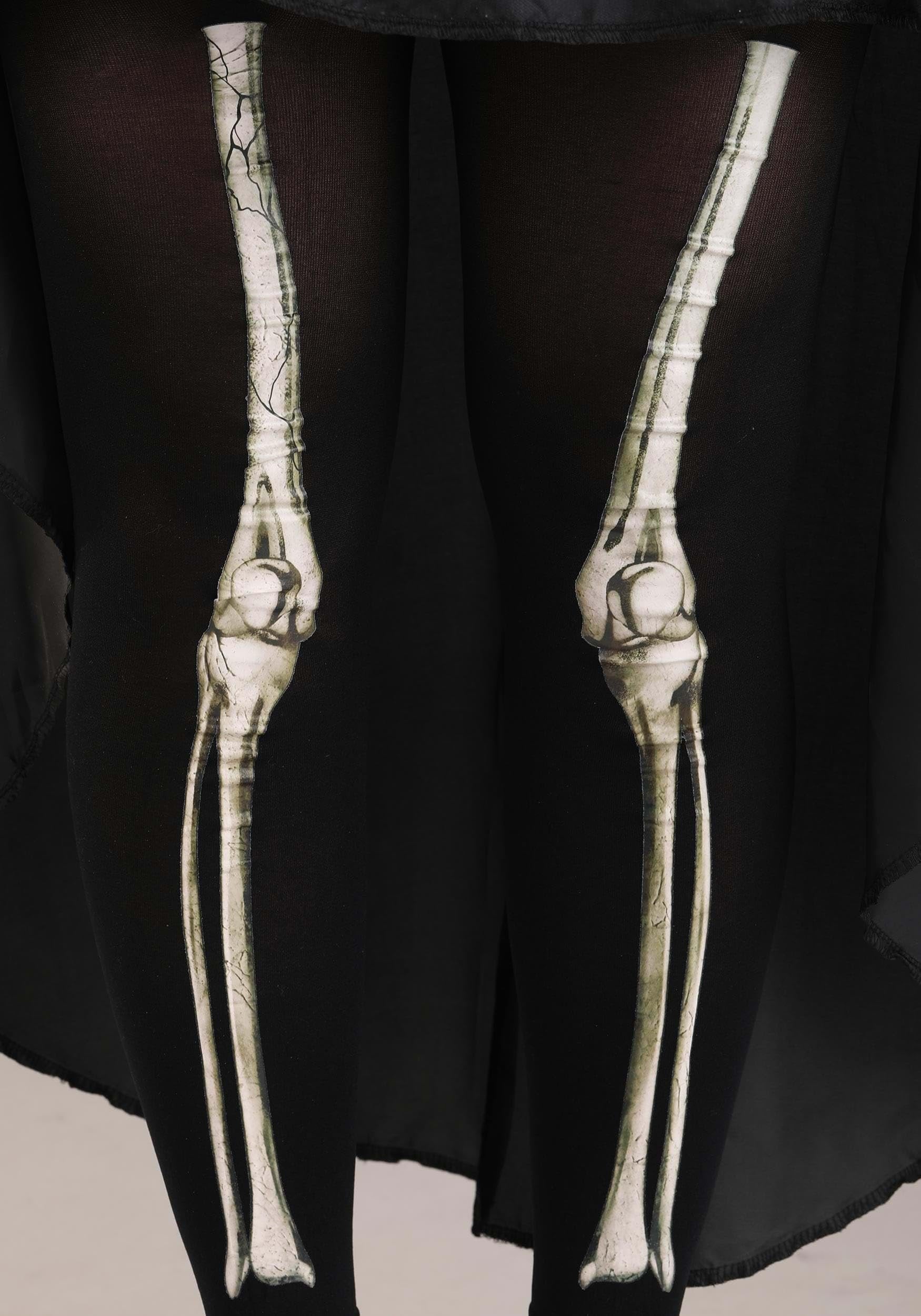 It's Time for the Monster Mash Think that the living are the only ones who celebrate during the month of October? Think again! On Halloween night, the ghouls return to walk the earth. Withered hands claw through graves and crypt doors swing rustily open as the dearly departed rise from their final resting places. At the stroke of midnight, they make their way to the Hallows Ball (a Who's Who-style event where the cream of the undead society can be spotted - kind of like the Met Gala but with more decomposing flesh). When the moon is high, you can hear their whispery chatter as they await the entrance of their queen - a sinister yet compelling figure whose elegant shinbones can dance the night away with the best of them. Product Details Become the rightful queen of Halloween in this showstopping Skeleton Queen Costume for Women! This darkly regal high-low dress has a beautifully rippling skirt that hits the mid-thigh in front and ends at mid-calf in the back. Shiny looped skirt detail makes this dress fit for an undead 18th-century court, and the matching sleeve puffs and high collar add the last word in macabre elegance. The bodice has a flattering square neckline and a print of a skeleton's ribcage and spine, while the long sleeves and leggings show the upper and lower bones of the arms and legs. Bow Down Dust off your best crown and prepare to meet your subjects . It doesn't matter how long you've been gone from the mortal world - on Halloween night, you always rule!100% polyester dress, 100% nylon tights
