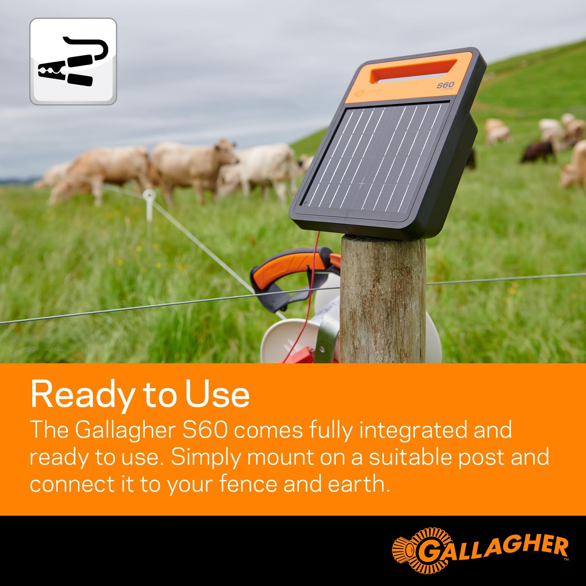 The Gallagher S60 is a reliable solar electric fence charger designed for small pastures, gardens, and wildlife exclusion zones. With a built-in lithium battery, it delivers faster charging and longer run times—making it ideal for remote or off-grid use. This 0.6-joule energizer powers up to 6 miles of fence in typical conditions, keeping your animals safe and predators out. Gallagher's propietary Pulse Modulation technology provides consistent voltage through low amounts of vegetation. Whether you're managing chickens, goats, or vegetable plots, the S60 provides dependable control with minimal maintenance. Its rugged design features UV-resistant plastic, a tempered glass panel, and fully sealed electronics that stand up to tough weather. Lightweight and easy to install, it's perfect for rotational grazing or seasonal fence setups. No grid? No problem—this solar energizer runs on sunshine and hard work.Solar-Powered with Lithium Efficiency | Harness the sun’s energy with high-performance lithium battery tech — charges faster and holds power longer, even in cloudy conditions. A true plug-free solution for off-grid grazing and garden protection.Dependable Power for Up to 6 Miles | Delivers a clean, consistent pulse to fences up to 6 miles under typical conditions — perfect for rotational grazing, backyard poultry setups, or perimeter garden fencing.Built for Livestock, Poultry & Gardens | Keep goats, chickens, and pets contained while keeping raccoons, deer, and coyotes out. Ideal for hobby farms, acreage owners, and anyone managing mixed-use land.Tough, Weather-Resistant Design | UV-stabilized casing, tempered glass solar panel, and sealed electronics ensure long-term performance in sun, rain, and snow. Built for life in the field, not the shed.Lightweight & Easy to Install | Compact and portable at just 4.4 lbs — mount it on a standard post or T-Post in minutes. No trenching, no wiring. Just set it up and let the sun do the work.