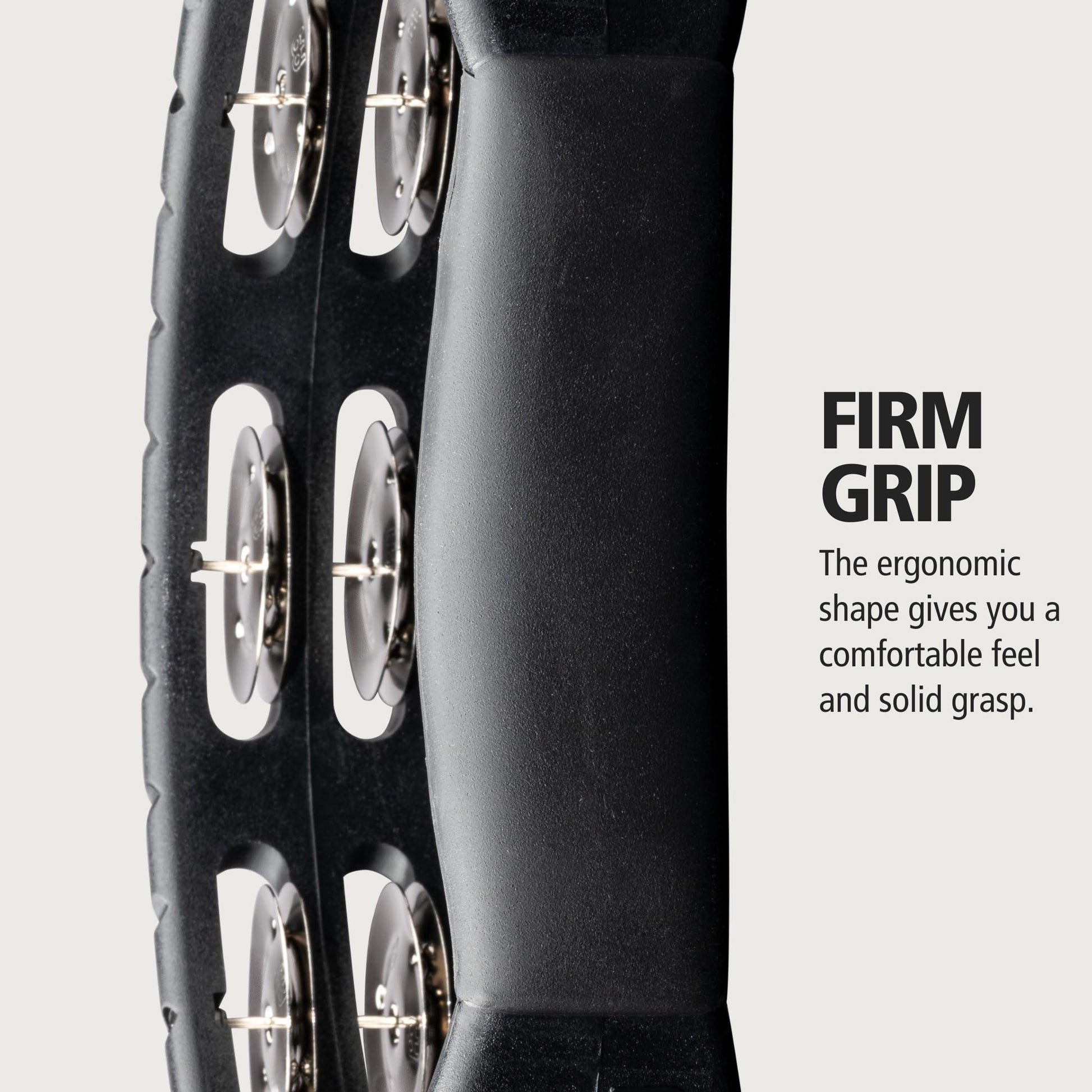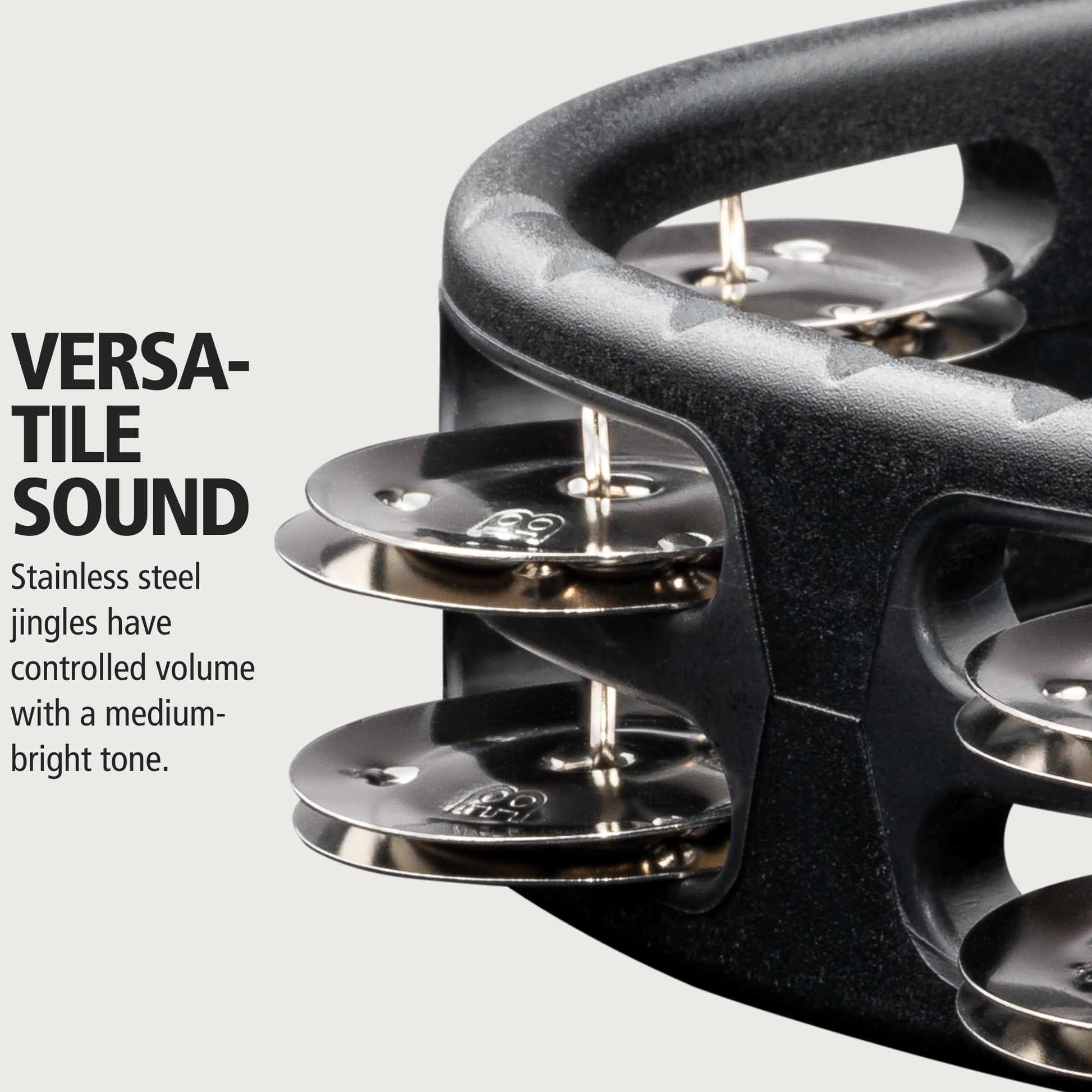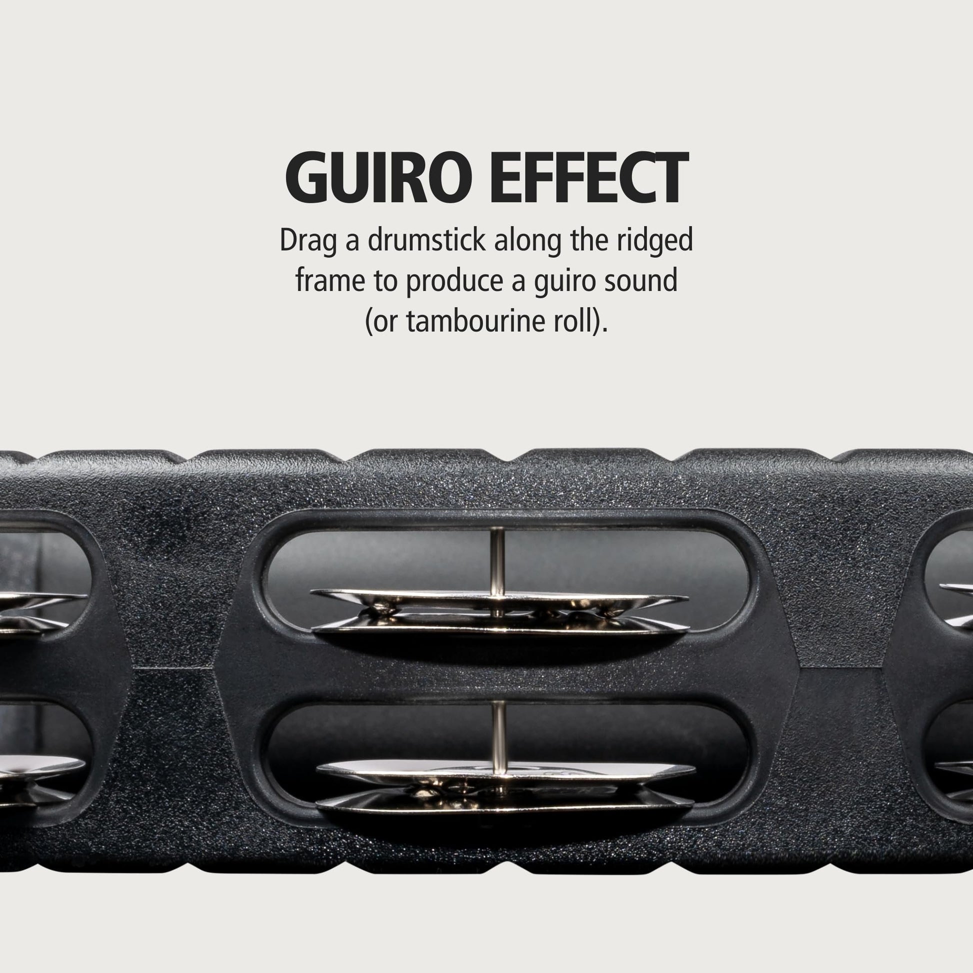 Meinl Percussion HTMT1BK Handheld ABS Plastic Tambourine with Guiro Style Frame, Single Row Steel Jingles,BlackSTRESS-FREE USAGE: the Meinl Headliner Handheld Tambourine is built around comfort and durability, along with outstanding musical tone; its half-moon shape gives you instant balance while playing, even if you're a beginnerWHY IT MATTERS: it's easy to use and control whether you're an experienced percussionist or a singer; no prior skill requiredDRIVING THE SOUND: stainless steel jingles respond with a medium-bright tone and controllable volume that supports the mix in acoustic settings and under mics in plugged-in settingsONE BIG THING: this tambourine is super durable with its 100% synthetic all-weather frame; great for indoor/outdoor useOF NOTE: the ergonomic grip is enlarged to get a firm grasp; this area gives you a solid handle on the tambourine with a comfortable feelZOOM IN: the frame is molded with ridges that you can drag a drumstick across to create a guiro sound effect (or tambourine roll)THE TAKEAWAY: this do-it-all tambourine performs great indoors and outside; for all skill levels