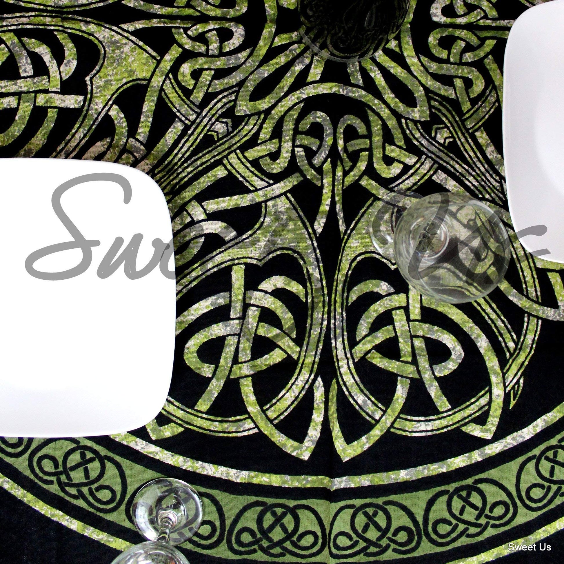 A beautiful CELTIC KNOT PRINT tablecloth highlighting a spectacular design in shades of black and green flaunting fascinating multiple borders. It is perfect to enhance your dining ensemble.