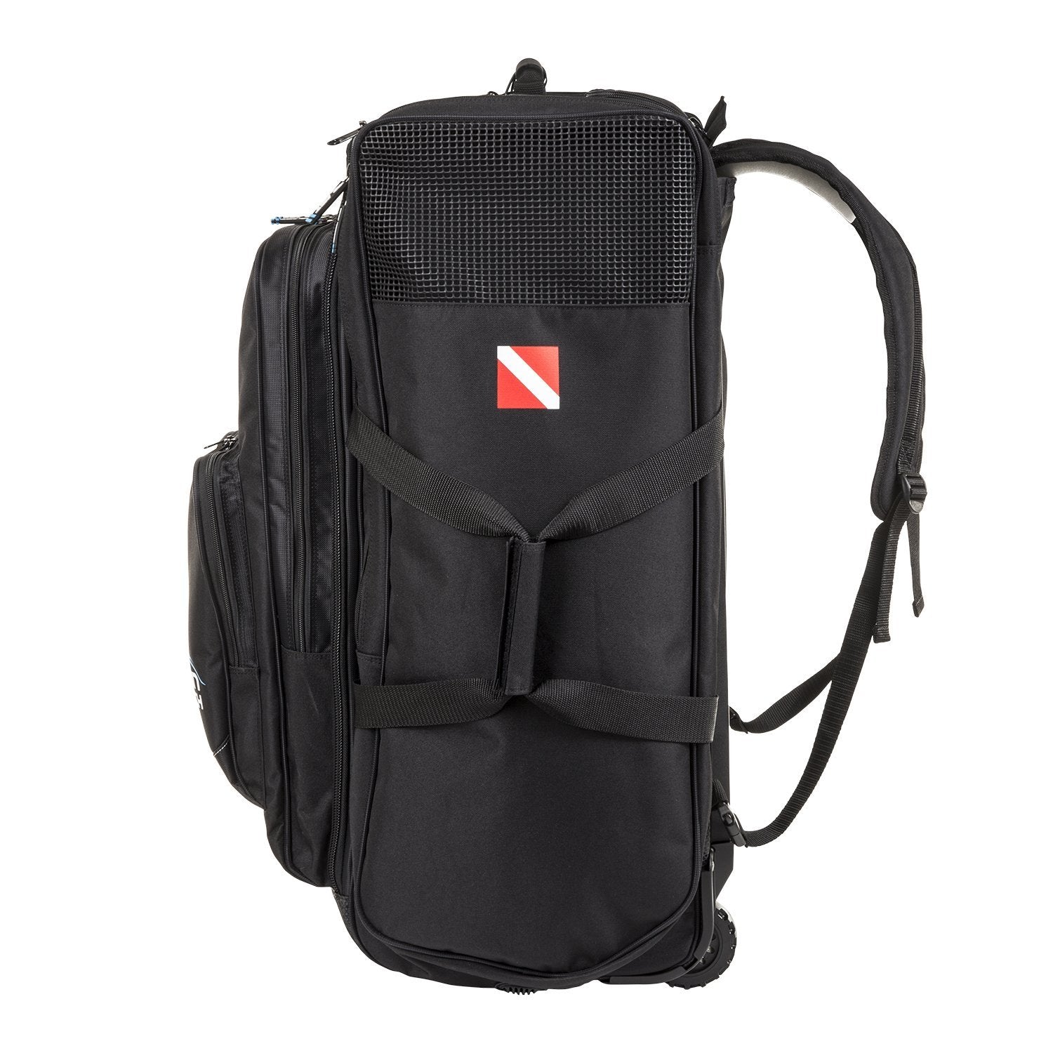 3-WAY USE — Includes duffle bag straps, backpack design & retractable roller handle.ROOMY STORAGE — Spacious main compartment can accommodate 2 complete sets of scuba equipment & gear.SMOOTH ROLLING — Shock-absorbing wheels are silent for convenient travel.COMFORTABLE USE — Padded shoulder straps ensure maximum comfort when used as a backpack.PERFECT SIZE — Measures 27 1/4 x 16 x 17 inches & weighs just 11 lbs.