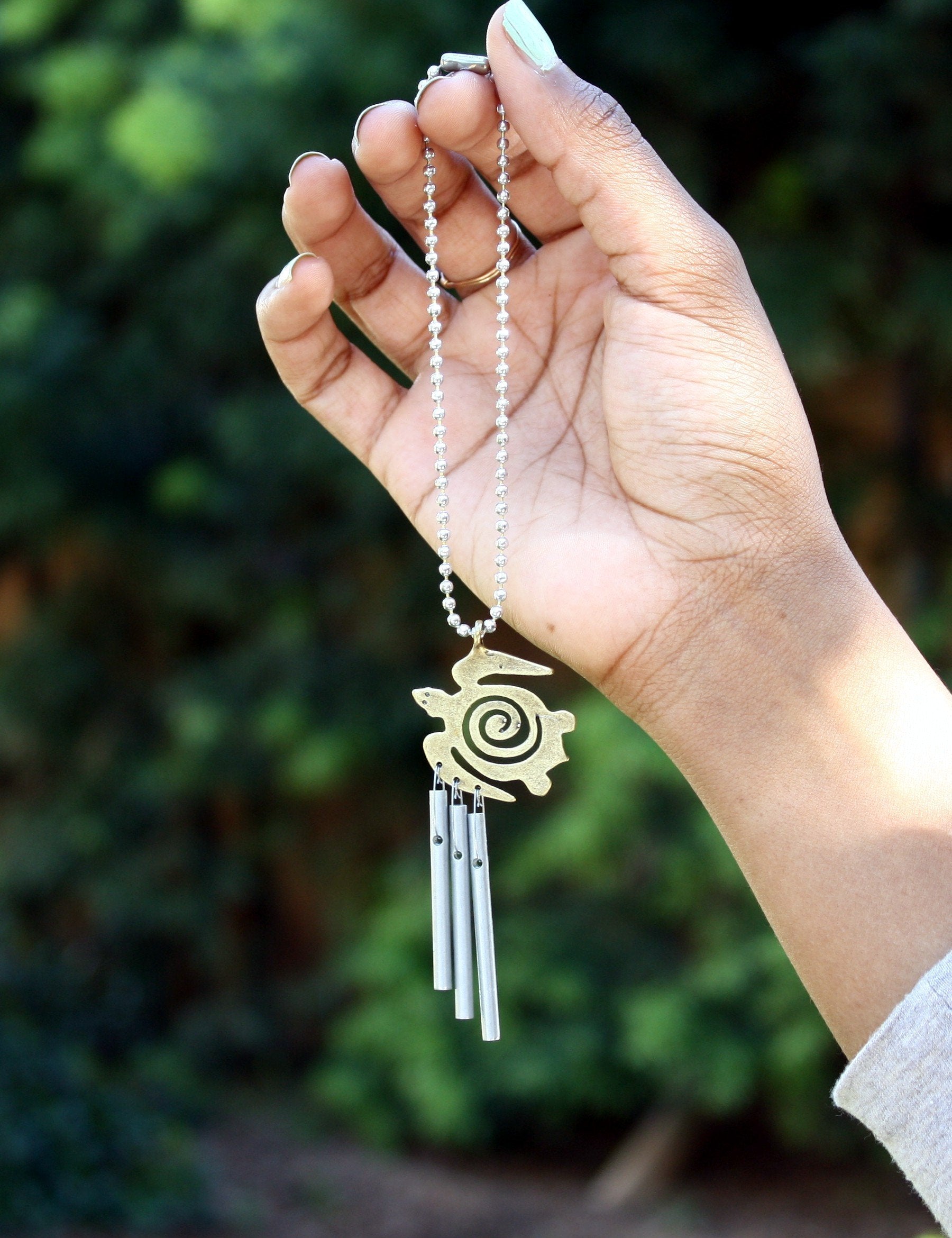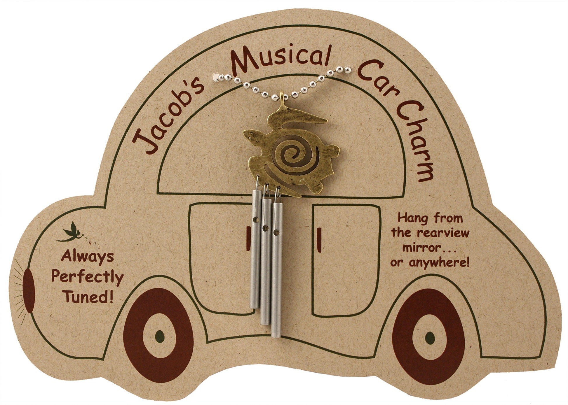 What better way to soothe the soul and calm nerves in bumper to bumper traffic than with this delightful musical car charm with mini wind chimes? Cast metal charm is finished in antique brass. Relaxing and pleasing sound from three perfectly tuned aluminum pipes. The blending of its three notes, all tuned in the pentatonic scale, creates a pleasant & musical effect that makes music wherever you go. Made by musical instrument maker Jacob Sokoloff Approximate measurements: 3-in tall x 3/4-in wide, on a 9-in ball chain. Longest pipe 1-1/4″. Made in the USAHang from the rear view mirror, decorate your spice cupboard, use on a door knob, as a holiday ornament or as a ceiling fan pull.The blending of its three notes, all tuned in the pentatonic scale, creates a very delicate, pleasant & musical effect that makes music wherever you go.Made by musical instrument maker Jacob Sokoloff Approximate measurements: 3-in tall x 3/4-in wide, on a 9-in ball chain. Longest pipe 1-1/4″.9" ball chain included.Happily made in the USA
