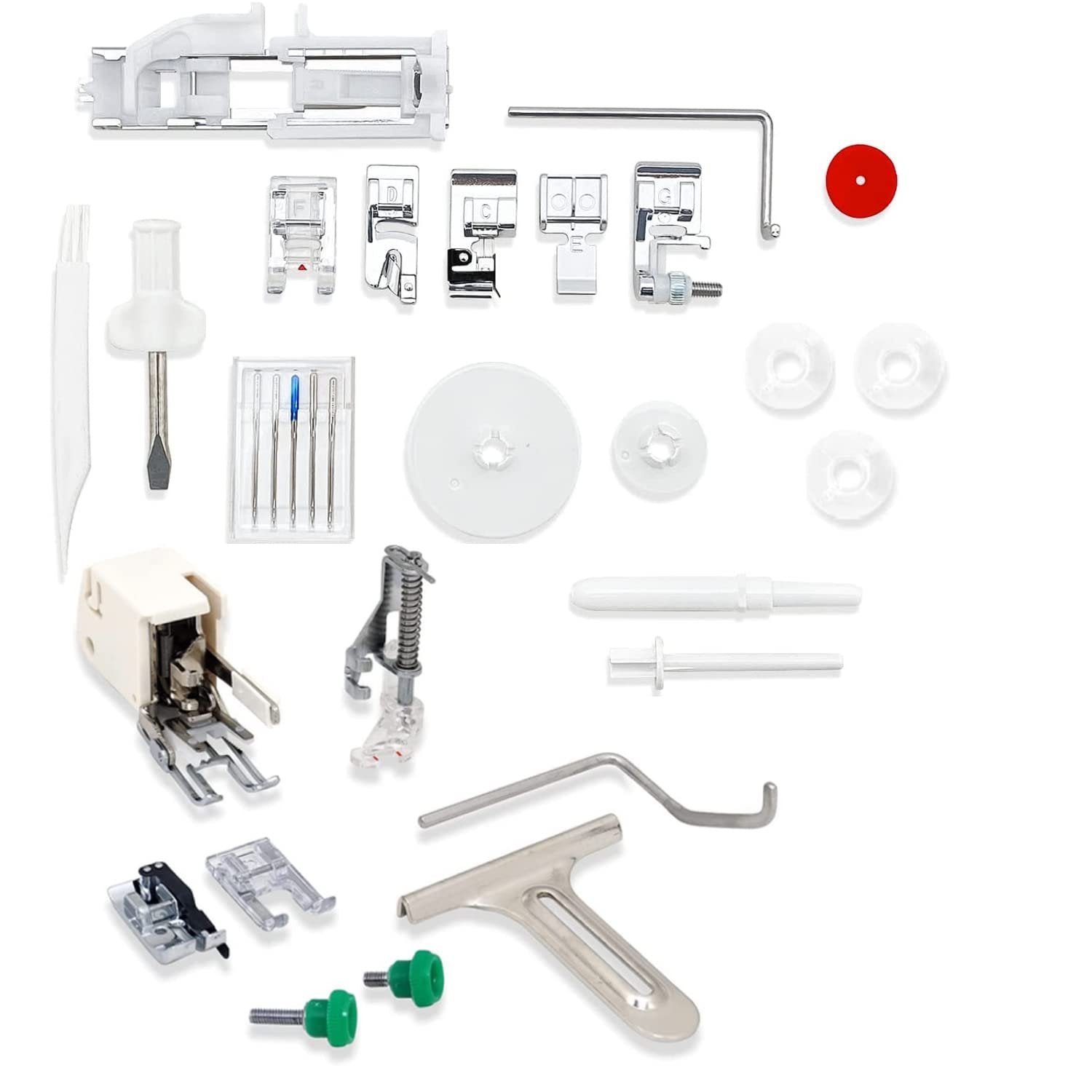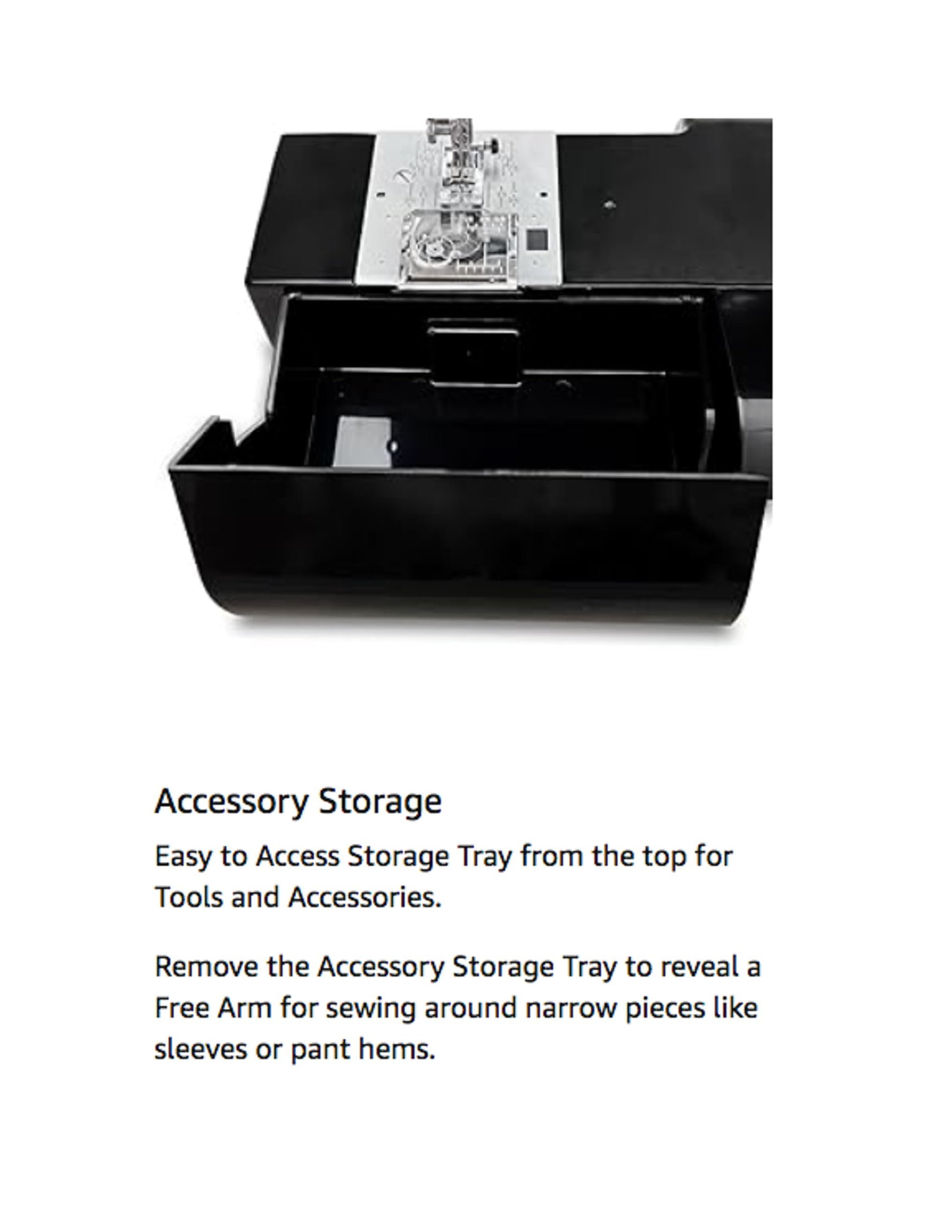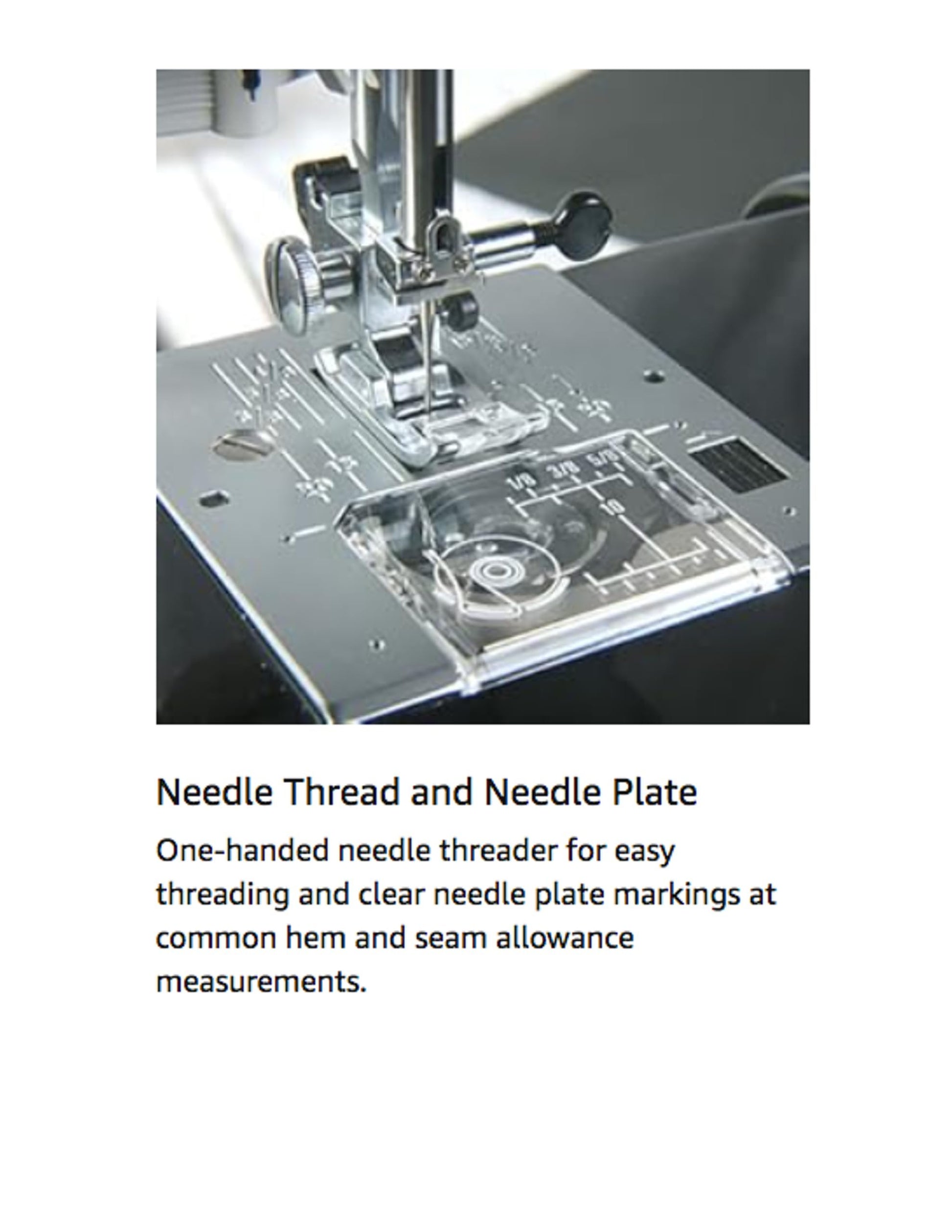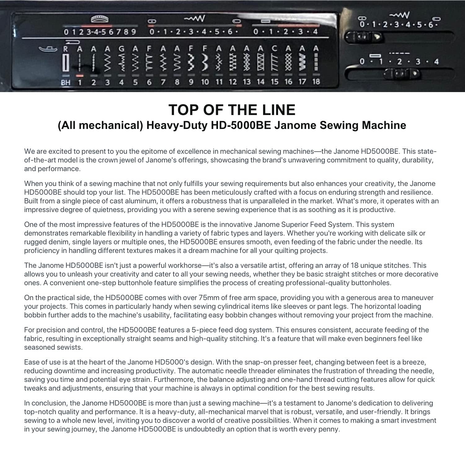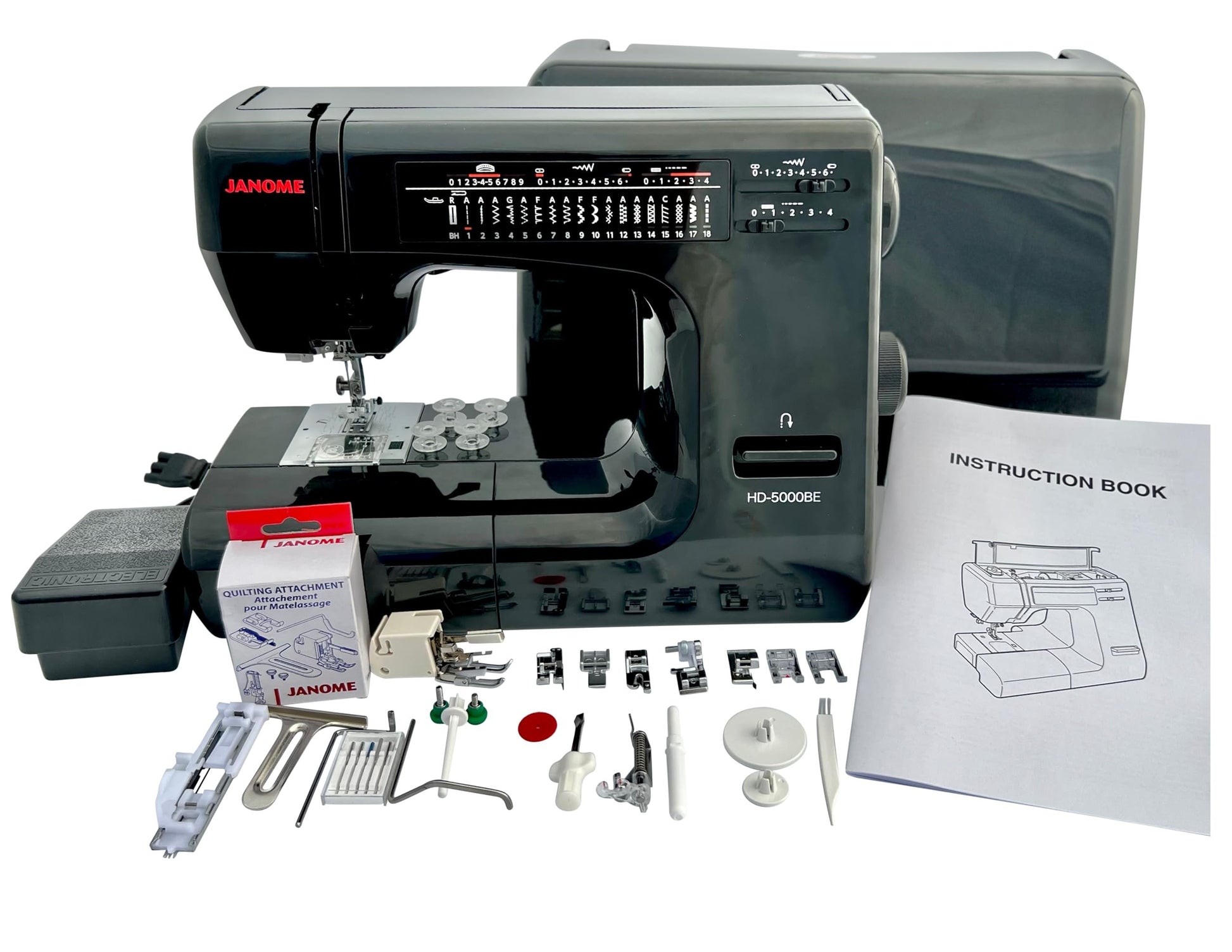 Janome HD-5000 Black Edition Heavy-Duty Sewing Machine with Aluminum Body, 18 Stitches, Free Arm, and Built-In Needle ThreaderVersatile: The Janome HD-5000 Black Edition is a heavy-duty machine, perfect for a beginner or sewist looking to do a wide range of sewingDetailed Guidelines: A handy instructional guide is in the top tray door of the machine, which indicates the feet and stitch settings for a variety of sewing tasksBody: The sewing machine has a heavy-duty aluminum bodyStitches: It is equipped with 18 built-in stitch patterns including a one-step buttonhole to give you the tools you need to handle any kind of sewing projectEasy Adjustment: Stitch length and width adjustment are conveniently located on the front of the machine