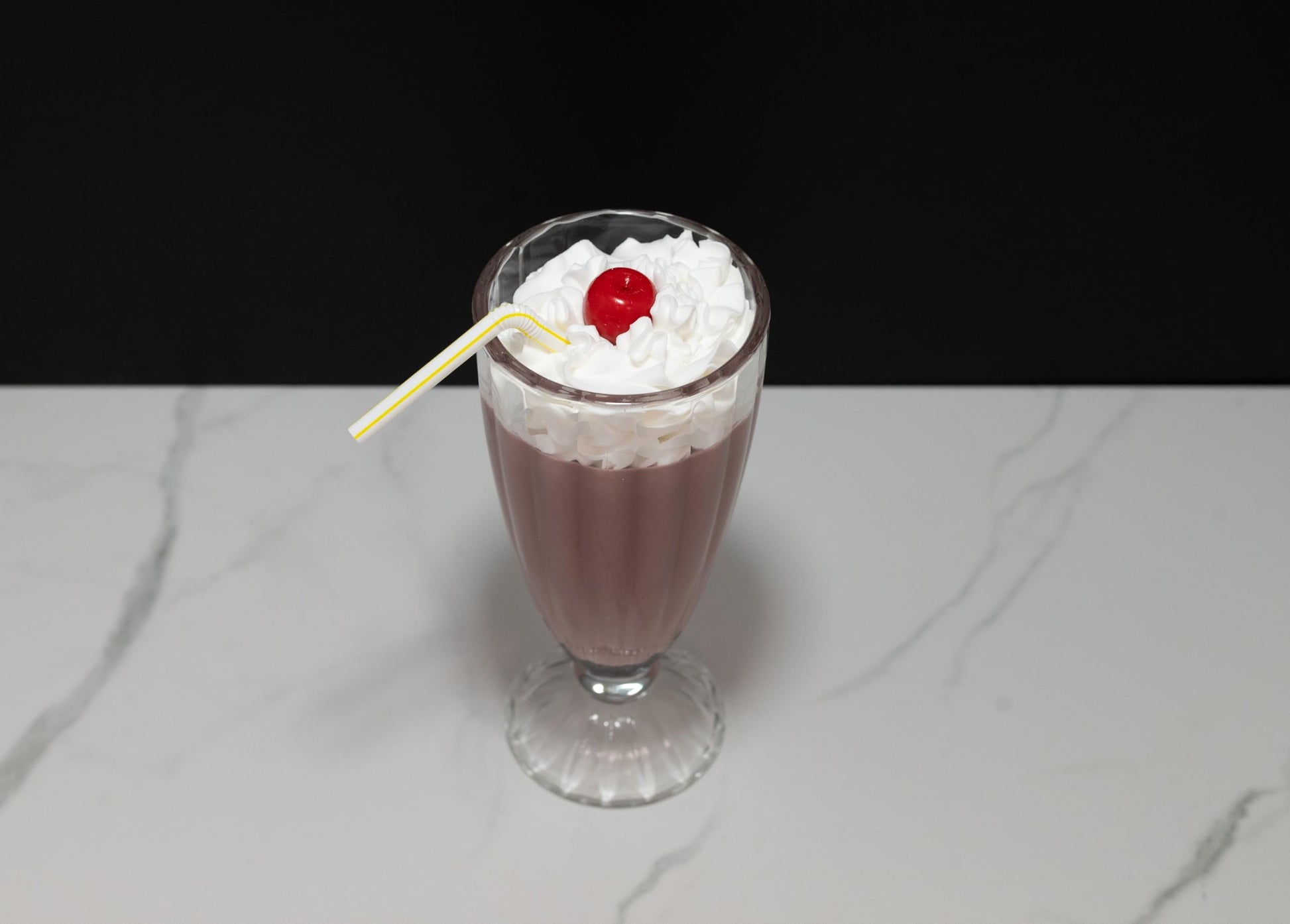 Chocolate milkshake topped with whipped cream and a cherry. (Style of glass may vary)Great for displayEasy to clean