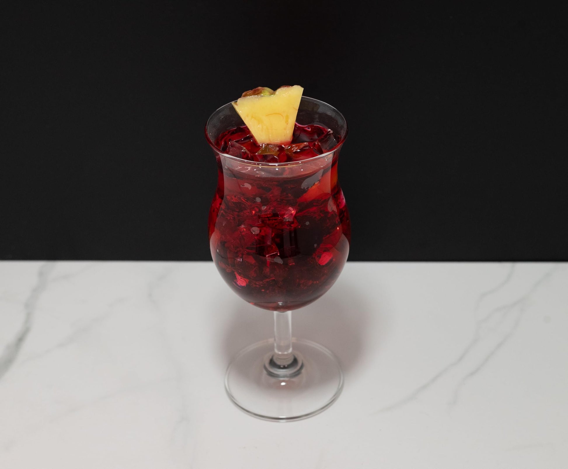 Sangria drink with fruit and a strawberry on the side of the glass. (fruit used may vary)Fake Sangria