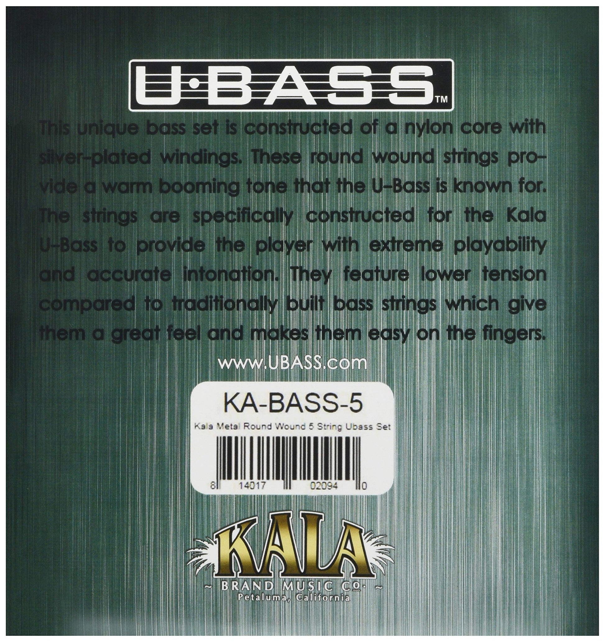 Kala Silver-Plated Nylon Core Metal Round Wound Strings, U•BASS® 5-String Set, Lower Tension Bass Strings, Accurate IntonationSilver-Plated Nylon Core Strings: These UBASS 5-string sets are constructed with a durable nylon core and silver-plated windings, providing a warm, rich, booming tone that enhances your Kala UBASS soundSmooth Round Wound Design: The round wound strings ensure smooth playability and lower tension, making them comfortable and easy on the fingers for extended playing sessions without compromising on toneAccurate Intonation: Specifically designed for Kala UBASS models, this 5-string set delivers precise intonation, ensuring that your UBASS plays with clarity and accuracy across all notesIdeal for Acoustic UBASS: Compatible with all acoustic Kala UBASS models, these strings are not suitable for Kala solid body models with magnetic pickups, ensuring they fit the right instrumentEnhanced Playability for All Levels: With their lower tension, these strings offer ease of use for both beginners and professionals, bringing out the best sound and comfort for any UBASS player