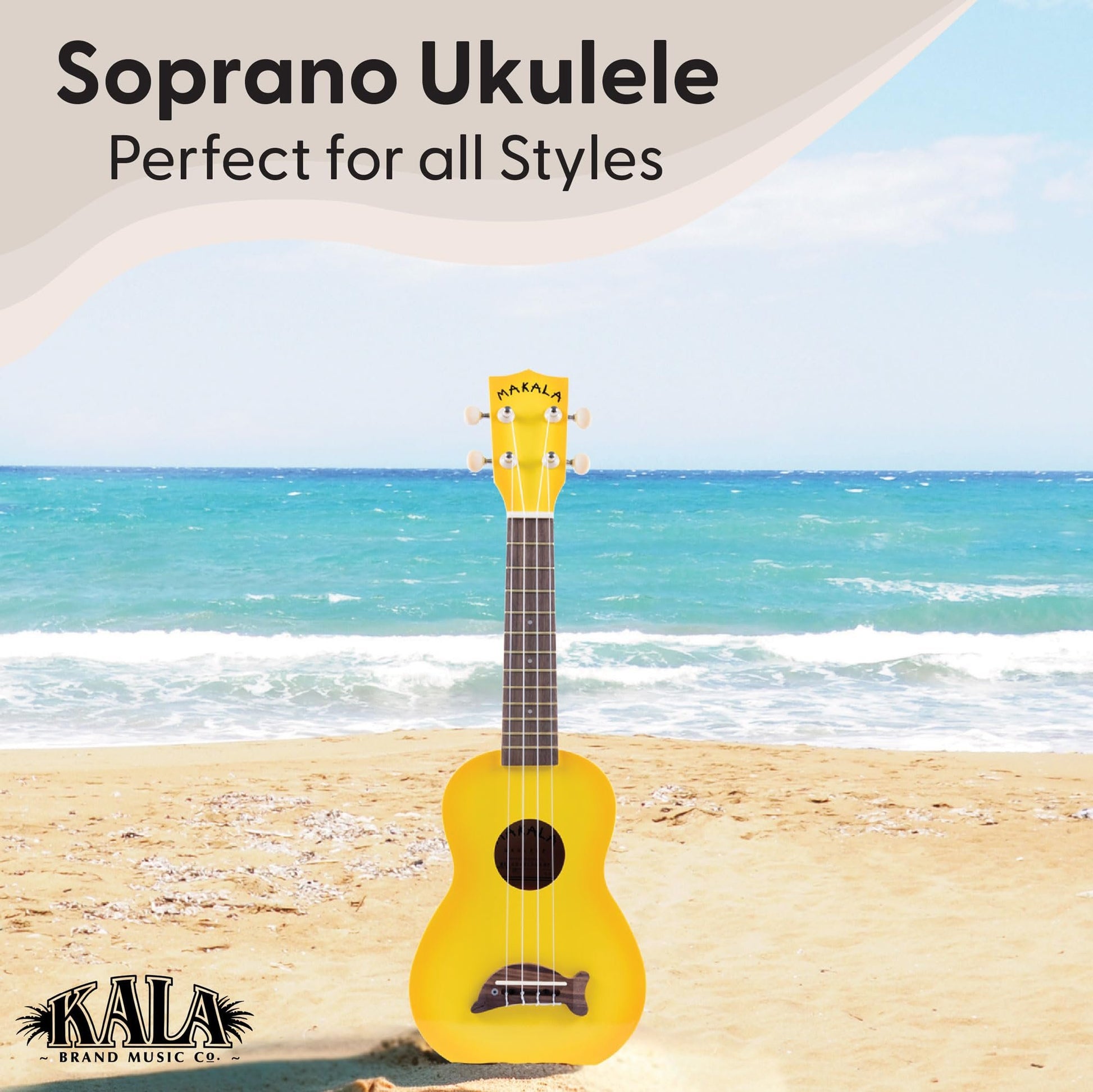 Kala Brand Music Co. Makala Dolphin, 4-String Ukulele, Right, Yellow Burst, Soprano Fun Design, Aquila Strings, & Durable BuildPlayful Dolphin Bridge: Featuring a playful dolphin-shaped bridge, this ukulele brings charm and fun to every performance. Its unique design adds character and appeal, making it ideal for musicians of all ages and experience levelsMahogany Build Materials: Built with a mahogany top and ABS composite back and sides, this ukulele produces resonant tones with durable construction. Its robust build ensures long-lasting performance for lessons, casual playing, or live showsAquila Super Nylgut Strings: Designed with Aquila Super Nylgut strings, this ukulele provides bright, clear tones and stable tuning. These premium strings enhance sound clarity, offering a professional playing experience for all musiciansLightweight & Beginner-Friendly: Weighing only 16 ounces, this ukulele is compact and easy to transport. Ideal for lessons, travel, or performances, its lightweight build ensures comfort and convenience for on-the-go musiciansGlossy Yellow Burst Finish: The vibrant Yellow Burst finish with a glossy coating creates bold, eye-catching style. Great for practice or gifting, this stunning design ensures the ukulele stands out in any music setup or performance