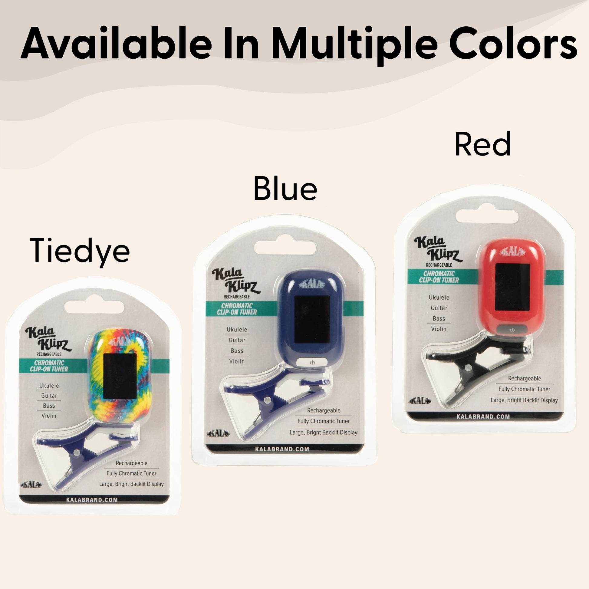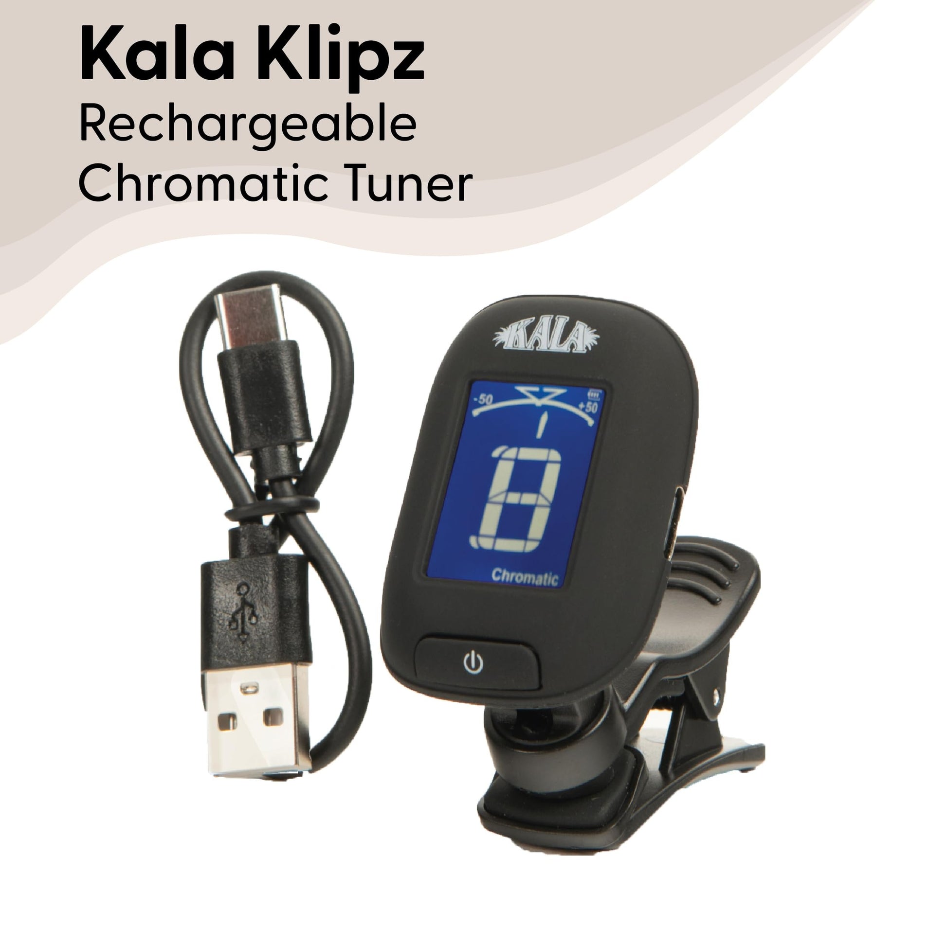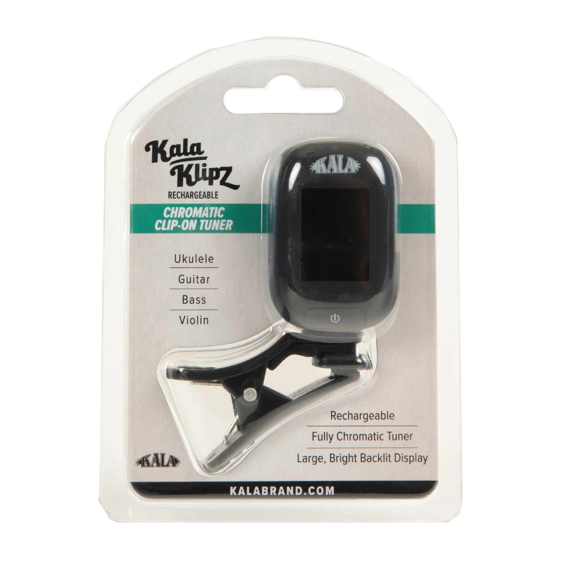 The Kala Klipz Rechargeable Chromatic Tuner delivers high-precision tuning for ukulele, guitar, bass, violin, mandolin, and more. Designed for versatility and accuracy, this clip-on tuner ensures quick, reliable tuning with a wide frequency range from A0 (27.5Hz) to C8 (4186Hz) and a precision tolerance of +/-1 cent. Equipped with multiple tuning modes, including Chromatic, Ukulele, Guitar, Bass, and Violin, it adapts to your instrument with ease. The vibration-based detection eliminates interference from background noise, making it great for tuning in any environment. Powered by a rechargeable battery, this tuner offers eco-friendly convenience with an included USB-C charging cable for extended use. The clip-on design ensures a secure fit and effortless operation, whether you're at home, in the studio, or performing on stage. Upgrade your tuning experience with the Kala Klipz Rechargeable Chromatic Tuner, designed to help you get in tune and stay there with precision and ease.Versatile & Precise: Works with ukulele, guitar, bass, violin, mandolin, and more, ensuring accurate tuning across all instrumentsRechargeable Battery: Features a built-in rechargeable battery with included USB-C charging cable for long-lasting performanceHigh Accuracy Tuning: Offers a wide range from A0 (27.5Hz) to C8 (4186Hz) with a precise tolerance of +/-1 centEasy-to-Use Clip-On Design: Detects pitch through vibration, eliminating background noise for reliable tuning in any environmentMultiple Tuning Modes: Select from Chromatic, Ukulele, Guitar, Bass, and Violin settings for a customized tuning experience