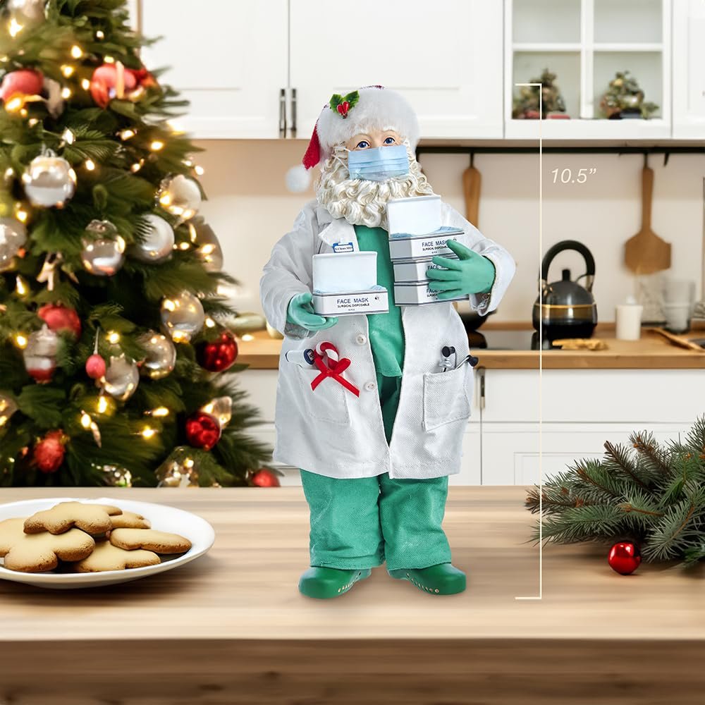 Kurt Adler 10.5-Inch Fabriche Santa Doctor in Scrubs Holding Boxes Of Masks, Multi-color, (FA0144)Part of the Kurt Adler Fabriché collectionMade of fabric mache, PVC, and polyesterOld fashioned Santa helps celebrate all your traditionsPerfect for any holiday décorApproximately 10.5-inches tall