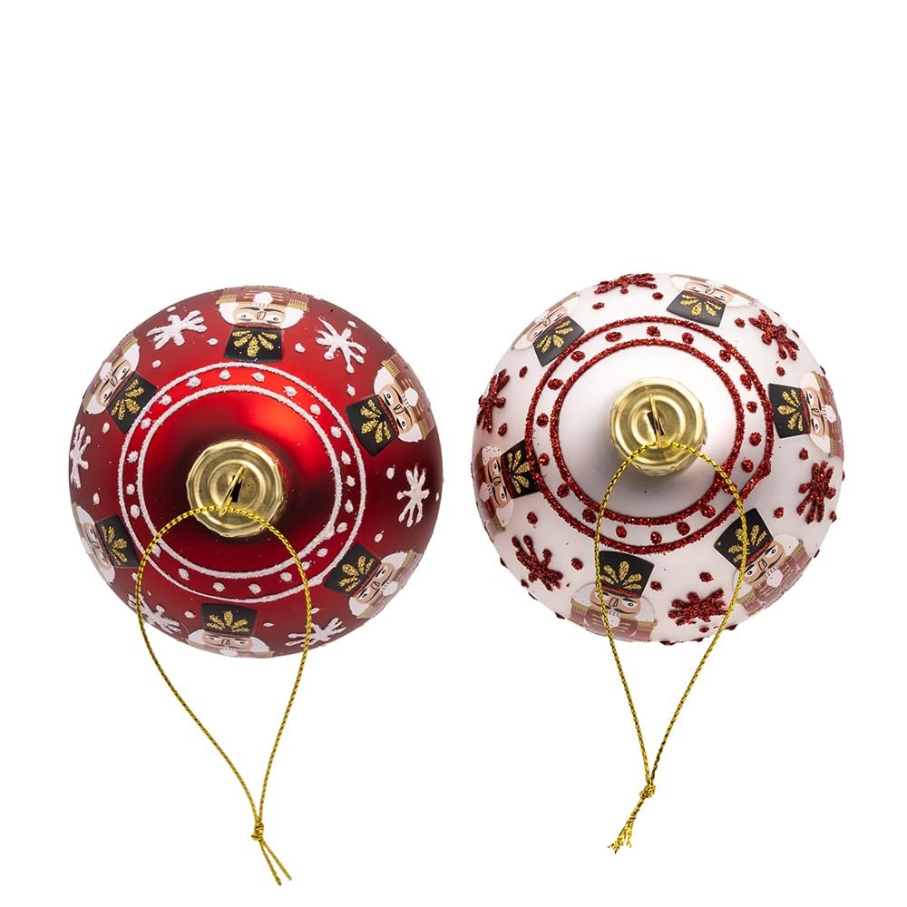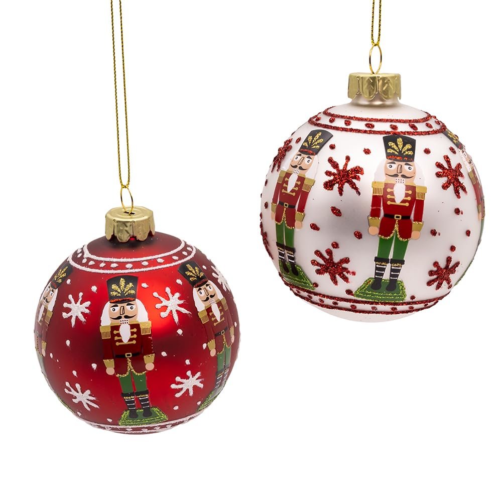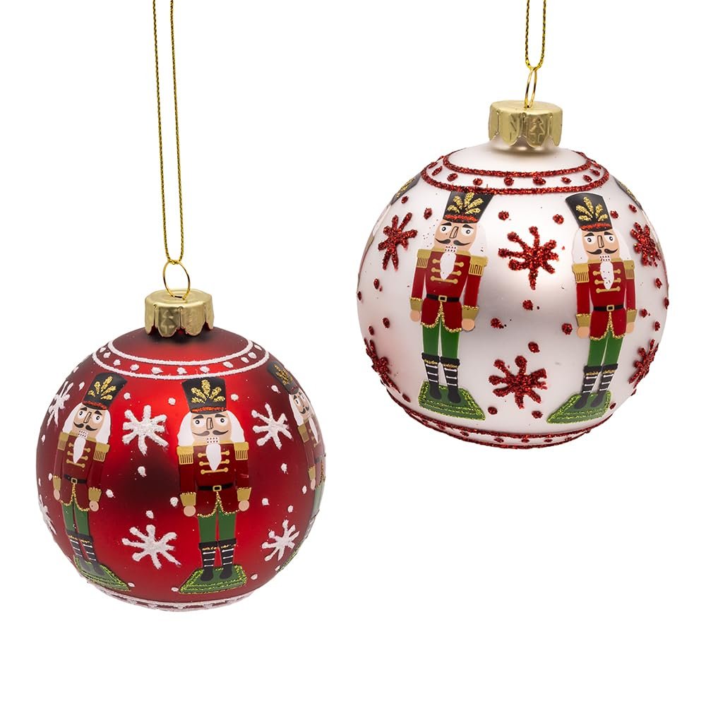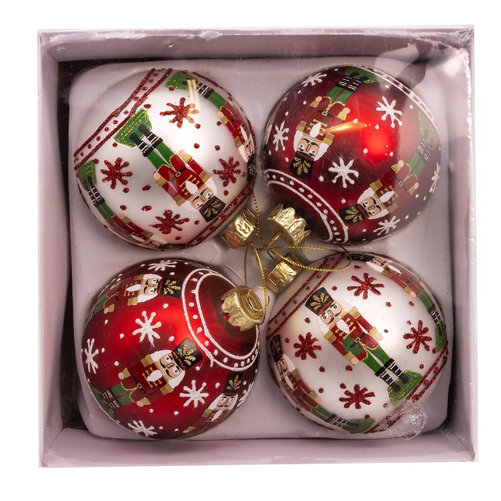 Kurt Adler 3-inch Glass Nutcracker Design Ball OrnamentsClassic Elegance: Kurt Adler's Glass Nutcracker 3 Inch Design Ball Ornaments are exquisite and classic, adding traditional elegance and charm to your Christmas tree or festive display.Beloved Nutcracker Design: These red and white glass ball ornaments feature a beloved nutcracker design, capturing the timeless symbol of the holiday season with finely detailed and beautifully rendered figures.Set of Four: Each set includes four ornaments, divided into two assorted colors, with the nutcracker design complemented by a red and white glittered snowflake pattern for a regal appearance.Timeless Tradition: Made of glass and of standard 60mm size, these ball ornaments are a perfect choice for decorating your Christmas tree, creating a sense of nostalgia and holiday tradition year after year.