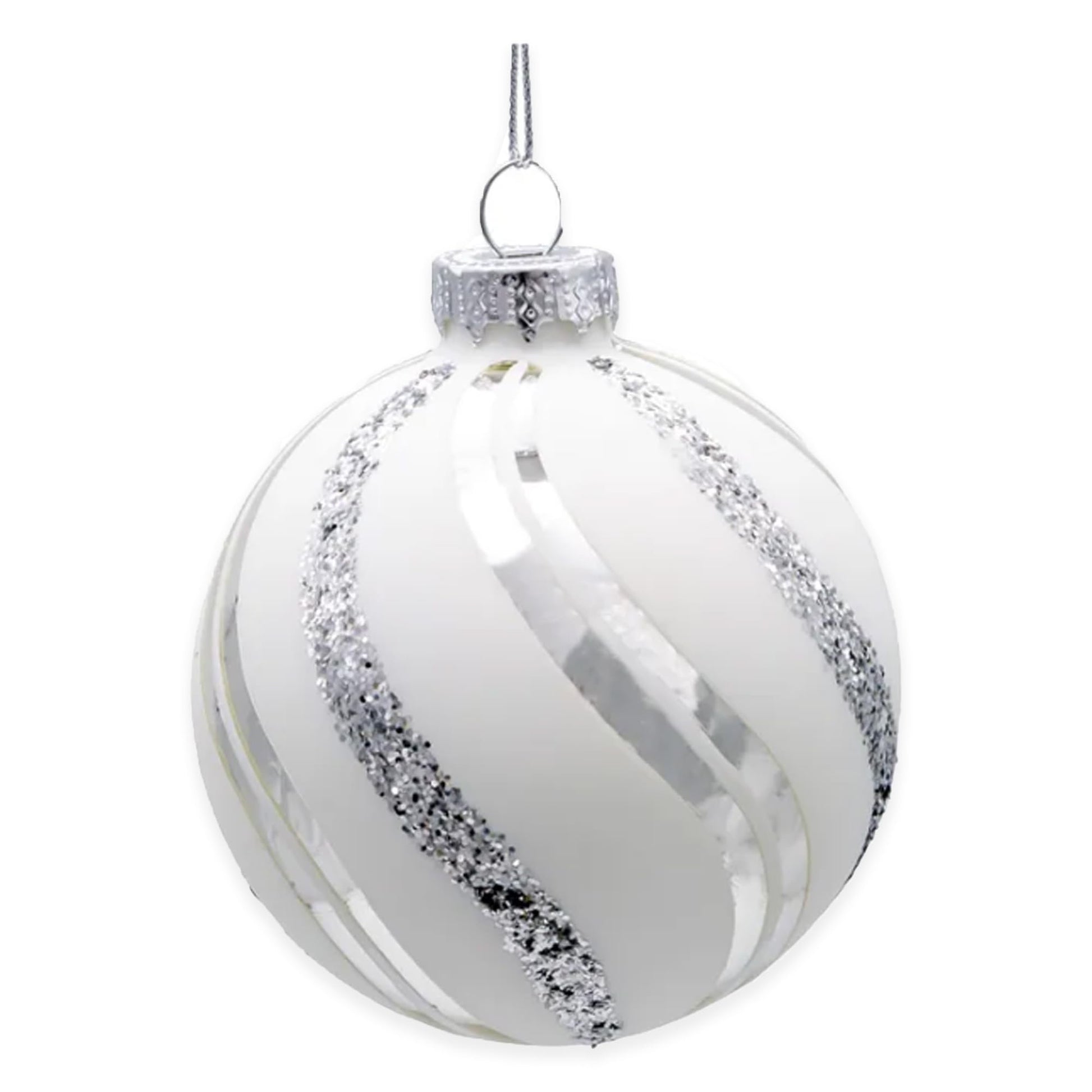 Kurt Adler 80MM Glass White Glittered Swirl 6-Piece Ball Ornament SetMade of glassMeasures 80mm (approximately 3.15")6-piece boxed setPretty white and silver glitter swirl