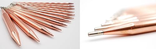 The "Driftwood" needles are made of smooth, hard birch with a beautiful blue finish that varies with the woodgrain, while the pairs match up — subtle but stunning. The tips are long and slender. The blue metal endcaps have the sizes etched into them in gold - not printed - and a smooth join to the cables. And the black cables are likewise smooth and flexible.The interchangeable set — which includes sizes US3-US15 — comes in a fold-up case with elastic that's perfectly matched to the size of each needle pair for a snug fit. The large pocket contains 5 cords (two 24", two 32", one 40"), 4 keys, 2 cord connectors and 8 stoppers.- made in India - set includes 12 needle pairs (US4 through US17) plus cords and tools in indigo waxed denim folding case with magnetic snap closure and interior pocketBlack Vegan Suede Case Gift Set5" cooper 12 pairs US sizes 3, 4, 5, 6, 7, 8, 9,10,10.5,11,13,155 Cords: 2 x 24" (60 cm), 2 x 32" (80 cm), 40" (100 cm)8 Stoppers. 4 Cord keys. 2 connectors