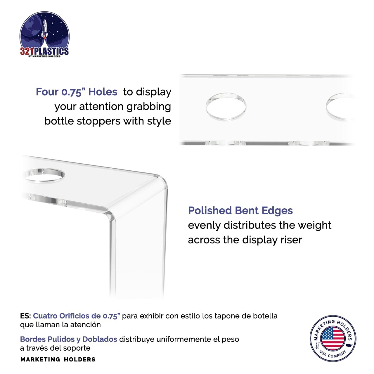 Marketing Holders 2 Pack Acrylic Wine Bottle Stopper Display Clear 4 Slot 9.75 Inch Wide by 2 Inch Deep Bar Organizing Riser with .75 Holes Countertop Pedestal StandClear Acrylic Bottle Stopper . One Piece, No Assembly Required.Overall Dimensions: 9.75"W x 2"D x 3"H. *All sizes are approximate Hole Dimensions: .75" Thickness: 0.118" Holds 4 Bottle stoppers Fits most bottle stoppers and pourers. Please measure to ensure correct fit. Perfect for use in retail stores, liquor stores, wine bars, novelty stores and specialty shops One piece, no assembly required Proudly made with premium high quality acrylicThis display gives your items a floating effect and creates a sturdy platform to showcase your collection of wine bottle stoppers. These premium lucite risers feature a stylish place to organize and display pourers in any retail shop.Place our sturdy display stands on tabletops, shelves or in showcase cabinets to provide an elevated visibility of items. Featuring space for up to several wine bottle stoppers, this lucite riser has an elegant design and the clear acrylic construction is durable, easy to clean, and matches any decor.These visual merchandising stands are designed to bring attention to a wide variety of items and catch the attention of potential customers. *All sizes are approximate *Fits most bottle stoppers and pourers. Please measure to ensure correct fit. *Tolerances: Thickness +/- 10%
