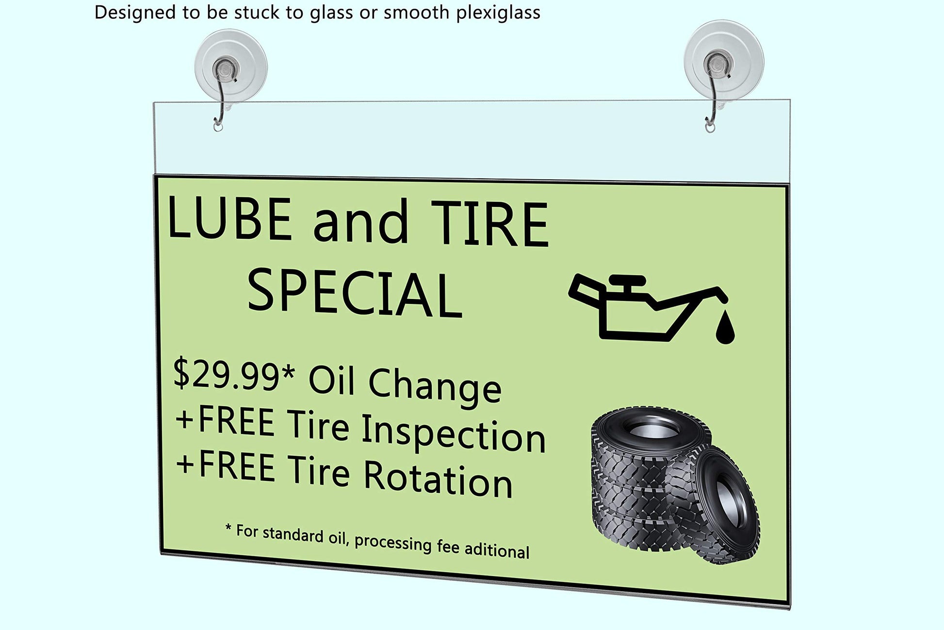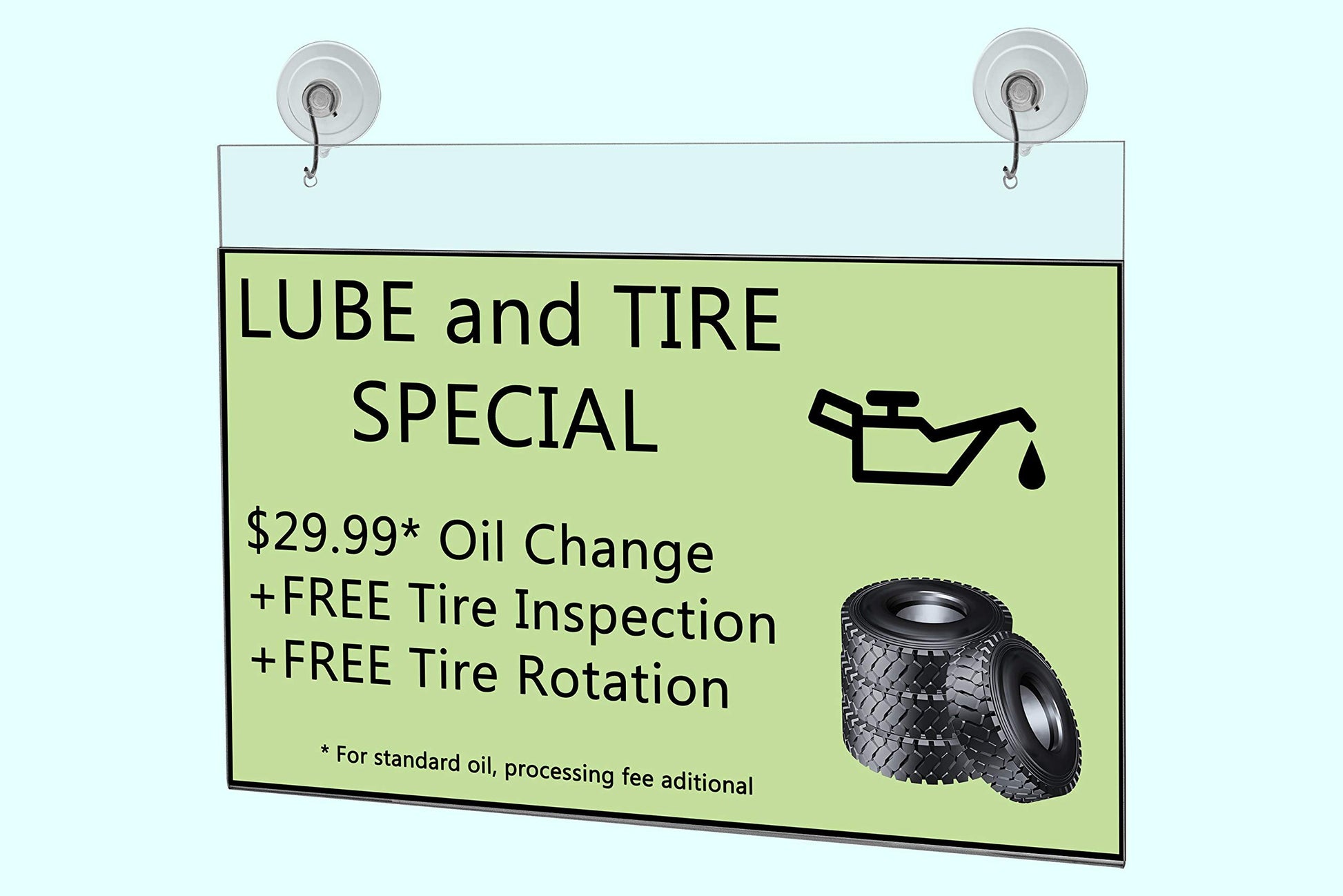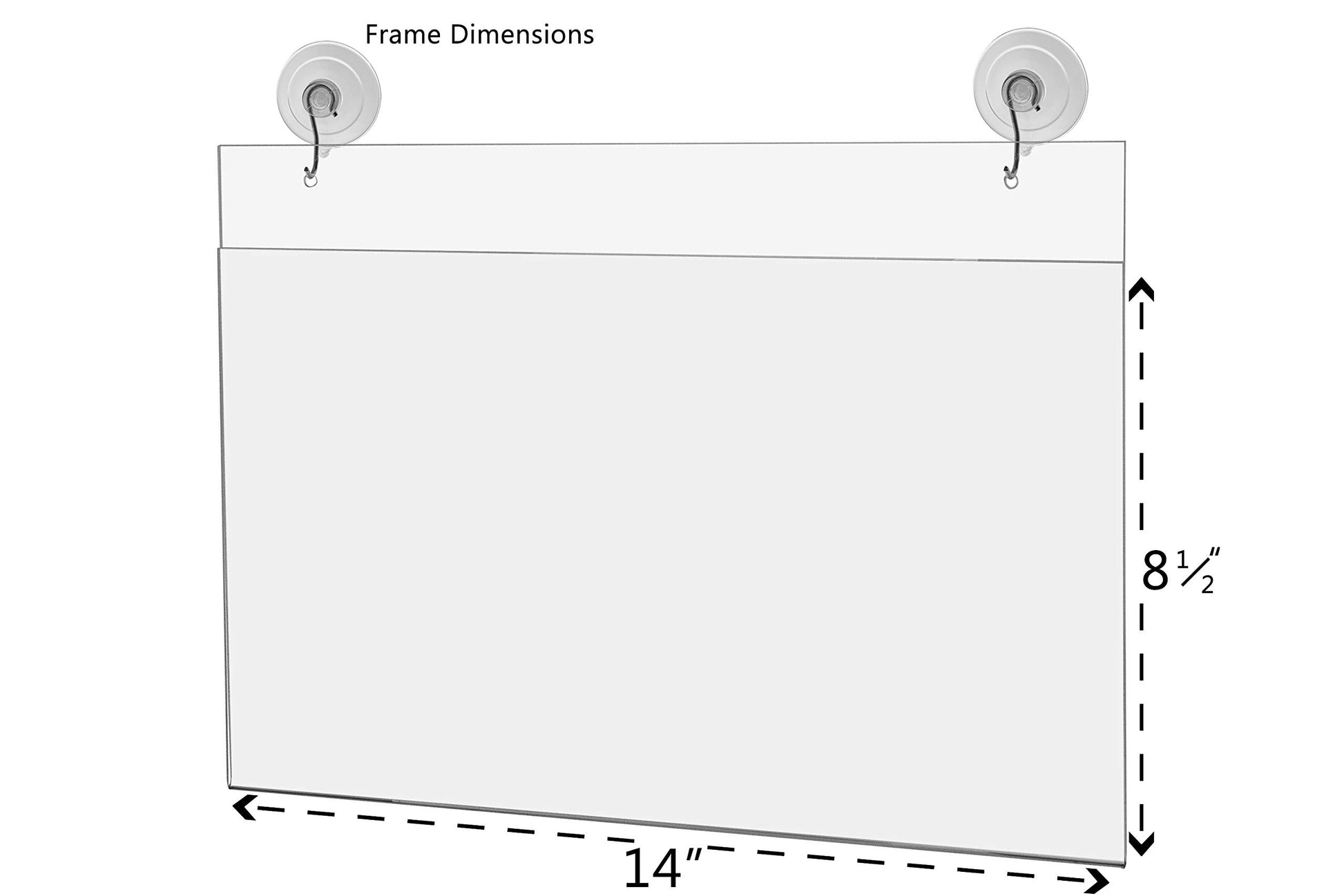 14"W x 8.5"H Window Mount Sign Holder Suction Cup with Hooks Product Features: Holds 14"W x 8.5"H literature. Overall Dimensions: 14"W x 11.75"H. Thickness: 0.080, 5/64", 2MM. *All sizes are approximate. Window or glass wall mounted sign display sleeve with 2 suction cups with hooks. Perfect hanging display solution for advertisements, notices, flyers, hours of operation and menus in restaurants, bars, retail stores, hotels and other business locations. Top or side loading makes sign changes quick and easy! Proudly made with premium high quality plastic. Marketing Holders clear acrylic sign holder is perfect for displaying signage or posting temporary notices for employees or customers in entryways, glass doors and windowed front desk enclosures. Use them to display signage for special events, sales, store or office hours. Ideal for use at retail stores, restaurants, financial institutions, business offices and more! Our sign holders come with 2 suction cup hooks making it easy to hang up and less of a hassle to install. Simply attach to glass windows and doors for double sided visibility so you can post different messages for incoming and outgoing traffic. Our suction cup sign holders are a more professional option to taped notices that lose their stick over time and leave a messy residue on glass walls, doors and windows when the event is over. Made of top quality acrylic, this clear sign holder has a high durability and great resistance. It has smooth edges and is transparent, protecting retail signage from dirt so that the text or image wouldn't be damaged but clear and readable. Our suction cups adhere best to smooth, non-porous surfaces such as tile, glass or metal. To ensure a firm bond, surfaces should be totally free of dirt and soap film before attaching the suction cups. *All sizes are approximate