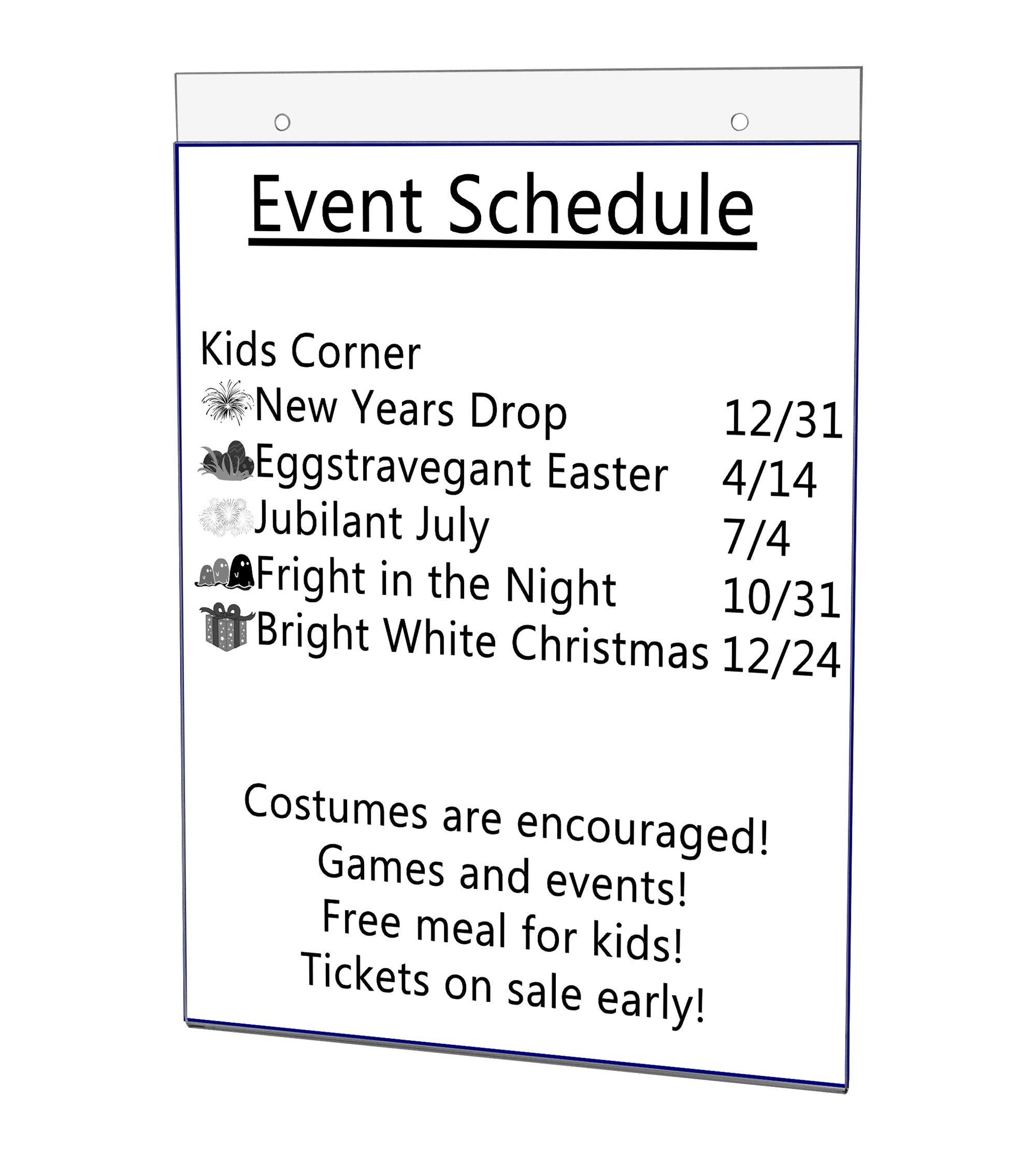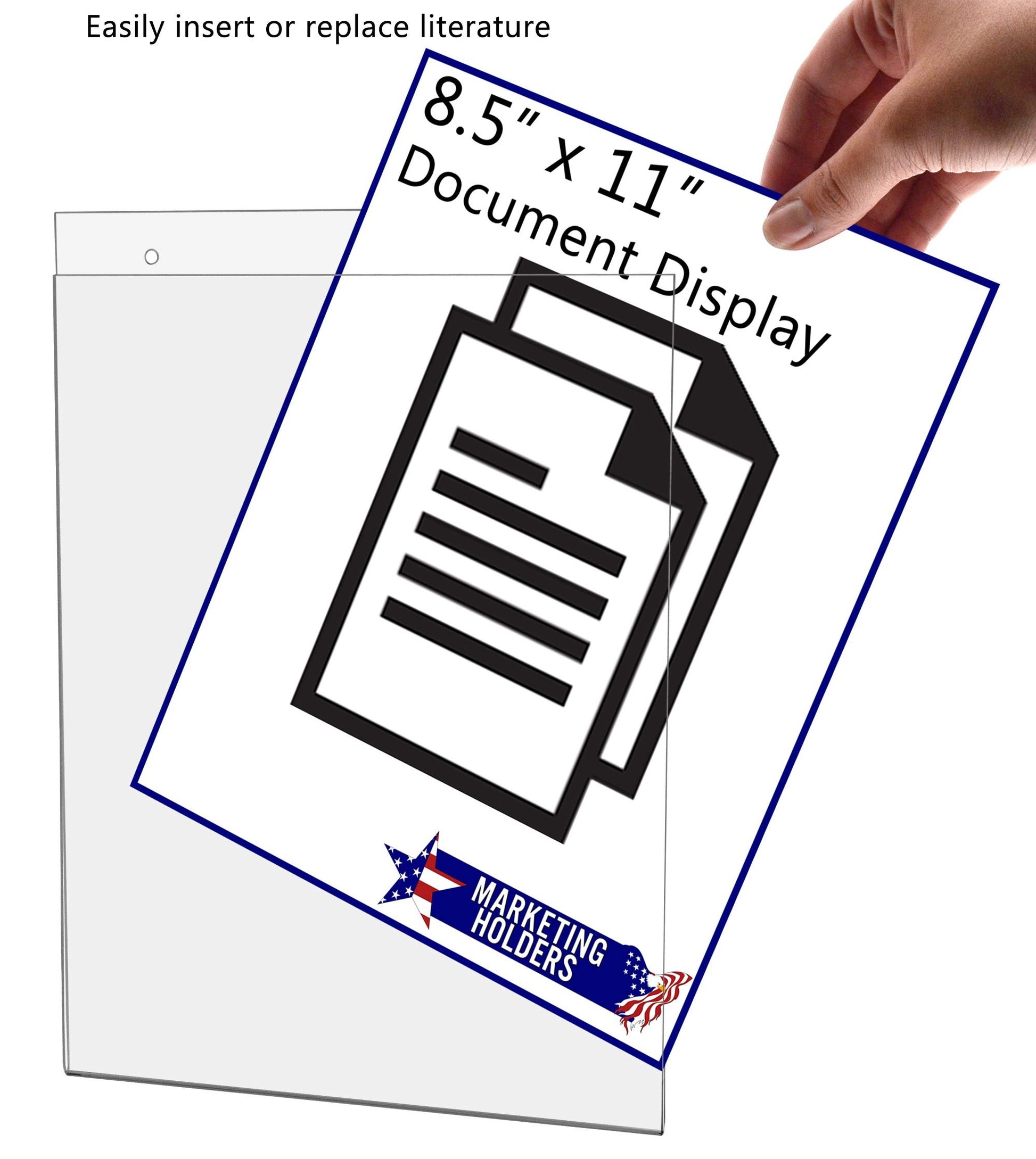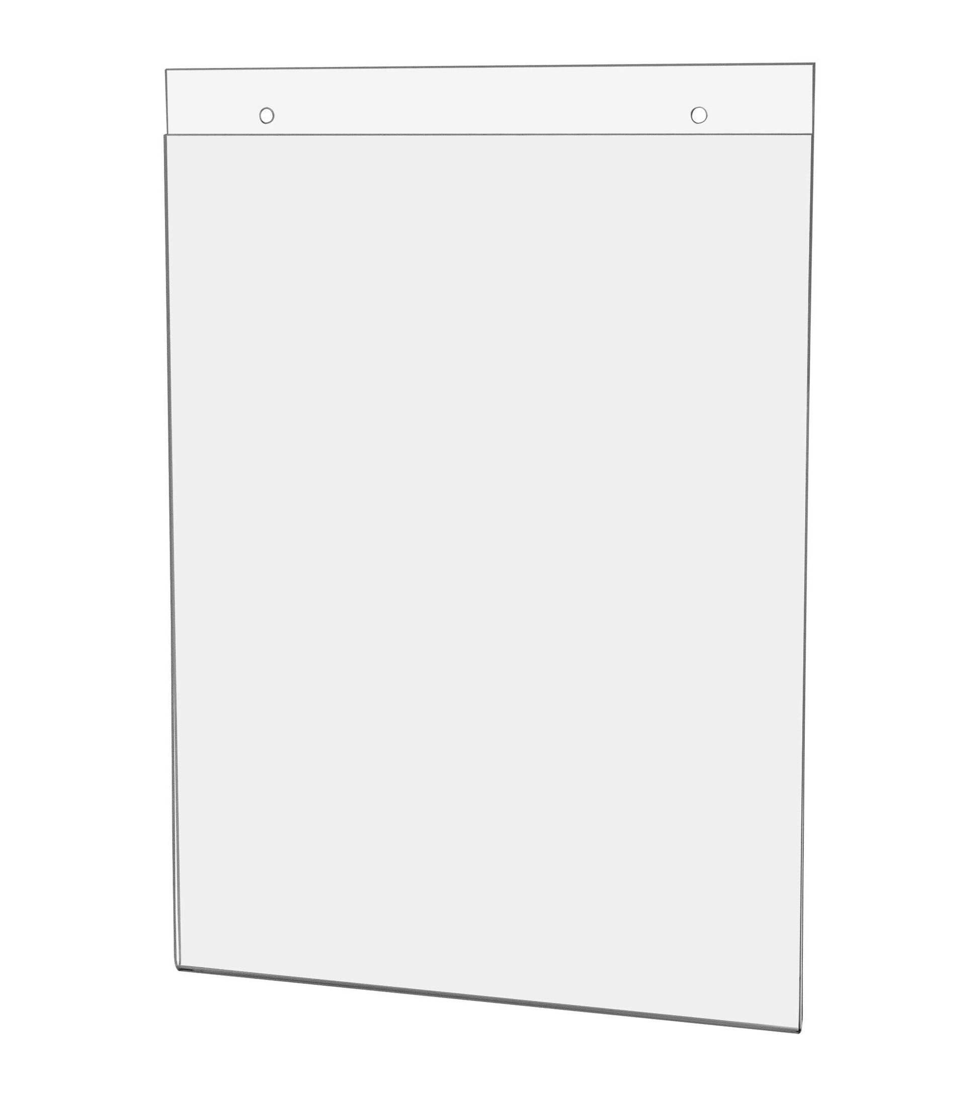 8.5"W x 11"H Wall Sign Holder with Hanging Hardware Product Features: Holds 8.5"W x 11"H literature Overall Dimensions: 8.5”W x 12”H Thickness: 0.080, 5/64", 2MM Wall mounted sign display sleeve with 2 pre-drilled mounting holes Perfect hanging display solution for advertisements, notices, flyers and hours of operation in restaurants, bars, retail stores, hotels and other business locations Top or side loading makes sign changes quick and easy! Proudly made with premium high quality plastic This hanging printed paper sign frame is perfect for displaying advertising, graphic images, printed media or to showcase documents that you would like to have on display in your retail shop, restaurant or office. Use these holders to inform your customers or clients about hours of operation, today's specials, advertisements or general informational notices. These are lightweight and durable which means they can be placed on walls in any business, hotel, doctors offices or medical facilities. These sign holders can be used practically anywhere, from trade shows to conventions or any other events. They are easy to use, simply slide your paper sign into the plastic sleeve or any other printed literature anywhere you want the general public and or office staff to see them. The light acrylic material is highly durable and reusable. These great see through frames ensure that your graphics stay clean and easily viewable without taking the attraction away from the sign itself. *All sizes are approximate **Hardware color may vary ***Under no circumstances is Marketing Holders responsible for any actions involving hanging products using self purchased or provided hardware. It is up to the purchaser to make sure they are using the hanging hardware correctly. We will also not be responsible for the product if it cracks during the hanging process or if it falls and breaks.8.5"W x 11"H Wall Sign Holder with Hanging Hardware Product Features: Holds 8.5"W x 11"H literature Overall Dimensions: 8.5”W x 12”H Thickness: 0.080, 5/64", 2MMWall mounted sign display sleeve with 2 pre-drilled mounting holes Perfect hanging display solution for advertisements, notices, flyers and hours of operation in restaurants, bars, retail stores, hotels and other business locations Top or side loading makes sign changes quick and easy! Proudly made with premium high quality plasticThis hanging printed paper sign frame is perfect for displaying advertising, graphic images, printed media or to showcase documents that you would like to have on display in your retail shop, restaurant or office. Use these holders to inform your customers or clients about hours of operation, today's specials, advertisements or general informational notices. These are lightweight and durable which means they can be placed on walls in any business, hotel, doctors offices or medical facilities.These sign holders can be used practically anywhere, from trade shows to conventions or any other events. They are easy to use, simply slide your paper sign into the plastic sleeve or any other printed literature anywhere you want the general public and or office staff to see them.The light acrylic material is highly durable and reusable. These great see through frames ensure that your graphics stay clean and easily viewable without taking the attraction away from the sign itself.*All sizes are approximate **Hardware color may vary ***Under no circumstances is Marketing Holders responsible for any actions involving hanging products using self purchased or provided hardware. It is up to the purchaser to make sure they are using the hanging hardware correctly. We will also not be responsible for the product if it cracks during the hanging process or if it falls and breaks.