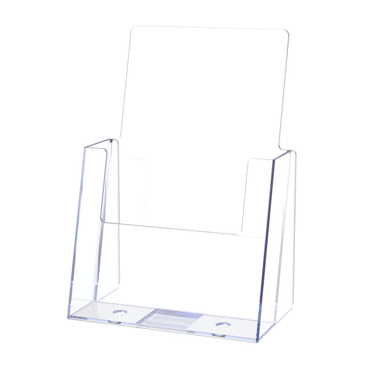 5.5"W Bifold Brochure Holder Countertop Booklet Display Stand Product Features: Holds 5.5”W literature Pocket Dimensions: 5.5”W x 1.5”D Overall Dimensions: 5.75”W x 3.5”D x 8.25”H Single pocket slant back countertop display stand for promotional literature, bifold brochures, pamphlets or booklets Proudly made with premium high quality plastic Marketing Holders versatile holder provides a simple yet effective tabletop display for promotional literature, bifold brochures, pamphlets or booklets. Use these holders to inform your customers or clients about hours of operation, today's specials or general informational notices. Our heavy duty advertising stands can be used on flat surfaces such as tops of a table, counter or desk near entrances and exits or reception areas so customers are prompted to take one when visiting your business. These printed media holders feature an angled-back design for optimal visibility and stability. Elegantly showcase attraction brochures while saving space and keeping areas looking professional, clutter free and organized. These display holders are ideal for placement in doctor offices, hotels, motels, amusement parks, government and business buildings, community centers, or travel agencies. This stand is durable for use at colleges and universities, convention centers, restaurants, sports stadiums, or hotels and motels across the USA. Perfect for use at recreational centers, parks and welcome centers. The organizers are made of durable plastic such as acrylic, plexiglass, lucite and PETG polycarbonate materials. This economical display stand is a great addition in high-traffic areas where you want to display and provide your promotional literature for the taking. This organizer is the perfect solution to display your advertising materials in a crowded or small location where there is limited space. *All sizes are approximateSingle pocket slant back countertop display stand for 5.5" wide promotional literature, bifold brochures, pamphlets or bookletsHolds 5.5”W literature. Pocket Dimensions: 5.5”W x 1.5”D. Overall Dimensions: 5.75”W x 3.5”D x 8.25”H *All sizes are approximateMarketing Holders versatile holder provides a simple yet effective tabletop display for promotional literature, bifold brochures, pamphlets or booklets. Use these holders to inform your customers or clients about hours of operation, today's specials or general informational notices. Our heavy duty advertising stands can be used on flat surfaces such as tops of a table, counter or desk near entrances and exits or reception areas so customers are prompted to take one when visiting your business.These printed media holders feature an angled-back design for optimal visibility and stability. Elegantly showcase attraction brochures while saving space and keeping areas looking professional, clutter free and organized. These display holders are ideal for placement in doctor offices, hotels, amusement parks, government and business buildings, community centers, or travel agencies.The organizers are made of durable plastic such as acrylic, plexiglass, lucite and PETG polycarbonate materials. This economical display stand is a great addition in high-traffic areas where you want to display and provide your promotional literature for the taking. This organizer is the perfect solution to display your advertising materials in a crowded or small location where there is limited space. *All sizes are approximate