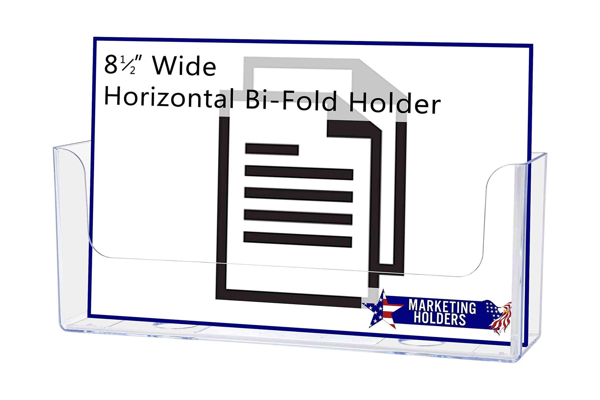 8.5"W Horizontal Bifold Brochure Display Wall or Counter Display Product Features: Holds 8.5”W literature Pocket Dimensions: 8.75”W x 2”D x 3.5"H. Overall Dimensions: 9”W x 2.25”D x 3.5”H. *All sizes are approximate Single pocket countertop or wall display for brochures, flyers and booklets Proudly made with high quality premium materials Marketing Holders literature holder provides a simple yet effective tabletop or hanging display for promotional literature, pamphlets, brochures and flyers. Many businesses find these marketing aids useful to spread the word about their upcoming promotions, products, services and events. These heavy duty stands can be used on flat surfaces such as tops of a table, counter or desk near entrances and exits or reception areas so customers are prompted to take one when visiting your business. This holder comes with 2 pre-drilled keyholes and is designed to easily hang on smooth surfaces if counter space is limited. Do you need new literature holders for a bank or credit union? These booklet racks are great for holding credit card applications as well as other bank rate information. These flyer displays are suitable for any location where information is exchanged or gathered. These display bins are ideal for placement in doctor offices, hotels, motels, amusement parks, government and business buildings, community centers, or travel agencies. Made of clear see through materials, this economical display stand is a great addition in high-traffic areas where you want to display and provide your promotional literature for the taking. *All sizes are approximate **Hanging Hardware Included ***Under no circumstances is Marketing Holders responsible for any actions involving hanging products using self purchased or provided hardware. It is up to the purchaser to make sure they are using the hanging hardware correctly. We will also not be responsible for the product if it cracks during the hanging process or if it falls and breaks.Holds 8.5”W literaturePocket Dimensions: 8.75”W x 2”D x 3.5"H. Overall Dimensions: 9”W x 2.25”D x 3.5”H. *All sizes are approximateSingle pocket countertop or wall display for brochures, flyers and booklets Proudly made with high quality premium materials Marketing Holders literature holder provides a simple yet effective tabletop or hanging display for promotional literature, pamphlets, brochures and flyers. Many businesses find these marketing aids useful to spread the word about their upcoming promotions, products, services and events.These heavy duty stands can be used on flat surfaces such as tops of a table, counter or desk near entrances and exits or reception areas so customers are prompted to take one when visiting your business. This holder comes with 2 pre-drilled keyholes and is designed to easily hang on smooth surfaces if counter space is limited. Do you need new literature holders for a bank or credit union? These booklet racks are great for holding credit card applications as well as other bank rate information.*All sizes are approximate **Hanging Hardware Included ***Under no circumstances is Marketing Holders responsible for any actions involving hanging products using self purchased or provided hardware. It is up to the purchaser to make sure they are using the hanging hardware correctly. We will also not be responsible for the product if it cracks during the hanging process or if it falls and breaks.