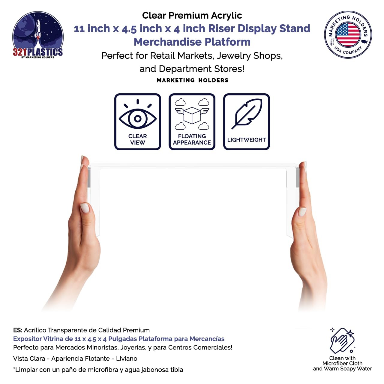 Marketing Holders Clear Acrylic Riser Display Stand 11" Wide x 4.5" Deep Merchandising Showcase Pedestal Retail Stores and Boutiques Throne Counter Small Figurines and Products Platform