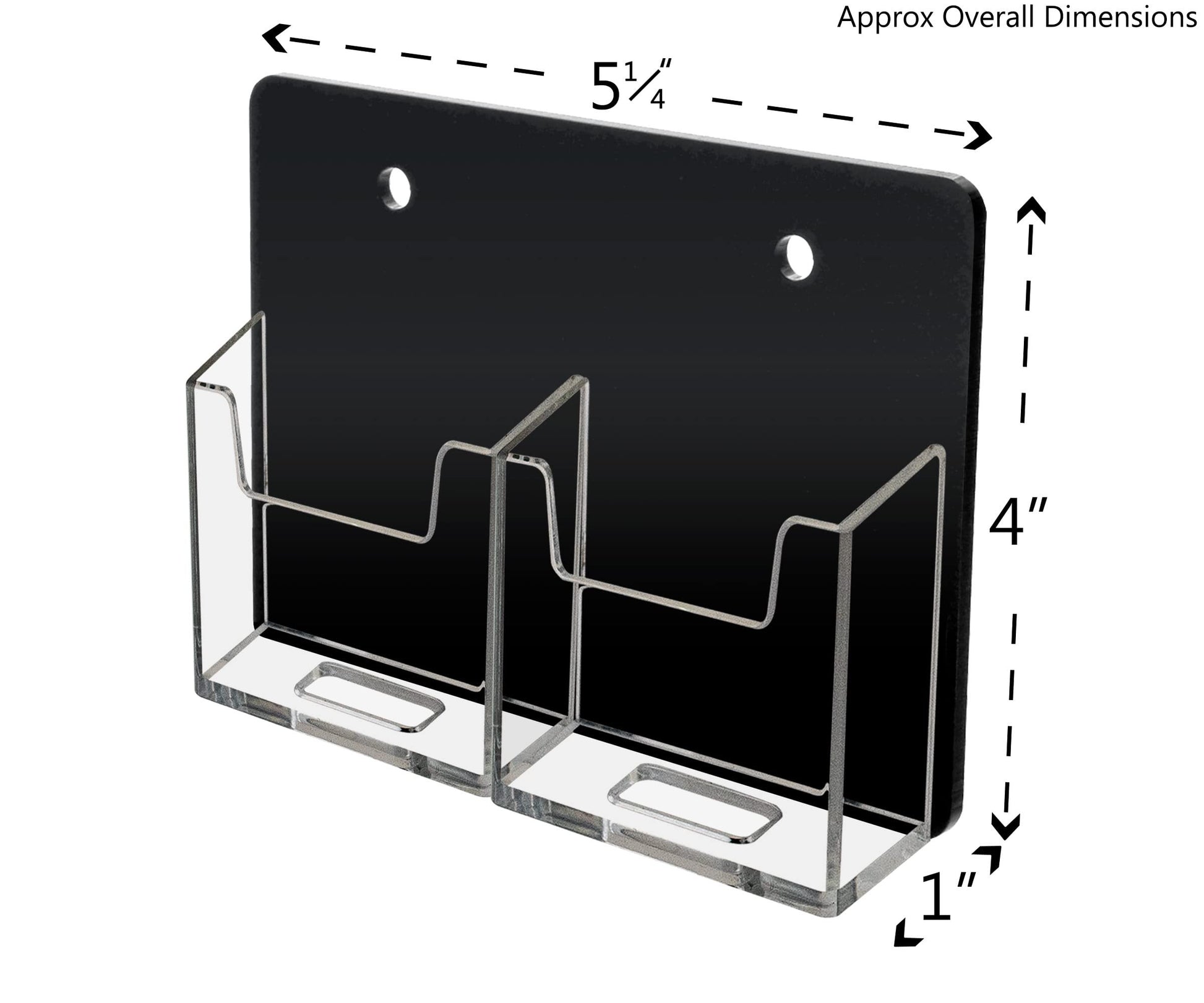 2 Pocket Wall Mount Holder for Vertically Designed Business Cards Product Features: Holds 2”W x 3.5”H vertically designed business cards, appointment, membership, gift or rewards cards Pocket Dimensions: 2.25”W x 1”D Overall Dimensions: 5.25”W x 4”H x 1”D. *All sizes are approximate Perfect space saving multi pocket wall mount display holder with 2 predrilled holes for hanging Proudly made in the USA with premium high quality plastic This two vertical pocket space saving wall mount business card holder provides a sturdy display for business, gift or appointment cards that complements any decor. These multi slot card racks are great space savers and help you keep counters free and clear of clutter. Store credit cards are often placed in the cases near the register or checkout stand to increase clientele and expand the customer base. Business card holders make spreading the word on the multiple sets of cards simple and easy to access and still appear professional. Just one holder to display two sets of printed material and help keep the clutter to a minimum. The card display rack has a design that makes it easy for clients and potential customers to take one. Each pocket can hold up to 30 standard business cards so you will not have to fill them that often. This card showcase display is made with high-quality premium acrylic plastic material and made right here in the USA. The wall card rack provides long-term durability in addition to keeping your 2 inch by 3.5 inch printed material neatly in the holder, and can be easily placed on any wall by exits or entrances. In addition to business information, the acrylic caddy can also be used to display other small media like Security Gate Code Cards, Membership Cards, Appointment Cards, VIP Cards, ID Badges, Security Cards or Gift Cards. Retail stores can use these versatile holders to display stickers for resale. *All sizes are approximateHolds 2”W x 3.5”H vertically designed business cards, appointment, membership, gift or rewards cards Pocket Dimensions: 2.25”W x 1”D Overall Dimensions: 5.25”W x 4”H x 1”D. *All sizes are approximate Perfect space saving multi pocket wall mount display holder with 2 predrilled holes for hanging Proudly made in the USA with premium high quality plasticThis two vertical pocket space saving wall mount business card holder provides a sturdy display for business, gift or appointment cards that complements any decor. These multi slot card racks are great space savers and help you keep counters free and clear of clutter. Store credit cards are often placed in the cases near the register or checkout stand to increase clientele and expand the customer base.Business card holders make spreading the word on the multiple sets of cards simple and easy to access and still appear professional. Just one holder to display two sets of printed material and help keep the clutter to a minimum. The card display rack has a design that makes it easy for clients and potential customers to take one. Each pocket can hold up to 30 standard business cards so you will not have to fill them that often.This card showcase display is made with high-quality premium acrylic plastic material and made right here in the USA. The wall card rack provides long-term durability in addition to keeping your 2 inch by 3.5 inch printed material neatly in the holder, and can be easily placed on any wall by exits or entrances.In addition to business information, the acrylic caddy can also be used to display other small media like Security Gate Code Cards, Membership Cards, Appointment Cards, VIP Cards, ID Badges, Security Cards or Gift Cards. Retail stores can use these versatile holders to display stickers for resale. *All sizes are approximate