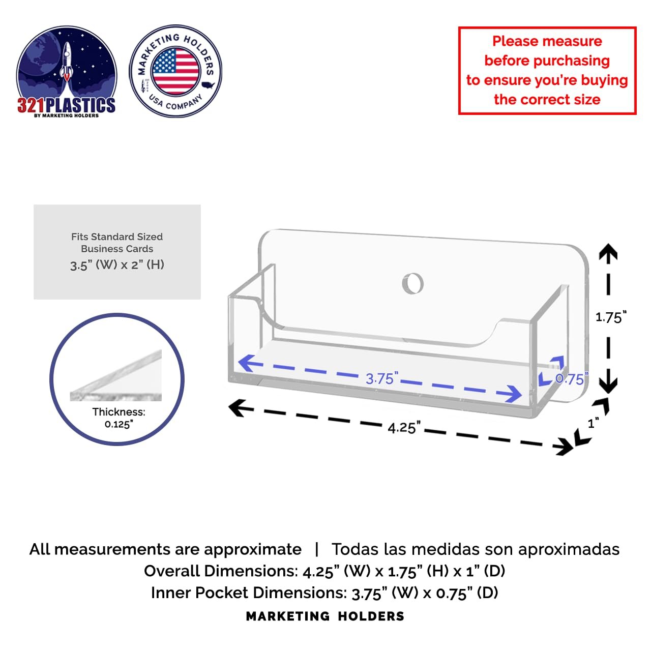 2 Pack Clear Business Card Holder Horizontal Single Pocket Wall Mount Product Features: Holds 3.5”W x 2”H standard sized business cards, appointment, membership, gift or rewards cards Pocket Capacity holds approximately 50 Standard Business cards and 25 Gift Cards Pocket Dimensions: 3.5”W x 2"H x .75”D Overall Dimensions: 4.25"W x 2"H x 1"D Hanging Hardware Included This Clear Acrylic Hanging Business Card Holder with Hardware, is a practical and visually appealing way to showcase business cards in offices, lobbies, or any place where a wall-mounted display is preferred. Material: transparent acrylic that provides a clear view of the business cards inside. Wall-Mount Design: Equipped with a pre-drilled hole and supplied hardware for easy and secure installation on walls, saving valuable counter space and maintaining a professional, clutter-free environment. Visibility: The clear acrylic ensures the business cards are easily visible and accessible to visitors, customers, or employees. Durable: The sturdy construction ensures durability, protecting the displayed cards and providing long-term use without compromising the holder's integrity. Professional Appearance: Its sleek and modern design complements various decor styles, adding a touch of professionalism to any space. This wall-mounted acrylic business card holder with a mounting hole and hardware is ideal for organizing and displaying business cards, ensuring they're easily visible and accessible. Its wall-mount design saves space while creating an organized and professional presentation of business information. Businesses, offices, reception areas, or service-oriented spaces often benefit from such holders as they contribute to a neat and inviting environment, allowing easy access to contact information and promotional material. All sizes are approximate.Hanging Clear Acrylic Single Pocket Business Card HolderHolds 3.5”W x 2”H standard sized business cards, appointment, membership, gift or rewards cards Pocket Capacity holds approximately 50 Standard Business cards and 25 Gift Cards Pocket Dimensions: 3.5”W x 2"H x .75”D Overall Dimensions: 4.25"W x 2"H x 1"D. All sizes are approximate. Hanging Hardware IncludedThis Acrylic Hanging Business Card Holder is a practical and visually appealing way to showcase business cards in offices, lobbies, or any place where a wall-mounted display is preferred. Constructed from high-quality, transparent acrylic that provides a clear view of the business cards inside. These are equipped with a pre-drilled hole and supplied hardware for easy and secure installation on walls, saving valuable counter space and maintaining a professional, clutter-free environment.Visibility: The clear acrylic ensures the business cards are easily visible and accessible to visitors, customers, or employees. Durable: The sturdy construction ensures durability, protecting the displayed cards and providing long-term use without compromising the holder's integrity. Professional Appearance: Its sleek and modern design complements various decor styles, adding a touch of professionalism to any space.This wall-mounted acrylic business card holder with a mounting hole and hardware is ideal for organizing and displaying business cards, ensuring they're easily visible and accessible. Its wall-mount design saves space while creating an organized and professional presentation of business information.Businesses, offices, reception areas, or service-oriented spaces often benefit from such holders as they contribute to a neat and inviting environment, allowing easy access to contact information and promotional material. All sizes are approximate.