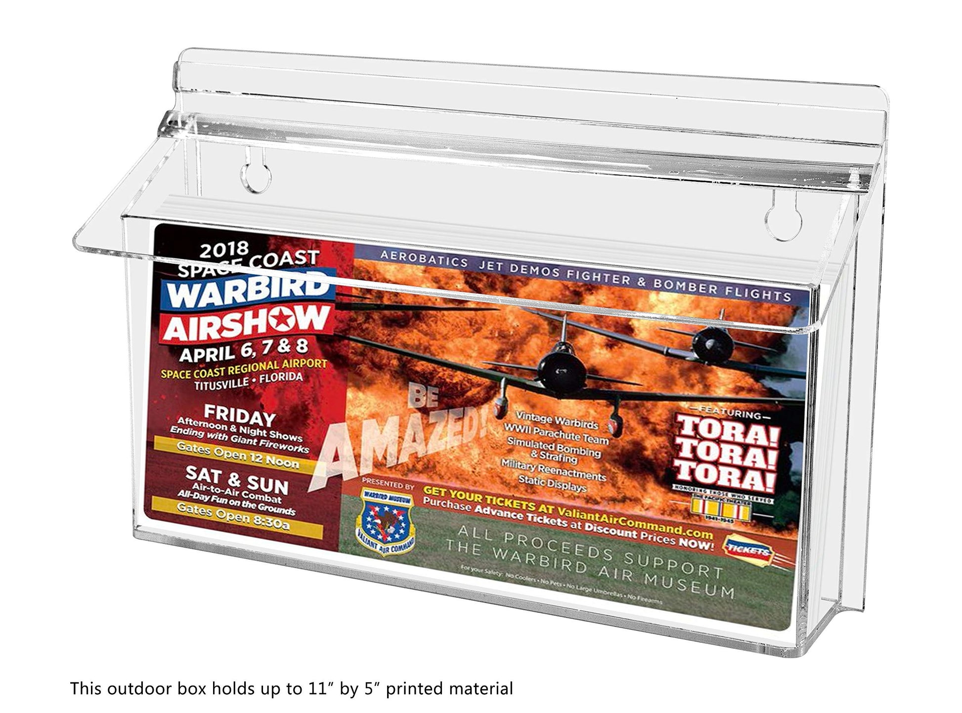11"W x 4"H Outdoor Horizontal Trifold Holder Wall Brochure Box with Lid Product Features: Wall Mount Outdoor Holder for 11"W x 4"H Literature Brochure Pocket Dimensions: 11"W x 2"D x 4.25"H Overall Dimensions: 11.75"W x 2.75"D x 6.75"H Thickness: 0.118", 1/8", 3MM Includes: Brochure holder with lid, 2 strips of peel and stick adhesive and one "Take One" sticker Proudly made with premium high quality acrylic Marketing Holders outdoor holders make sure you never miss out on potential customers. Simply mount your outdoor brochure box outside your brick and mortar business. These are perfect for menus in front of restaurants. Many other businesses keep their maps or business information pamphlets on the wall inside or outside their front door. This take one holder is super durable and has a clear front to show your literature. Mount it on walls, sign posts, or other solid surfaces and start advertising today. Designed with versatility in mind, the bin comes with 2 adhesive strips for simple wall installation or use the pre drilled holes to mount. All of our outdoor brochure holders come with a lid to help keep water and dirt from drifting in. These are not waterproof but durable to withstand the elements. These document boxes also help companies market themselves without any effort from the business owner. This rack is great for high-traffic areas such as strip malls, kiosk booths, welcome centers, city parks, boat docks, hotel fronts and real estate offices. Installing an outdoor holder helps convert curious shoppers into returning customers! Display information or terms & conditions for a neat and professional presentation. *All sizes are approximate **Item is water resistant, not waterproof ***Tolerances: Thickness +/- 10%11"W x 4"H Outdoor Horizontal Trifold Holder Wall Brochure Box with LidBrochure Pocket Dimensions: 11"W x 2"D x 4.25"H. Overall Dimensions: 11.75"W x 2.75"D x 6.75"H. Thickness: 0.118", 1/8", 3MM *All sizes are approximateMarketing Holders outdoor holders make sure you never miss out on potential customers. Simply mount your outdoor brochure box outside your brick and mortar business. These are perfect for menus in front of restaurants. Many other businesses keep their maps or business information pamphlets on the wall inside or outside their front door. This take one holder is super durable and has a clear front to show your literature.Mount it on walls, sign posts, or other solid surfaces and start advertising today. Designed with versatility in mind, the bin comes with 2 adhesive strips for simple wall installation or use the pre drilled holes to mount. All of our outdoor brochure holders come with a lid to help keep water and dirt from drifting in. These are not waterproof but durable to withstand the elements. These document boxes also help companies market themselves without any effort from the business owner.This rack is great for high-traffic areas such as strip malls, kiosk booths, welcome centers, city parks, boat docks, hotel fronts and real estate offices. Installing an outdoor holder helps convert curious shoppers into returning customers! Display information or terms & conditions for a neat and professional presentation. *All sizes are approximate **Item is water resistant, not waterproof ***Tolerances: Thickness +/- 10%