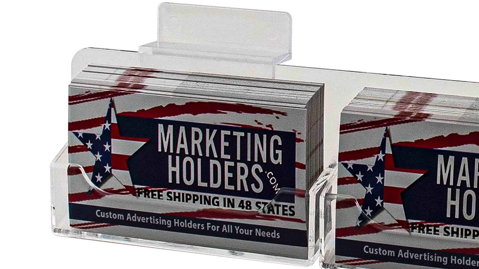 Marketing Holders Slatwall Business Card Holder 3 Pocket Organizer for Displaying 3.5" x 2" Contact Cards at Trade Shows and Expos Clear Acrylic Space Saving RackSlatwall 3 Pocket Business or Gift Card Holder Multi Pocket Organizer RackHolds 3.5”W x 2”H standard sized business cards, appointment, membership, gift or rewards cards. Pocket Dimensions: 3.5”W x 2"H x .75”D. Pocket Capacity: 50 standard business cards or 30 gift cards. Overall Dimensions: 12"W x 2.5"H x 1"D. All sizes are approximate.This multi pocket slatwall business card holder provides a sturdy display for business cards or gift cards that complements any decor. Looking for a convenient way to distribute contact information? Business card holders make spreading the word about the company's staff and professional services a breeze. Just one holder for contact info will ensure that calling cards are arranged neatly.The unique design of these products attaches to standard slatted wall fixtures without the need for adhesives, tools, or hardware. The card pocket has a design that makes it easy for employees and customers to take one. Slatwalls are a unique wall design that allows retailers to set up product displays in interchangeable and efficient ways. This is a wonderful marketing tool because as products and promotions change, the wall can be reorganized.The slotted wall card rack provides long-term durability in addition to keeping your 3.5 inch by 2 inch printed material neatly in the holder. In addition to business information, the acrylic holders can also be used to display other small media. These slatwall organizers ship preassembled. No assembly required! All sizes are approximate. These slatwall literature holders are designed for standard slatwalls. Will not fit on custom or metal slatwalls.