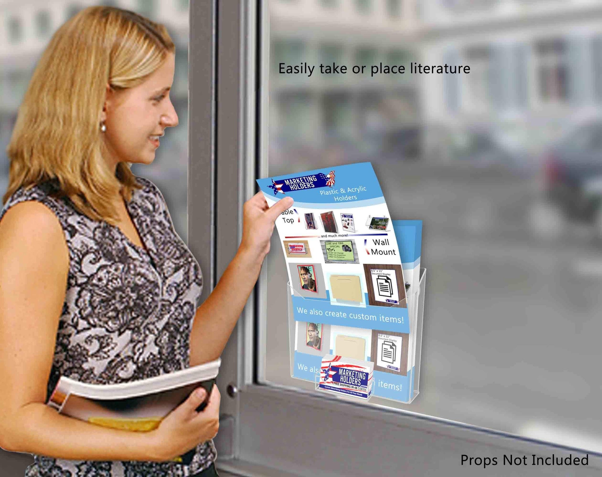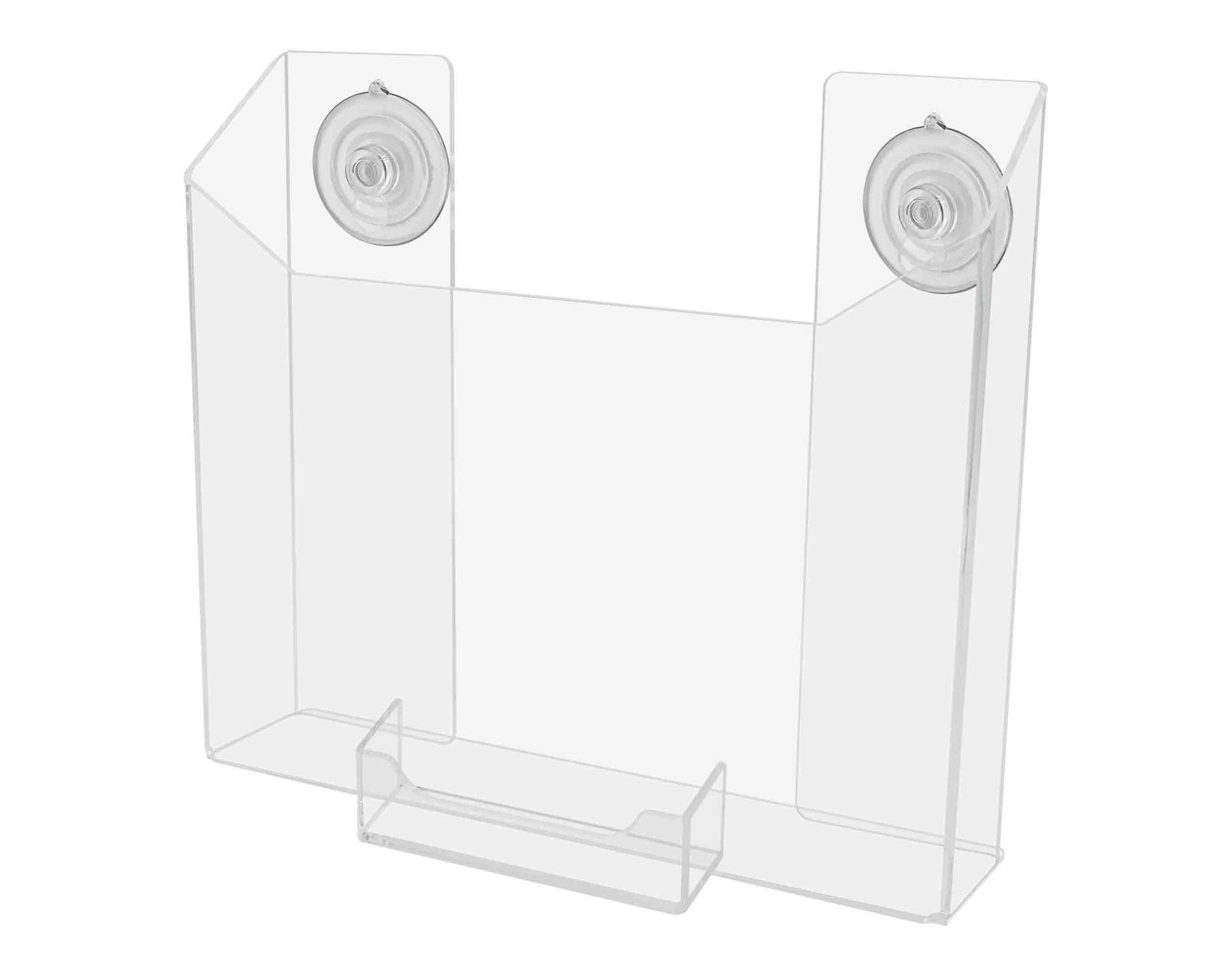 Suction Cup 8.5"W Catalog Holder with Card Pocket Product Features: Holds 8.5”W literature and standard 3.5"W business or gift cards. Business Card Pocket Dimensions: 3.5”W x .75”D x 2"H. Pocket Dimensions: 8.75"W x 1.5"D. Overall Dimensions: 9"W x 3.25"D x 8"H. Perfect multi pocket display solution with suction cups for flyers, catalogs, magazines and business cards. Proudly made with premium high quality plastics. Marketing Holders literature pocket provides a simple yet effective glass wall or window mount display for promotional literature, flyers, catalogs, magazines and business cards. Many businesses find these useful to spread the word about their upcoming promotions, products, services and events. In addition to flyers, the acrylic caddy has a business card pocket that can also be used to display other small media. These advertisement displays are suitable for any location where information is exchanged or gathered. These are ideal for placement in doctor offices, hotels, motels, amusement parks, government and business buildings, community centers, car washes or travel agencies. This holder is durable for use at colleges and universities, convention centers, restaurants, sports stadiums or welcome centers. Made of clear see through materials, this economical display is a great addition in high-traffic areas where you want to display and provide your promotional literature for the taking. This literature rack is the perfect solution to display your advertising materials in a crowded or small location where there is limited space. Installing a literature holder helps convert curious shoppers into returning customers! Display merchandise information or terms & conditions for a neat and professional presentation. Our suction cups adhere best to smooth, non-porous surfaces such as tile, glass or metal. To ensure a firm bond, surfaces should be totally free of dirt and soap film before attaching the suction cups.*All sizes are approximate