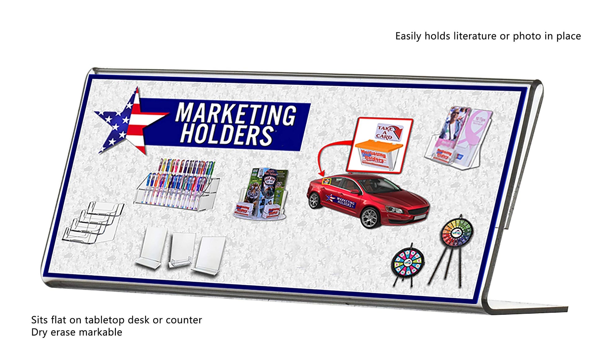 6”W x 2"H Sign Holder Slant Back Countertop Display Clear Side Load Product Features: Slant Back Countertop Display. Holds 6”W x 2”H literature. Overall Dimensions: 6”W x 1.5”D x 2”H.. Thickness: 0.060, 1.5MM, 1/16". Perfect display solution for business signs, titles, place settings, product information, nameplates and more. Display on desks, tables, and counters in restaurants, bars, retail stores, trade show booths, hotels and other business locations. Angled, slant back design provides stability and optimal view of signage. Side loading design allows display material to be easily inserted and removed. Proudly made in the USA with premium plastic. Tired of walking into professional business offices or restaurants and seeing paper signs taped to the wall? Don’t be that person, how tacky! This printed material sign holder is perfect for displaying graphic images, printed media, nameplates or to showcase documents that you would like to have on display in your retail shop or office. These are lightweight and portable which means they can be placed in the reception area of any business, hotel, doctors offices or medical facilities. These sign holders can be used practically anywhere, from trade shows to conventions or any other events. They are easy to use, simply slide your paper sign graphics flier or any other printed literature anywhere you want the general public and or office staff to see them. Our products can be and have been purchased for businesses like offices, retail stores, shopping centers, salons, medical facilities, doctors office, hospitals, clinics, malls, apartment buildings, colleges, schools, City Hall, government buildings, city buildings, stores, warehouses, home and work spaces. All sizes are approximate. Tolerances: Thickness varies by ten percent.Slant Back Countertop Display. Holds 6”W x 2”H literature.Overall Dimensions: 6”W x 1.5”D x 2”H.. Thickness: 0.060, 1.5MM, 1/16".Perfect display solution for business signs, titles, place settings, product information, nameplates and more. Display on desks, tables, and counters in restaurants, bars, retail stores, trade show booths, hotels and other business locations. Angled, slant back design provides stability and optimal view of signage. Side loading design allows display material to be easily inserted and removed. Proudly made in the USA with premium plastic.These sign holders can be used practically anywhere, from trade shows to conventions or any other events. They are easy to use, simply slide your paper sign graphics flier or any other printed literature anywhere you want the general public and or office staff to see them.Our products can be and have been purchased for businesses like offices, retail stores, shopping centers, salons, medical facilities, doctors office, hospitals, clinics, malls, apartment buildings, colleges, schools, City Hall, government buildings, city buildings, stores, warehouses, home and work spaces. All sizes are approximate. Tolerances: Thickness varies by ten percent.Just wipe them clean with a soft cloth and store until next time! These frames are made to use over again. The light acrylic material is highly durable. These frames ensure that your graphics stay clean and easily viewable. *All sizes are approximate **Tolerances: Thickness +/- 10%