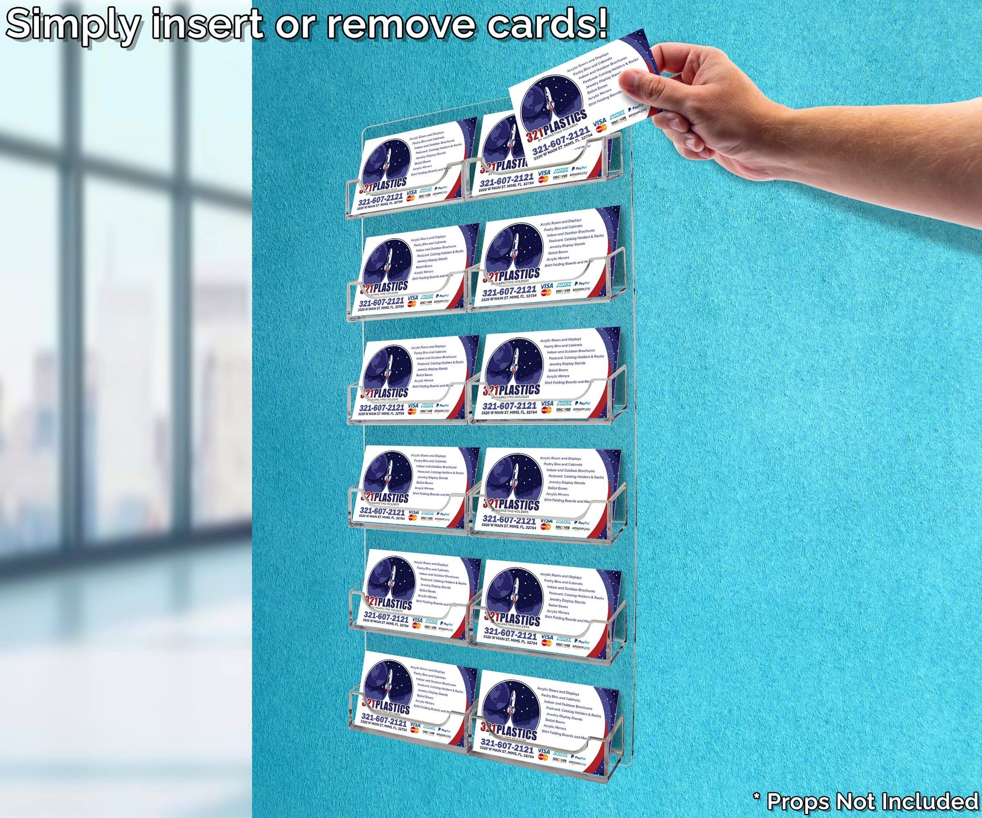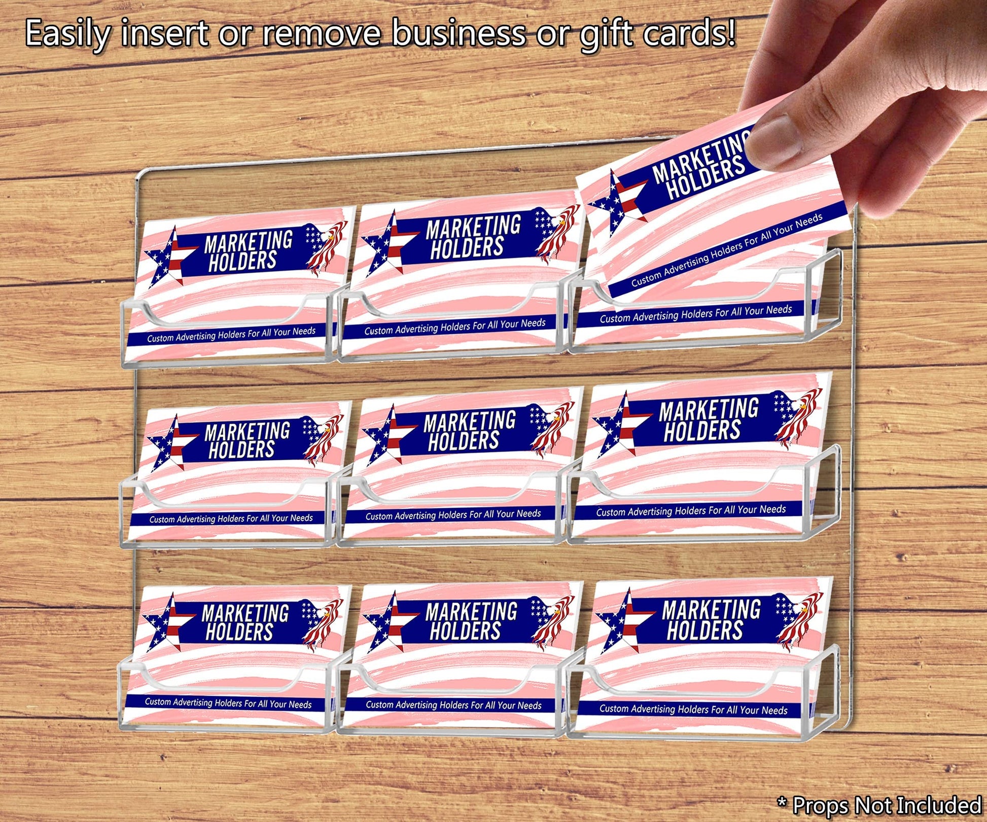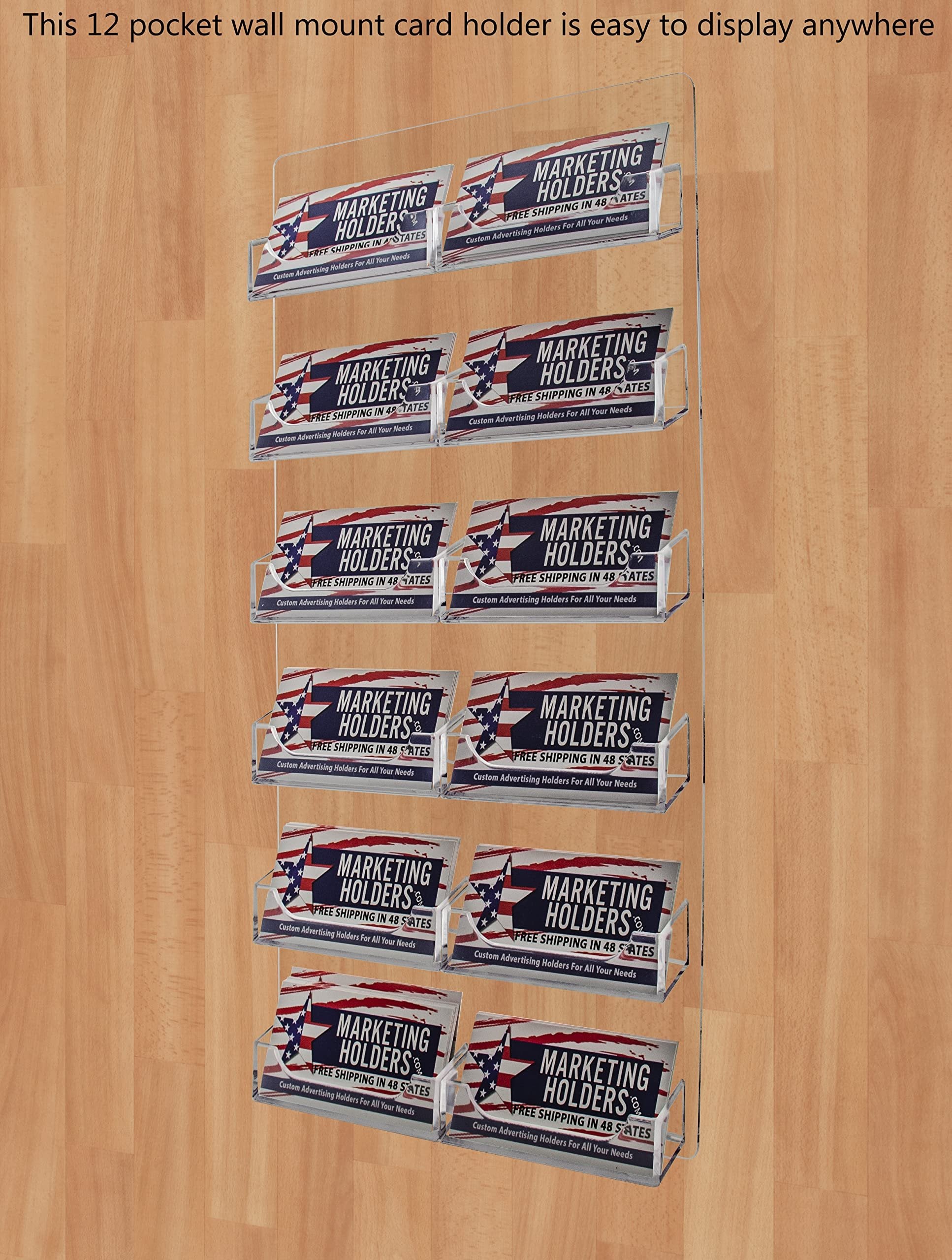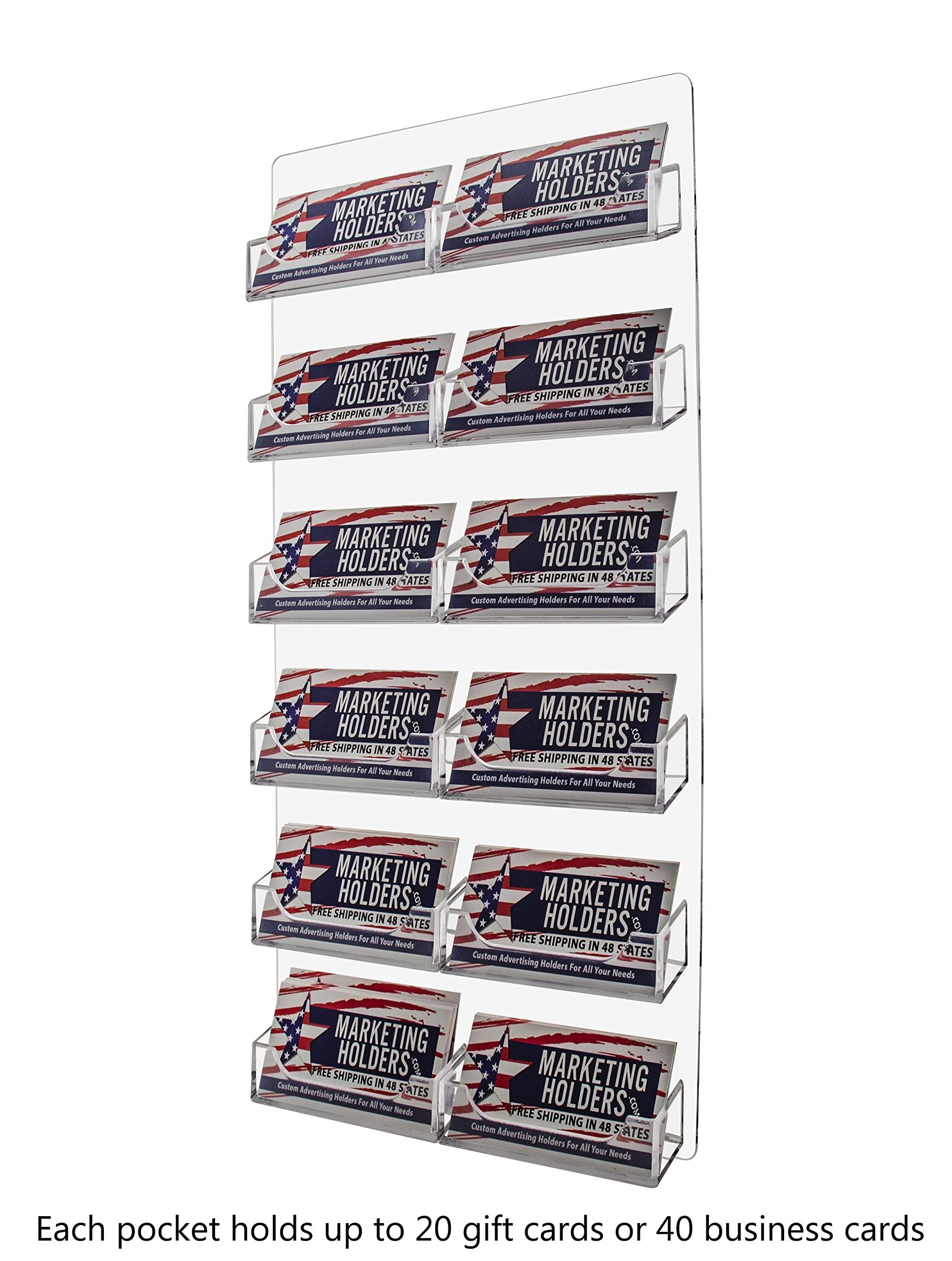 8 Pocket Gift Card Business Card Retail Holder Card Display Wall Mount Organizer Product Features: Holds 3.5”W x 2”H standard sized business cards, appointment, membership, gift or rewards cards Pocket Dimensions: 3.5”W x 2"H x .75”D Overall Dimensions:8.25”W x 10”H x 1"D. Pocket Capacity: 50 standard business cards or 30 gift cards Perfect space saving multi pocket wall mount display holder with pre drilled holes and hanging hardware This eight pocket space saving wall mount business card holder for large offices or retail locations. This holder provides a sturdy display for business, gift or appointment cards that complements any decor. These multi slot card racks are great space savers and help you keep counters free and clear of clutter. Looking for a convenient way to distribute multiple sets of cards in one convenient card organizer rack? Business card holders make spreading the word on the multiple sets of cards simple and easy to access and still appear professional. Just one holder to display multiple sets of printed material and help keep the clutter to a minimum. The appointment card display rack has a design that makes it easy for clients and potential customers to take one. Each pocket can hold up to 50 standard business cards so you will not have to fill them that often. This gift card showcase display is made with acrylic plastic material and made right here in the USA. The wall card rack provides long-term durability in addition to keeping your 3.5 inch by 2 inch printed material neatly in the holder, and can be easily placed on any wall by exits or entrances. We have designed these to display several sets of business cards and can be conveniently placed on walls or anywhere you want to leave your calling cards for the taking. These card holders come pre-drilled for easy hanging and includes hardware. All sizes are approximate. Under no circumstances are we responsible for any actions involving hanging products using self purchased or provided hard8 Pocket Clear Acrylic Wall Mount Business and Gift Card HolderHolds 3.5”W x 2”H standard sized business cards, appointment, membership, gift or rewards cards. Pocket Dimensions: 3.5”W x 2"H x .75”D. Overall Dimensions: 8.25”W x 10”H x 1"D. Pocket Capacity: 50 standard business cards or 30 gift cards. All sizes are approximate.This eight pocket space saving wall mount business card holder provides a sturdy display for business, gift or appointment cards that complements any decor. These multi slot card racks are great space savers and help you keep counters free and clear of clutter. Looking for a convenient way to distribute multiple sets of cards in one card organizer rack? Business card holders make spreading the word on the multiple sets of cards simple and easy to access and still appear professional.Just one holder to display multiple sets of printed material and help keep the clutter to a minimum. The appointment card display rack has a design that makes it easy for clients and potential customers to take one. Each pocket can hold up to 50 standard business cards so you will not have to fill them that often. This gift card showcase display is made with acrylic plastic material and made right here in the USA.The wall card rack provides long-term durability in addition to keeping your 3.5 inch by 2 inch printed material neatly in the holder, and can be easily placed on any wall by exits or entrances. We have designed these to display several sets of business cards and can be conveniently placed on walls or anywhere you want to leave your calling cards for the taking. These card holders come pre-drilled for easy hanging and includes hardware. All sizes are approximate.
