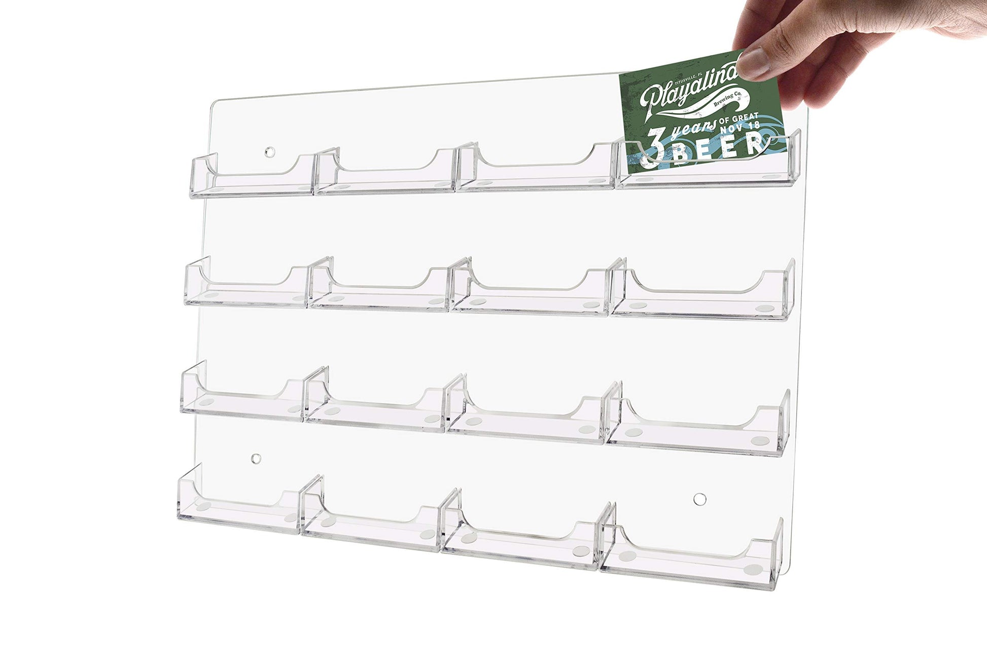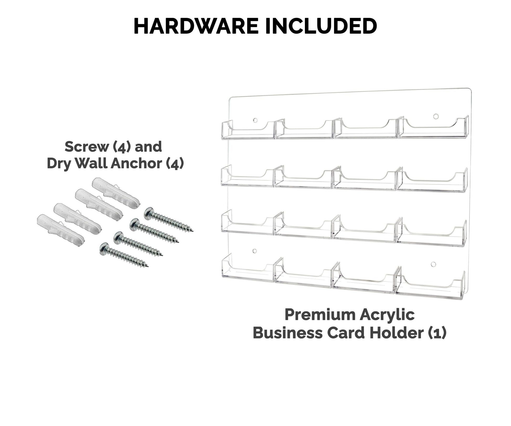 16 Pocket Gift Card Retail Holder Card Display Contact Wall Mount Product Features: Holds 3.5”W x 2”H standard sized business cards, appointment, membership, gift or rewards cards. Pocket Dimensions: 3.5”W x 2"H x .75”D. Pocket Capacity: 50 standard business cards or 30 gift cards. Overall Dimensions: 16”W x 10”H x 1"D. Perfect space saving multi pocket wall mount display holder with pre drilled holes and hanging hardware. This 16 pocket space saving wall mount business card holder for large offices or retail locations. This holder provides a sturdy display for business, gift or appointment cards that complements any decor. These multi slot card racks are great space savers and help you keep counters free and clear of clutter. Looking for a convenient way to distribute multiple sets of cards in one convenient card organizer rack? Business card holders make spreading the word on the multiple sets of cards simple and easy to access and still appear professional. Just one holder to display multiple sets of printed material and help keep the clutter to a minimum. The appointment card display rack has a design that makes it easy for clients and potential customers to take one. Each pocket can hold up to 50 standard business cards so you will not have to fill them that often. This gift card showcase display is made with acrylic plastic material and made right here in the USA. The wall card rack provides long-term durability in addition to keeping your 3.5 inch by 2 inch printed material neatly in the holder, and can be easily placed on any wall by exits or entrances. We have designed these to display several sets of business cards and can be conveniently placed on walls or anywhere you want to leave your calling cards for the taking. These card holders come pre-drilled for easy hanging and includes hardware. All sizes are approximate. Under no circumstances are we responsible for any actions involving hanging products using self purchased or provided hardware.16 Pocket Clear Acrylic Wall Mount Business and Gift Card HolderHolds 3.5”W x 2”H standard sized business cards, appointment, membership, gift or rewards cards. Pocket Dimensions: 3.5”W x 2"H x .75”D. Pocket Capacity: 50 standard business cards or 30 gift cards. Overall Dimensions: 16”W x 10”H x 1"D. All sizes are approximate.This sixteen pocket space saving wall mount business card holder provides a sturdy display for business, gift or appointment cards that complements any decor. These multi slot card racks are great space savers and help you keep counters free and clear of clutter. Looking for a convenient way to distribute multiple sets of cards in one card organizer rack? Business card holders make spreading the word on the multiple sets of cards simple and easy to access and still appear professional.Just one holder to display multiple sets of printed material and help keep the clutter to a minimum. The appointment card display rack has a design that makes it easy for clients and potential customers to take one. Each pocket can hold up to 50 standard business cards so you will not have to fill them that often. This gift card showcase display is made with acrylic plastic material and made right here in the USA.The wall card rack provides long-term durability in addition to keeping your 3.5 inch by 2 inch printed material neatly in the holder, and can be easily placed on any wall by exits or entrances. We have designed these to display several sets of business cards and can be conveniently placed on walls or anywhere you want to leave your calling cards for the taking. These card holders come pre-drilled for easy hanging and includes hardware. All sizes are approximate.