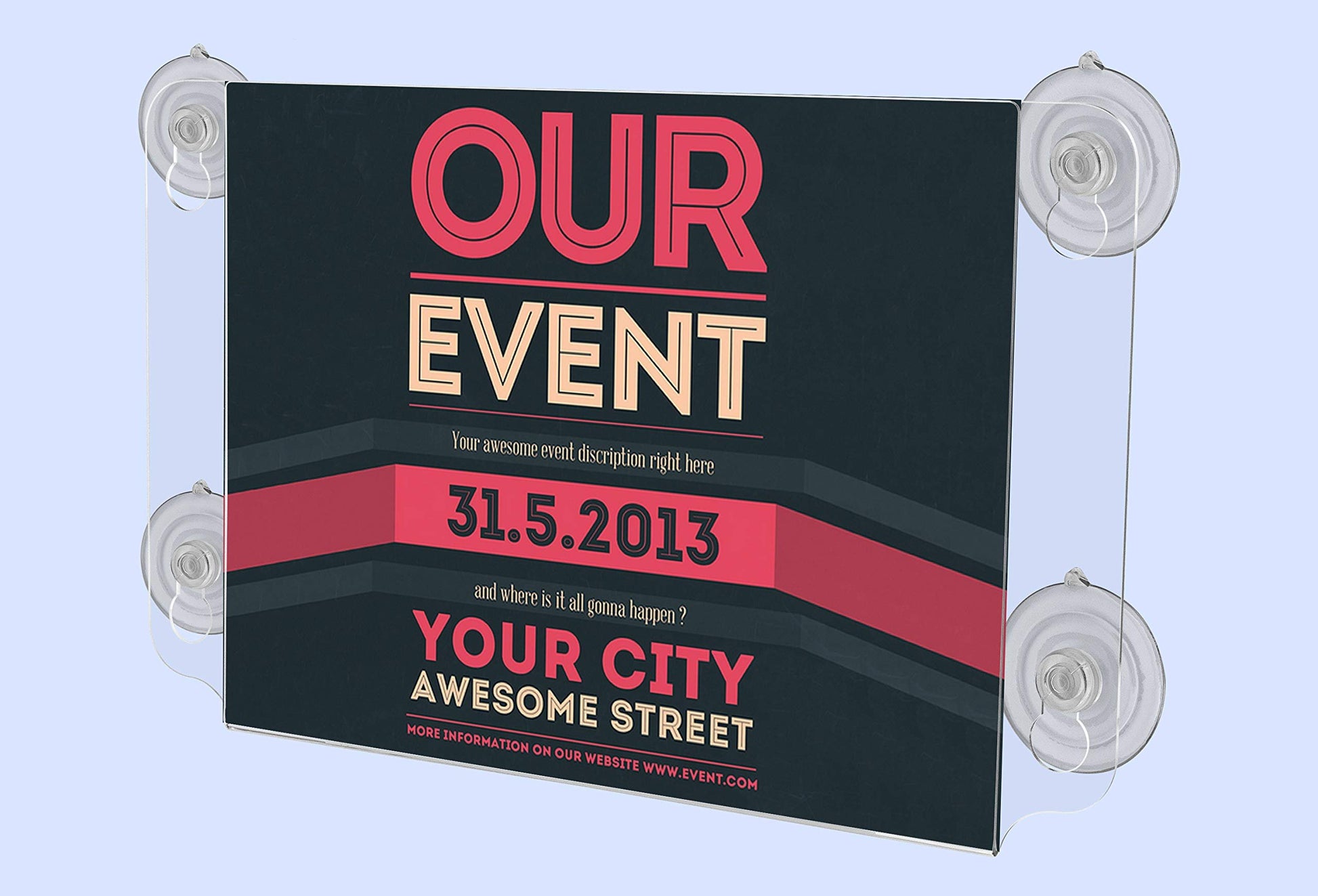11"W x 8.5"H Window Sign Holder Double Sided with Suction Cups Product Features: Holds 11"W x 8.5"H literature Overall Dimensions: 13.5"W x 8.5"H Top loading window or glass mount sign holder with suction cups Proudly made with premium high quality materials Our clear acrylic sign holder is perfect for posting temporary notices for employees or customers in entryways, glass doors and windowed front desk enclosures. Use them to display signage for special events, pricing labels, sales, store or office hours. Ideal for use at retail stores, restaurants, financial institutions, business offices and more! These sign holders come with 4 suction cups making it easy to hang up and less of a hassle to install. Simply attach to glass windows and doors for double sided visibility so you can post different messages for incoming and outgoing traffic. The suction cup sign holders are a more professional option to taped notices that lose their stick over time and leave a messy residue on glass walls, doors and windows when the event is over. Made of top quality acrylic, this clear sign holder has a high durability and great resistance. It has smooth edges and is transparent, protecting retail signage from dirt so that the text or image wouldn't be damaged but clear and readable. Easy to use, easy to clean! Each holder has an opening to easily insert your graphic image or message into the sign holder to keep it protected from the elements. Done with them for now? Just wipe them clean with a soft cloth and store until next time! Our suction cups adhere best to smooth, nonporous surfaces such as tile, glass or metal. To ensure a firm bond, surfaces should be totally free of dirt and soap film before attaching the suction cups. All sizes are approximate11"W x 8.5"H Window Sign Holder Double Sided with Suction Cups Product Features: Holds 11"W x 8.5"H literature Overall Dimensions: 13.5"W x 8.5"HTop loading window or glass mount sign holder with suction cups Proudly made with premium high quality materialsOur clear acrylic sign holder is perfect for posting temporary notices for employees or customers in entryways, glass doors and windowed front desk enclosures. Use them to display signage for special events, pricing labels, sales, store or office hours. Ideal for use at retail stores, restaurants, financial institutions, business offices and more!These sign holders come with 4 suction cups making it easy to hang up and less of a hassle to install. Simply attach to glass windows and doors for double sided visibility so you can post different messages for incoming and outgoing traffic. The suction cup sign holders are a more professional option to taped notices that lose their stick over time and leave a messy residue on glass walls, doors and windows when the event is over.Made of top quality acrylic, this clear sign holder has a high durability and great resistance. It has smooth edges and is transparent, protecting retail signage from dirt so that the text or image wouldn't be damaged but clear and readable. Easy to use, easy to clean! Each holder has an opening to easily insert your graphic image or message into the sign holder to keep it protected from the elements.Done with them for now? Just wipe them clean with a soft cloth and store until next time! Our suction cups adhere best to smooth, nonporous surfaces such as tile, glass or metal. To ensure a firm bond, surfaces should be totally free of dirt and soap film before attaching the suction cups.All sizes are approximate
