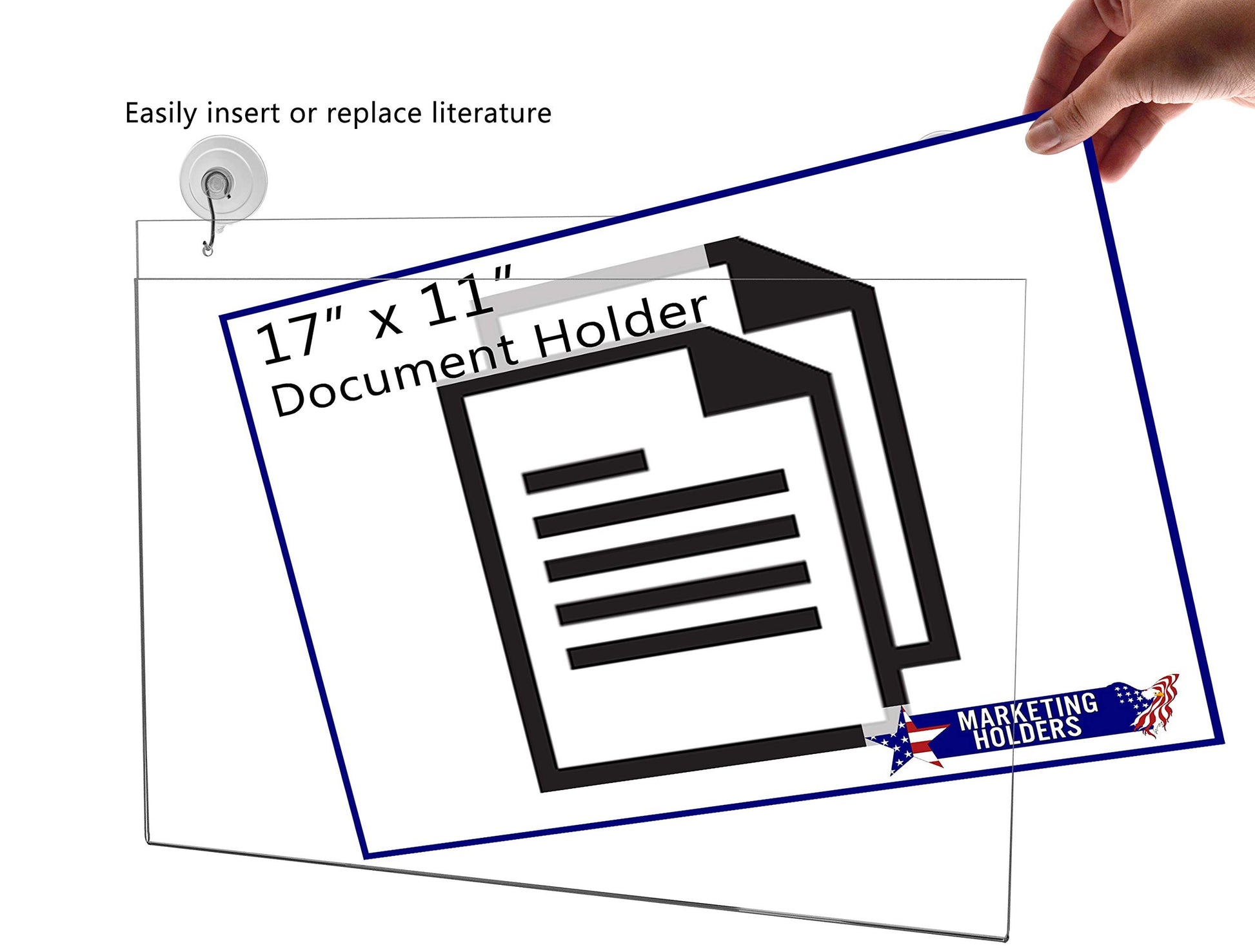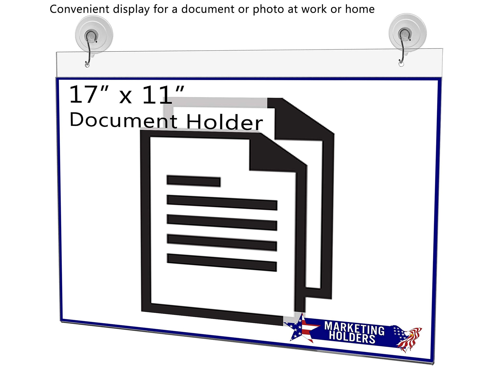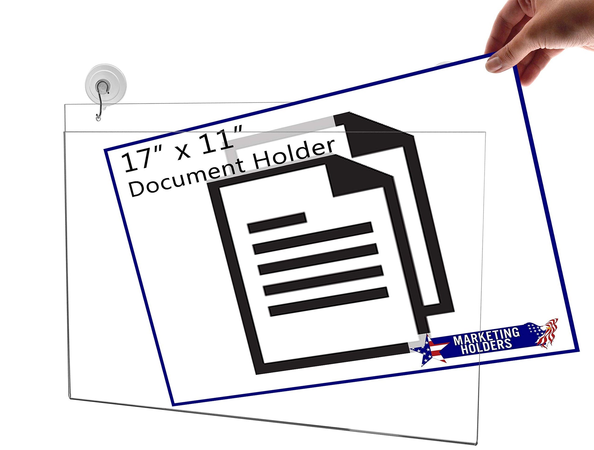 Marketing Holders Window Sign Holder 17" x 11" with 2 Predrilled Holes and Suction Cups with Hooks for Seating Charts and Directional Signs in Arenas and Theaters Clear Acrylic Horizontal Sleeve17"W x 11"H Window Mount Sign Holder Suction Cup with Hooks Product Features: Holds 17"W x 11"H literature Overall Dimensions: 17"W x 13"H Thickness: 0.080, 5/64", 2MMWindow or glass wall mounted sign display sleeve with 2 suction cups with hooks Perfect hanging display solution for graphic posters, itineraries, event schedules and general information at trade shows, in gift shops, department and retail stores, libraries and other business locations. Top or side loading makes sign changes quick and easy! Proudly made with premium high quality plasticMarketing Holders clear acrylic sign holder is perfect for displaying signage or posting temporary notices for employees or customers in entryways, glass doors and windowed front desk enclosures. Use them to display signage for special events, sales, store or office hours. Ideal for use at retail stores, restaurants, financial institutions, business offices and more!Our sign holders come with 2 suction cup hooks making it easy to hang up and less of a hassle to install. Simply attach to glass windows and doors for double sided visibility so you can post different messages for incoming and outgoing traffic. Our suction cup sign holders are a more professional option to taped notices that lose their stick over time and leave a messy residue on glass walls, doors and windows when the event is over.Made of top quality acrylic, this clear sign holder has a high durability and great resistance. It has smooth edges and is transparent, protecting retail signage from dirt so that the text or image would be clear and readable. Easy to use, easy to clean – Each holder has an opening to easily insert your graphic image or message into the sign holder to keep it protected from the elements.Our suction cups adhere best to smooth, non-porous surfaces such as tile, glass or metal. To ensure a firm bond, surfaces should be totally free of dirt and soap film before attaching the suction cups. *All sizes are approximate