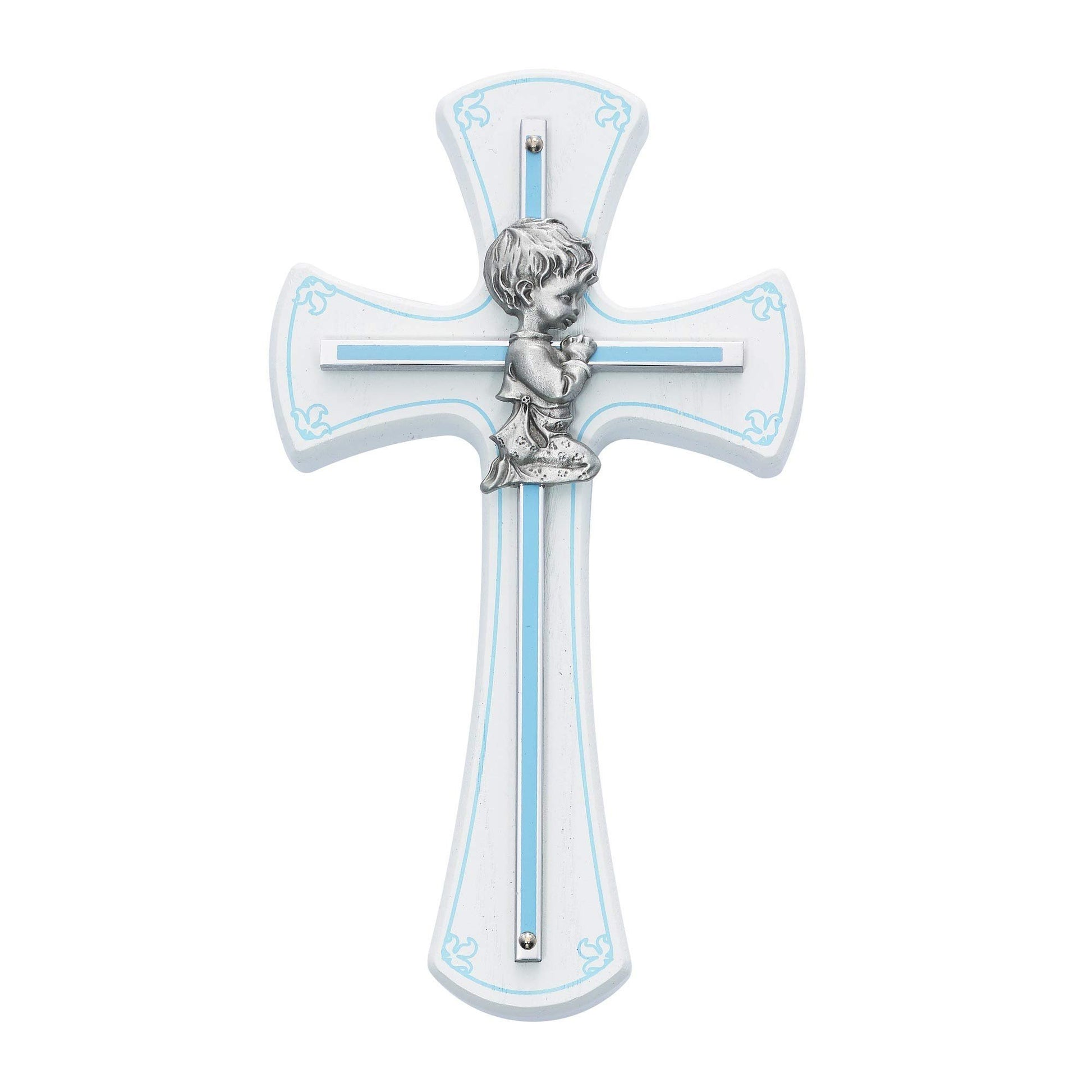 This baby cross measures 7" long. The wood is painted white with a aluminum blue silk screen cross and silver plated praying boy. Gift box included.