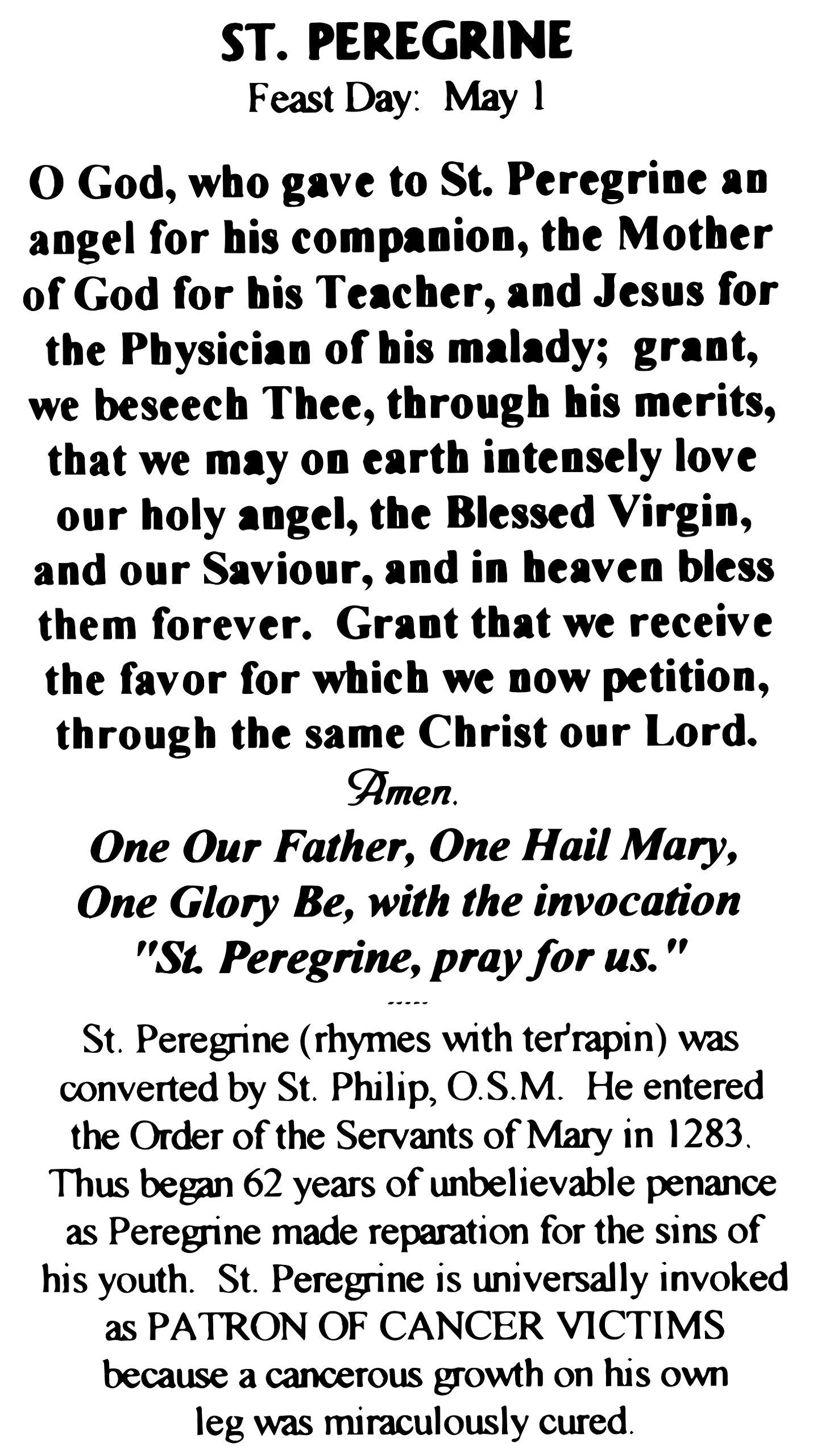 Mcvan Mfg. Women's St. Peregrine Medal with Prayer CardSaint Peregrine is the Patron Saint of Cancer PatientsComes with Saint Peregrine Holy CardMedal is Solid Pewter, Made in the USAMakes a Great First Communion or Confirmation GiftComes with 24" Stainless Steel Curb Chain