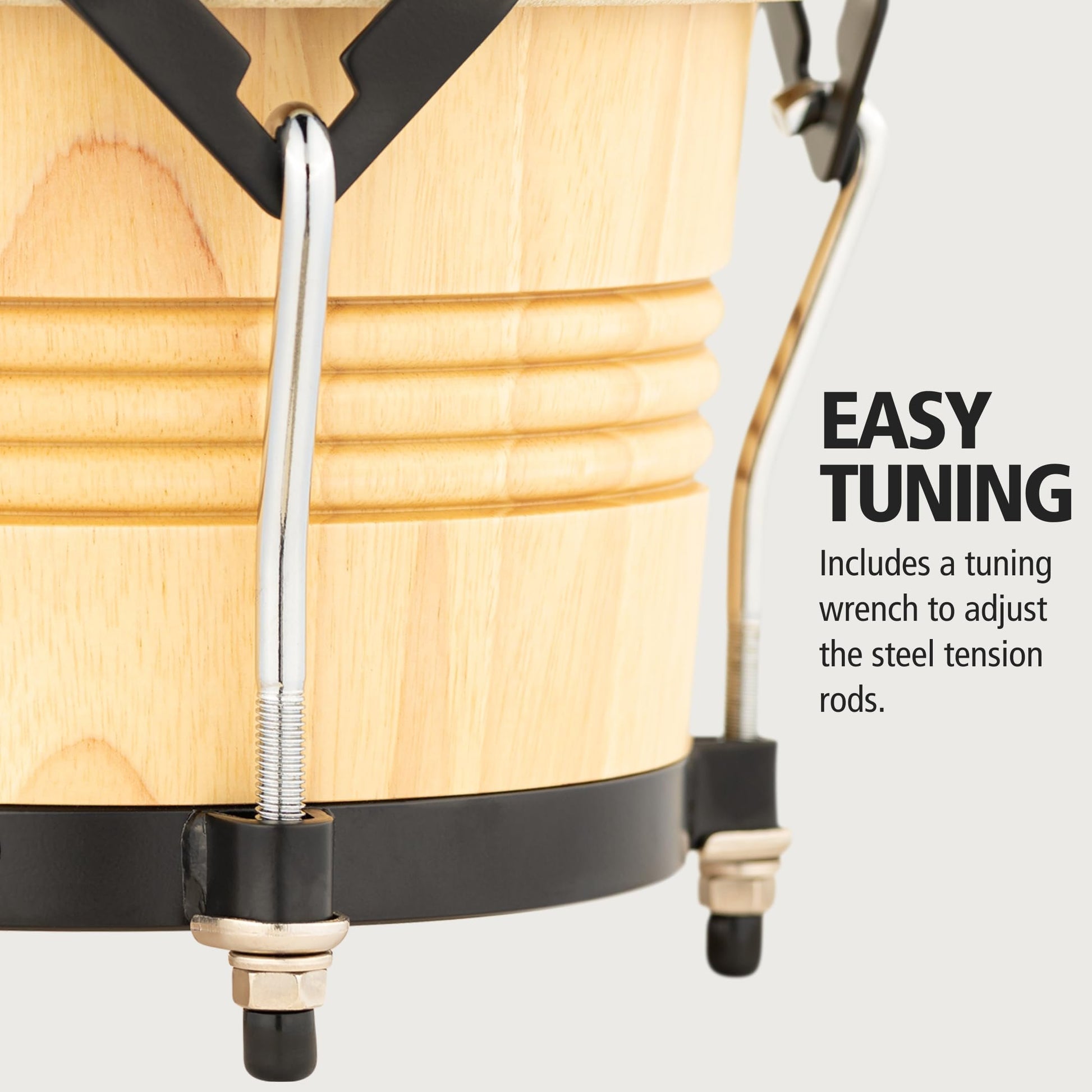 Meinl Percussion LC300NT-M Artist Series Luis Conte Signature Wood Bongos, Natural, 6 3/4-Inch and 8-InchLuis Conte signature bongos — Luis Conte’s signature bongos complement his congas with matching hardware and finish — these bongos were built to the specs Luis prefers to achieve a sound fit for Cuban, Latin American and mainstream American pop musicRubberwood stave shells (natural finish, matte) — solid rubberwood staves are assembled based on uniform qualities like color and grain for a consistent sound — precise proportions allow the drums to complement each other with separate pitchesTrue Skin cow skin heads for a classic, warm sound — outfitted with Meinl True Skin cow heads, their response leans toward more warmth and depth along with superb mid-range tone and an outstanding feel — the heads measure 6 ¾” and 8 ”Traditional rims (black powder coated steel) — 5 mm Meinl traditional TTR rims help the bongos respond with clarity and cut — this traditional style is great for players who need greater control and use the rim as part of their feel while playingTraditional solid block connection — the two individual drums are attached with a solid wood block connection, a classic style that Luis prefers for his signature bongos — this connection block will work with any bongo standIncludes tuning wrench — four 8 mm chrome plated steel tuning lugs on each drum allow you to dial-in your desired pitch easily — a tuning wrench is included with these bongos for quick, on-the-spot adjustments or head changesManufacturer disclaimer — typographical or grammatical errors found in the bullet point or description text on this product page are a result of this site’s system and are neither the fault of the manufacturer nor marketplace sellers