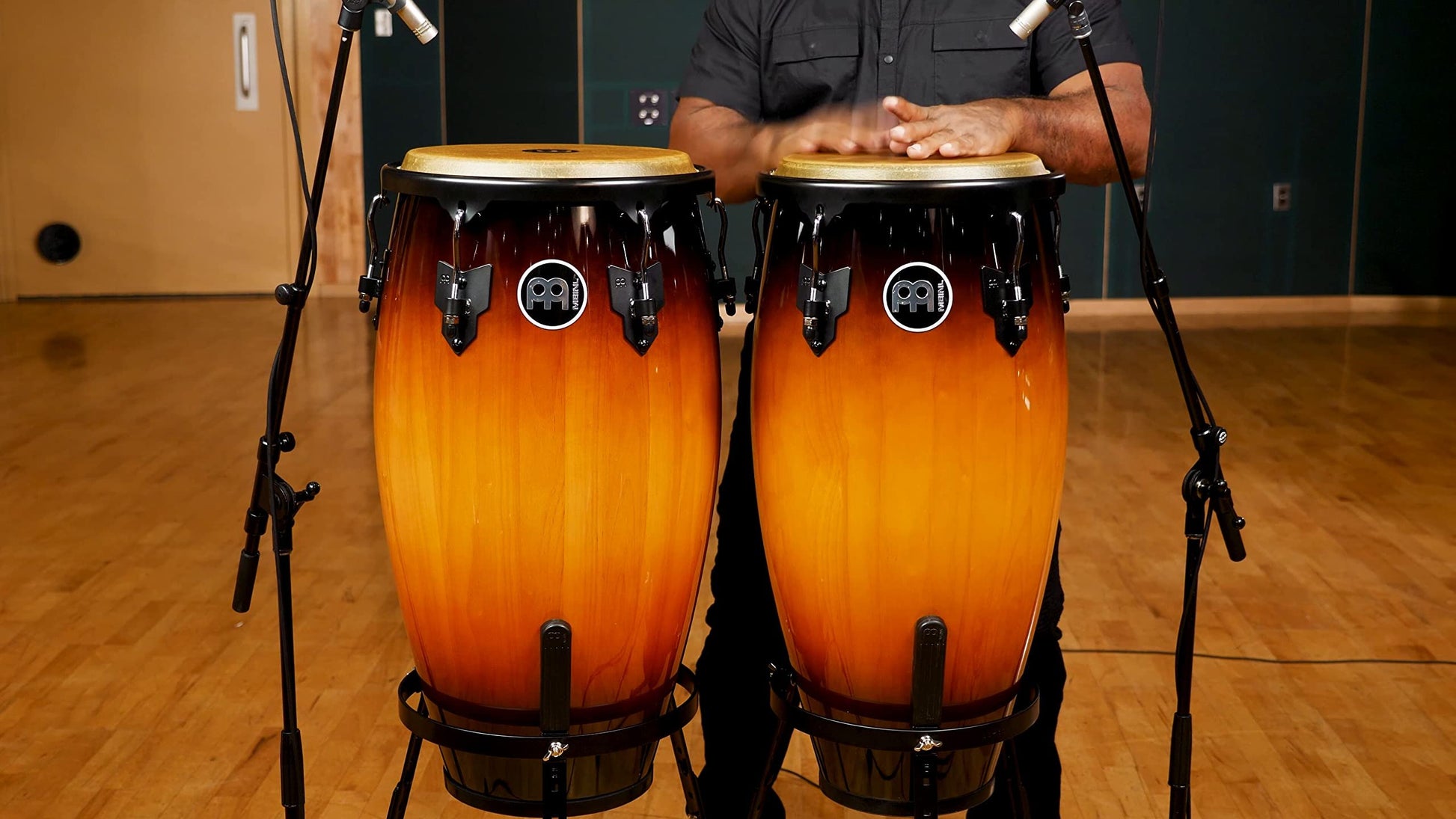 Meinl Percussion HC512VSB Headliner Series 11-Inch and 12-Inch Conga Set With Basket Stands, Vintage SunburstSustainable rubber wood constructionHeight adjustable basket stands with quick set up systemOriginal MEINL style tuning bracketsBlack powder-coated hardwareHand selected buffalo heads