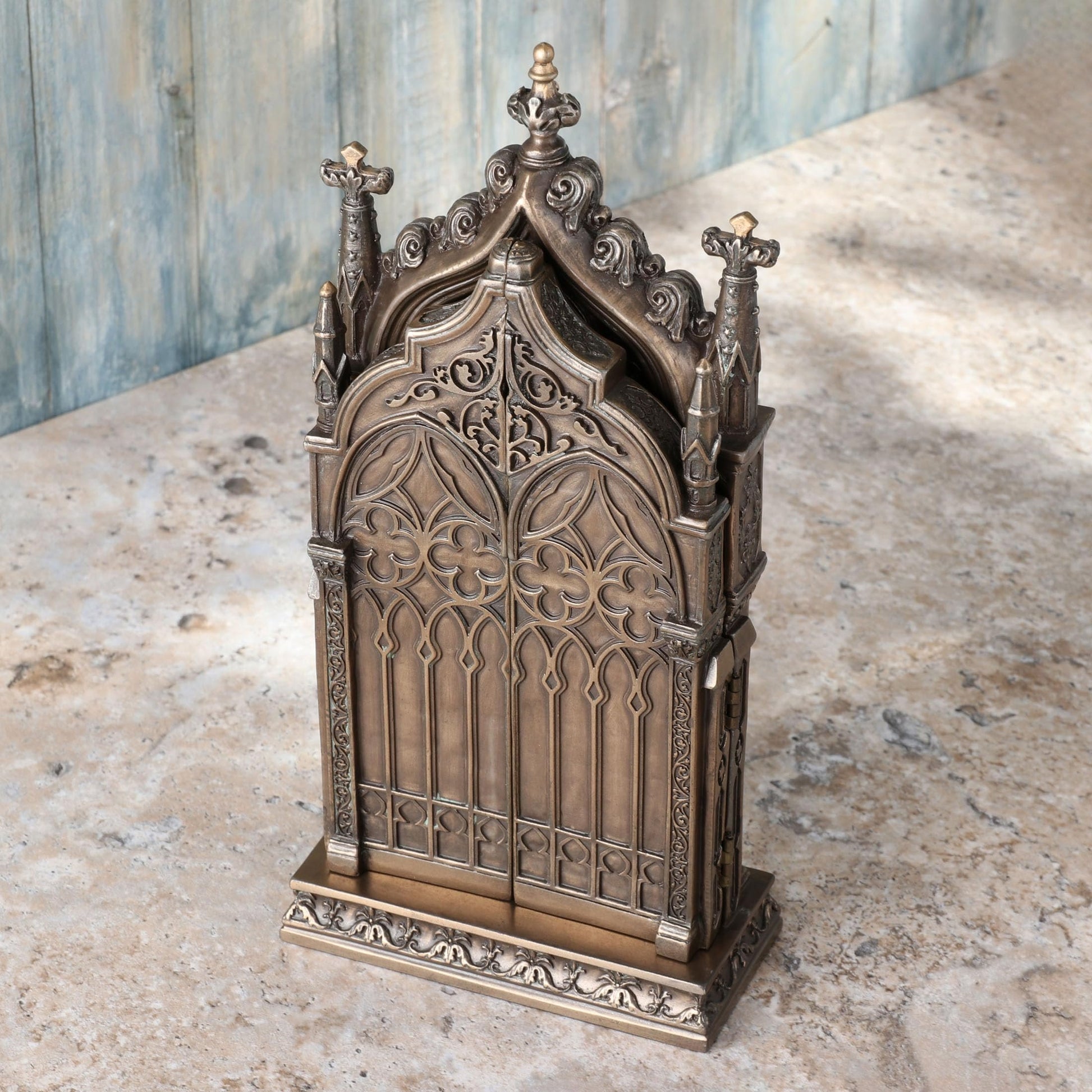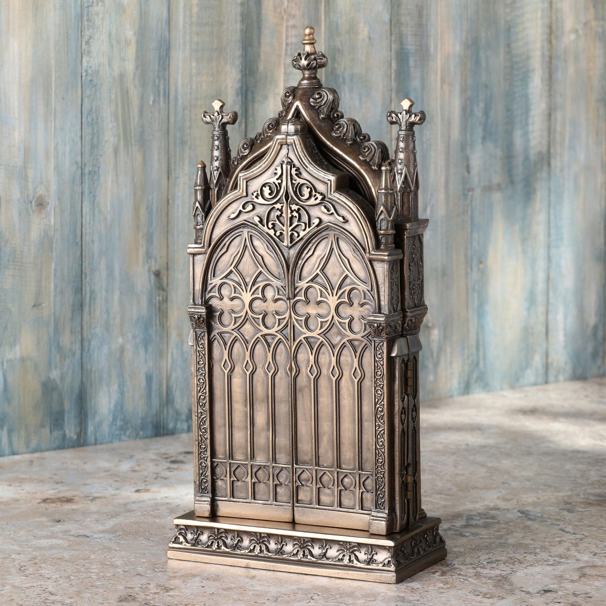 A triptych is a form of art that consists of three panels or sections, often hinged together side by side. The design can be traced back to early Christian art history around the 4th century. Initially, it was used for altarpieces and had religious importance. The central panel is usually the largest and displays the most significant subject, while the side panels, known as wings, showcase related thematic elements. Over time, the triptych design was adopted in various forms of artistic expression, including painting, relief carving, and stained glass. It's often used to tell a story or depict different aspects or interpretations of the same theme. Key examples include The Garden of Earthly Delights by Hieronymus Bosch and The Annunciation Triptych by Robert Campin.QUALITY PRODUCTION: Made with high quality designer resin and cold cast bronze techniqueCOLD CASTING: Cold casting is the technique that mixes resin and bronze powder together to create detailed sculpture work with metallic finishUNIQUE DESIGN: Exquisite detailing with a traditional Byzantine triptych styleMEASUREMENT: L 4 3/8 * W 2 * H 8 7/8 InchesPACKAGING: Gift box ready with black felted bottom protection, perfect gifting option for collectors