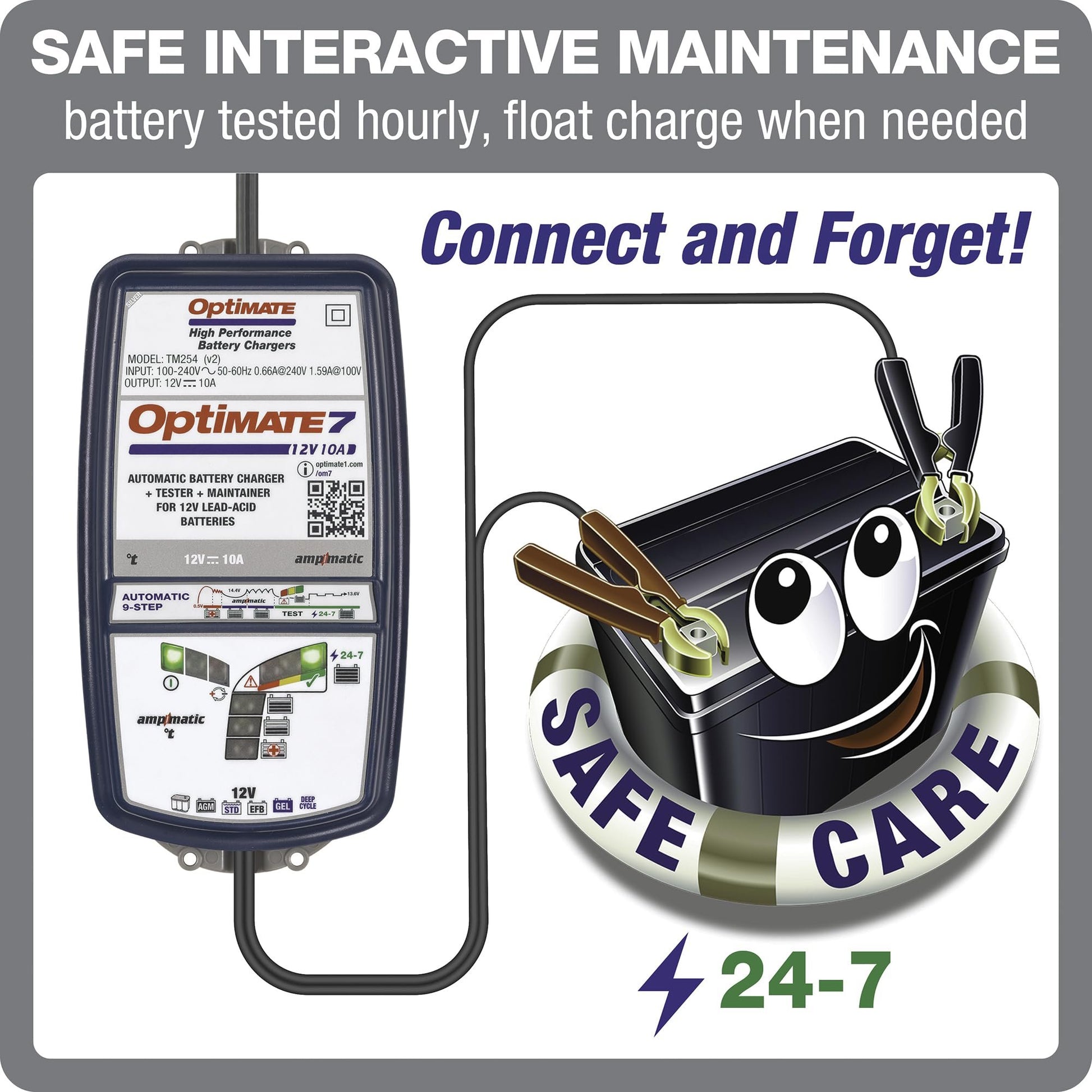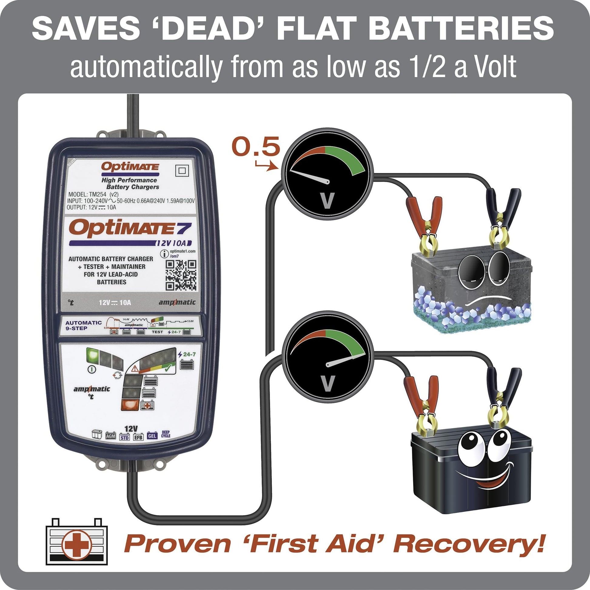 Optimate 7 AmpMatic - 12V 10A, High Performance Automotive Battery Charger & maintainer for premium AGM, Deep-Cycle Batteries (TM-255v2)The Optimate 7 saves batteries other chargers can’t, because it recognizes the difference between a discharged battery that needs charging and a dead flat sulphated battery that needs saving in your car, pick-up truck, marine and industrial equipment.Charging is fully automatic and worry free. Ampmatic charge control with built-in temperature compensation automatically adjusts charge rate according to battery size and condition and ambient temperature, guaranteeing an optimal charge every time.Accurately Tests after charge: If it’s able to hold its charge retention and shows final state of charge. Have the reassurance and full understanding of your battery.No risk of overcharging. Totally safe for vehicle electronics. Sparks suppressed. Safe for long-term battery maintenance. Automatic shut-down if short-circuited or battery disconnected.The automatic 9-step program saves a deep discharged battery from as low as 0.5 Volts and will then charge and maintain the battery, all automatically with long term maintenance mode that keeps the battery at its optimal level 24-7.