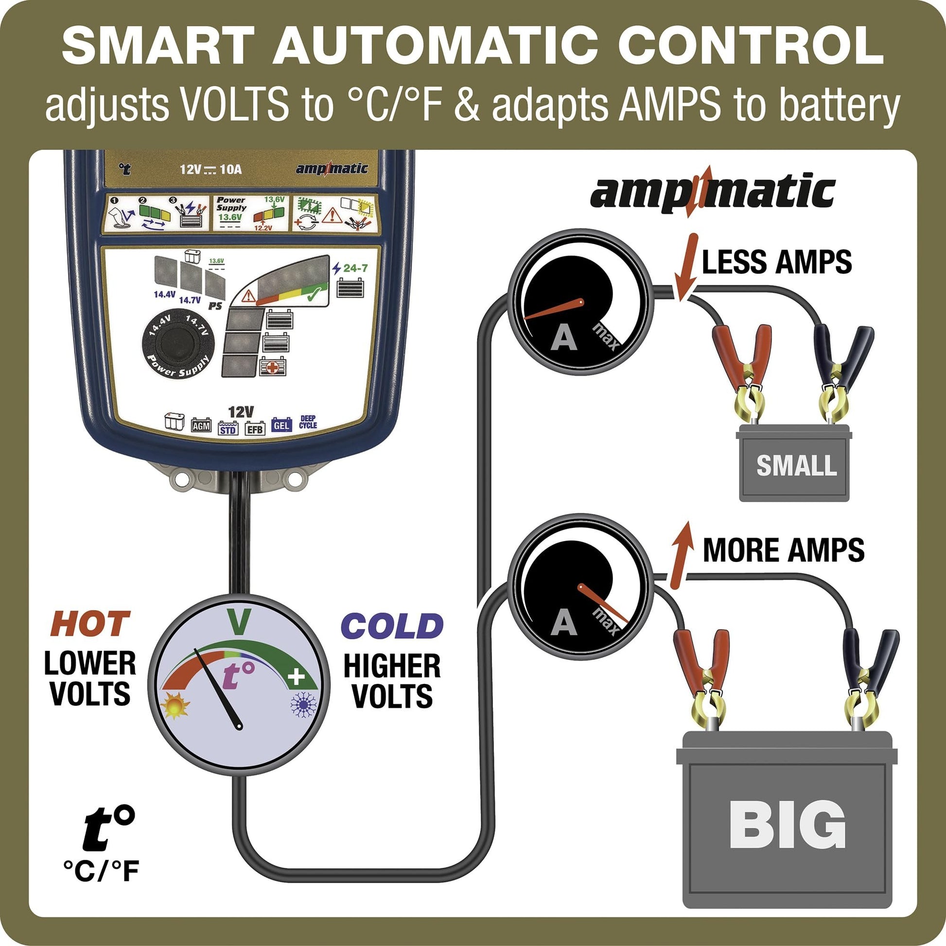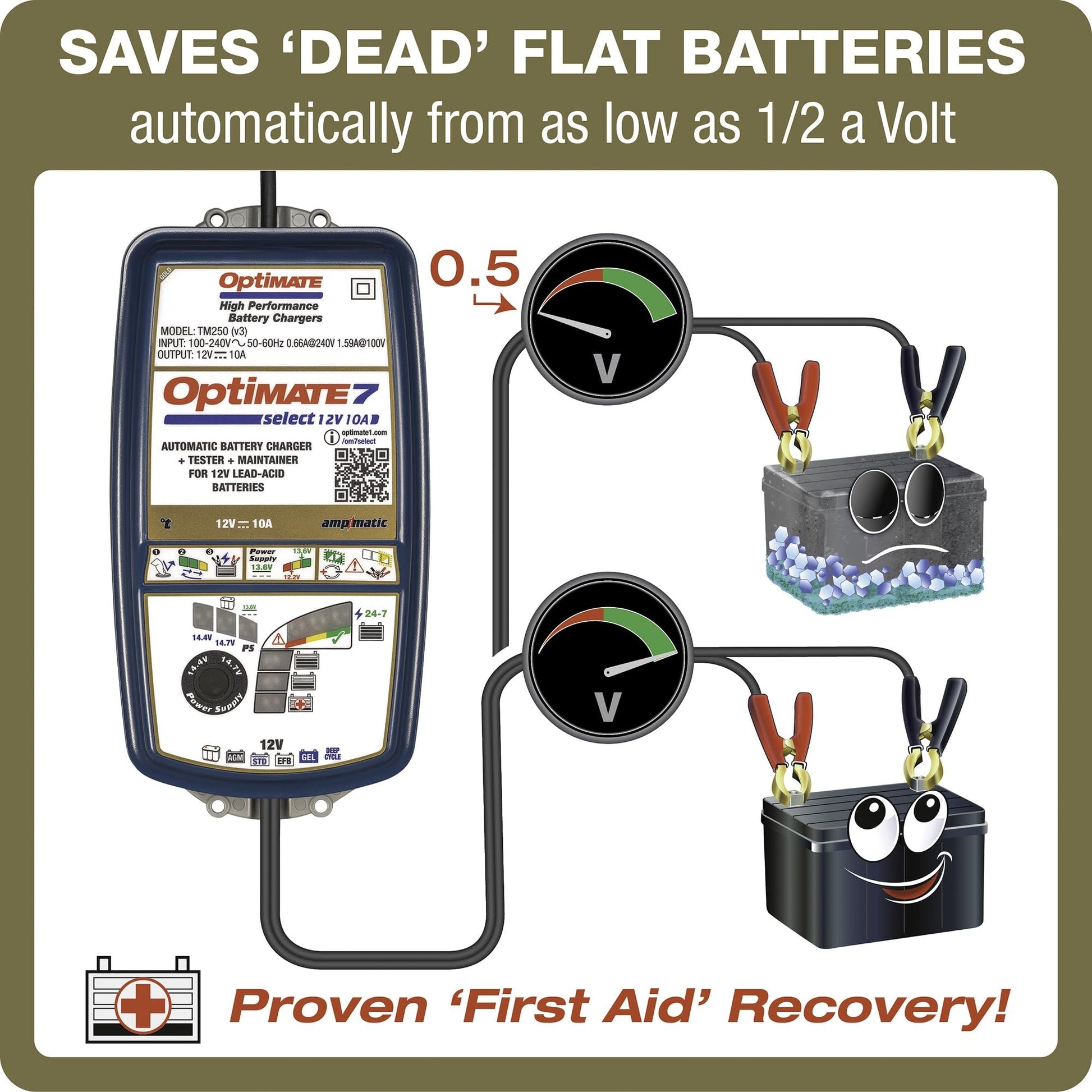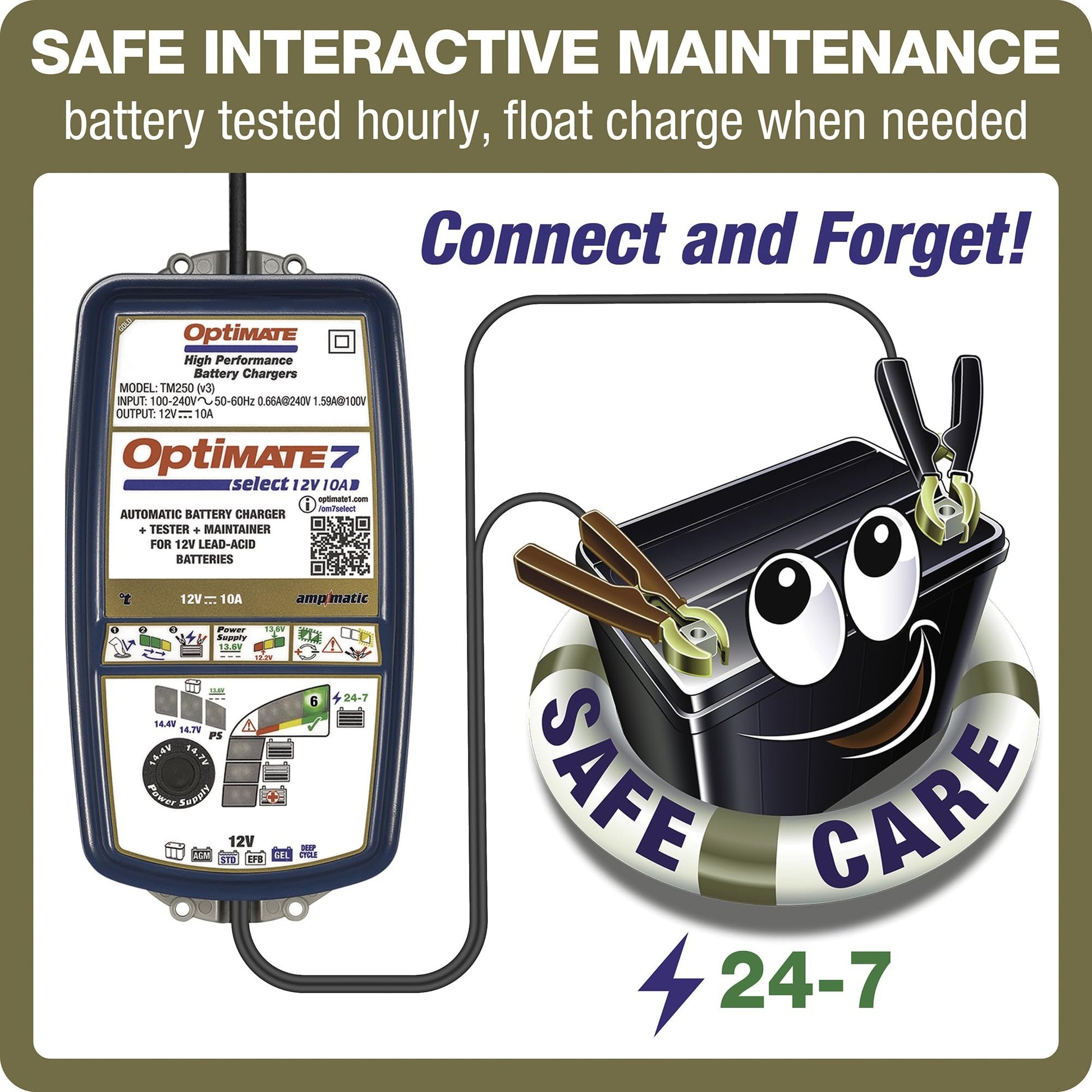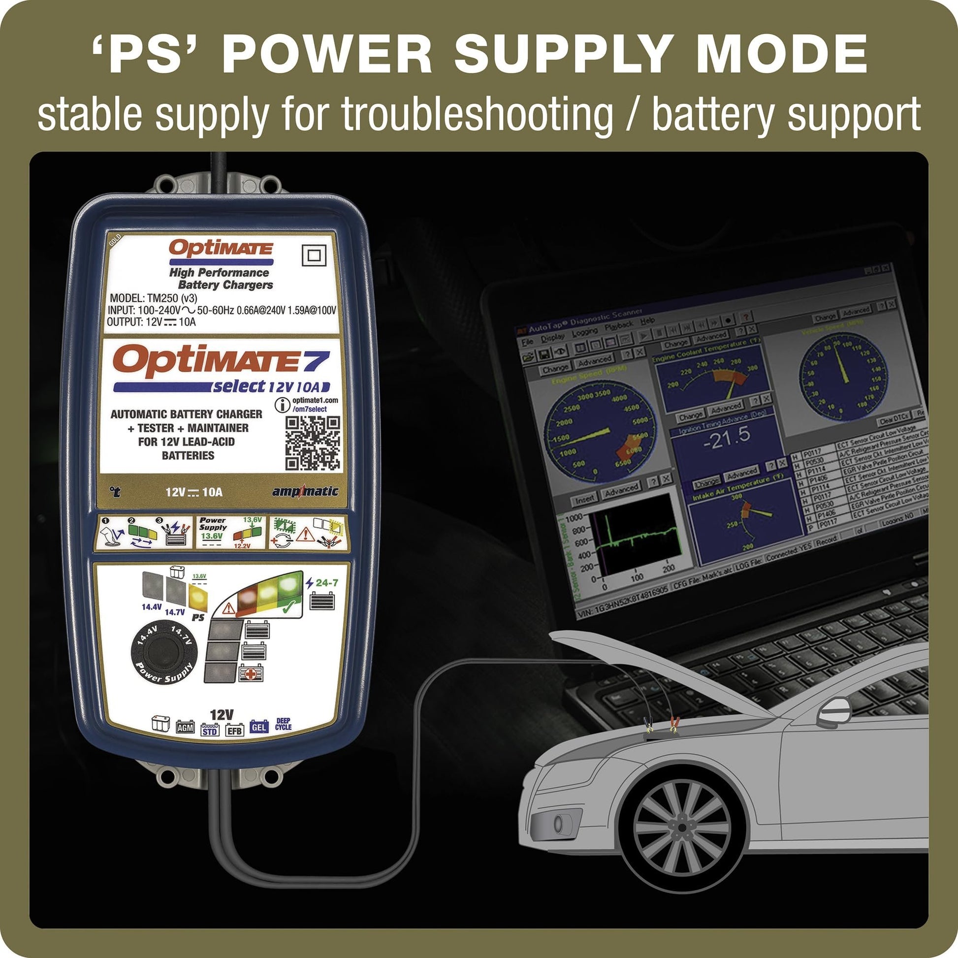 Optimate 7 Select - 12V 10A, High Performance Automotive Battery Charger & maintainer for premium AGM, Deep-Cycle Batteries (TM-251v3)Designed to optimize performance and extend the life of 12V starter (SLI) batteries in your car, pickup truck, ATV, speed boat or motorcycles. Also works great for your RV.Precise charging with two 12 Volt charge modes, dialing in the right charge level for Premium AGM, spiral cell, or standard AGM batteries. Added POWERSUPPLY mode provides constant power for vehicle tuning, diagnostics and troubleshooting.Select charge voltage of 14.4V for most batteries or 14.7V for premium AGM batteries, or select Power Supply support mode. Your charge mode selection remains in memory even if the AC power is lost or battery is disconnected.Charging is fully automatic and worry free. Ampmatic charge control with built-in temperature compensation automatically adjusts charge rate according to battery size and condition and ambient temperature, guaranteeing an optimal charge every time.The automatic 9-step program saves a deep discharged battery from as low as 0.5 Volts and the accurate pulsing absorption completes charging to 100% without gassing followed by long term maintenance mode that keeps the battery at its optimal level 24-7.