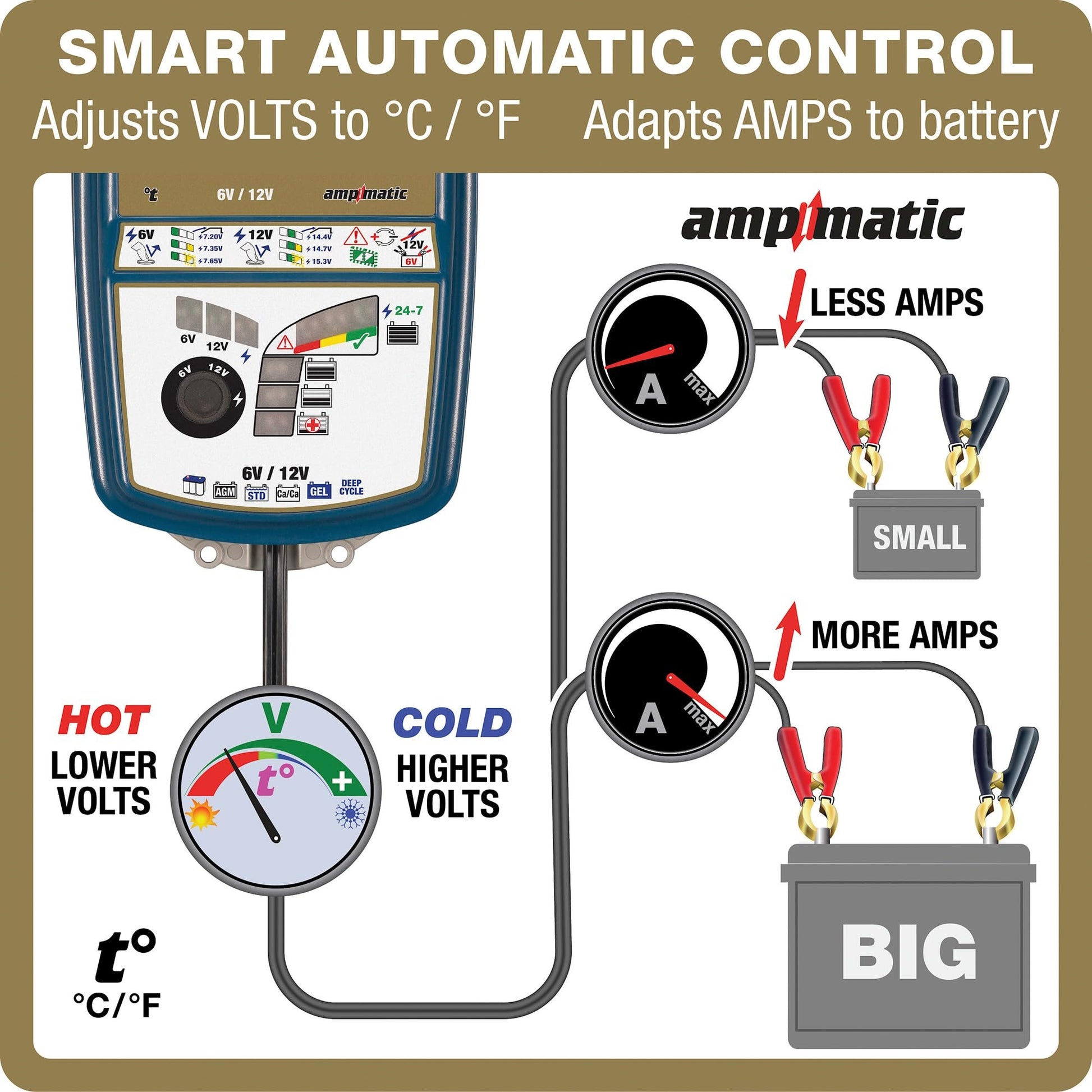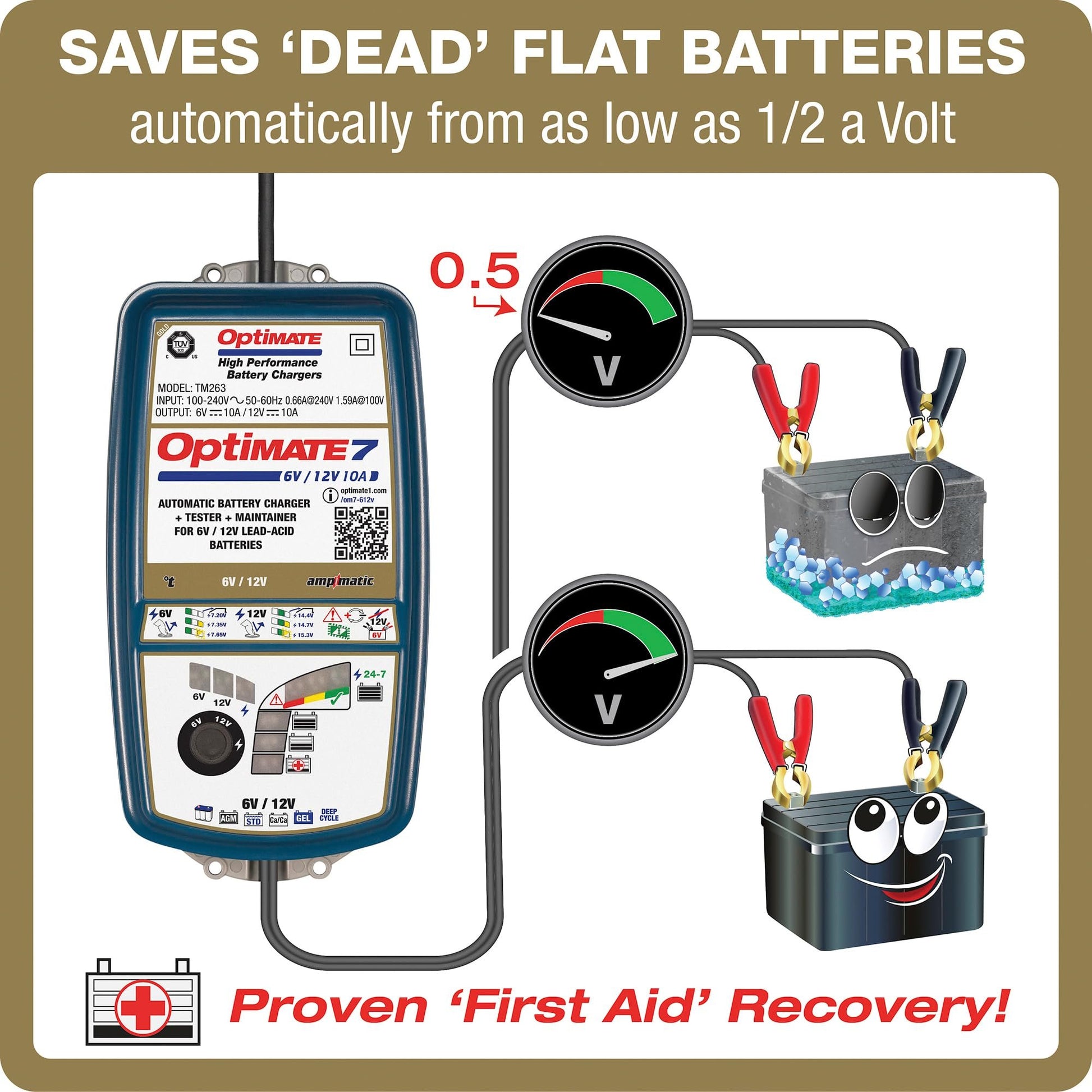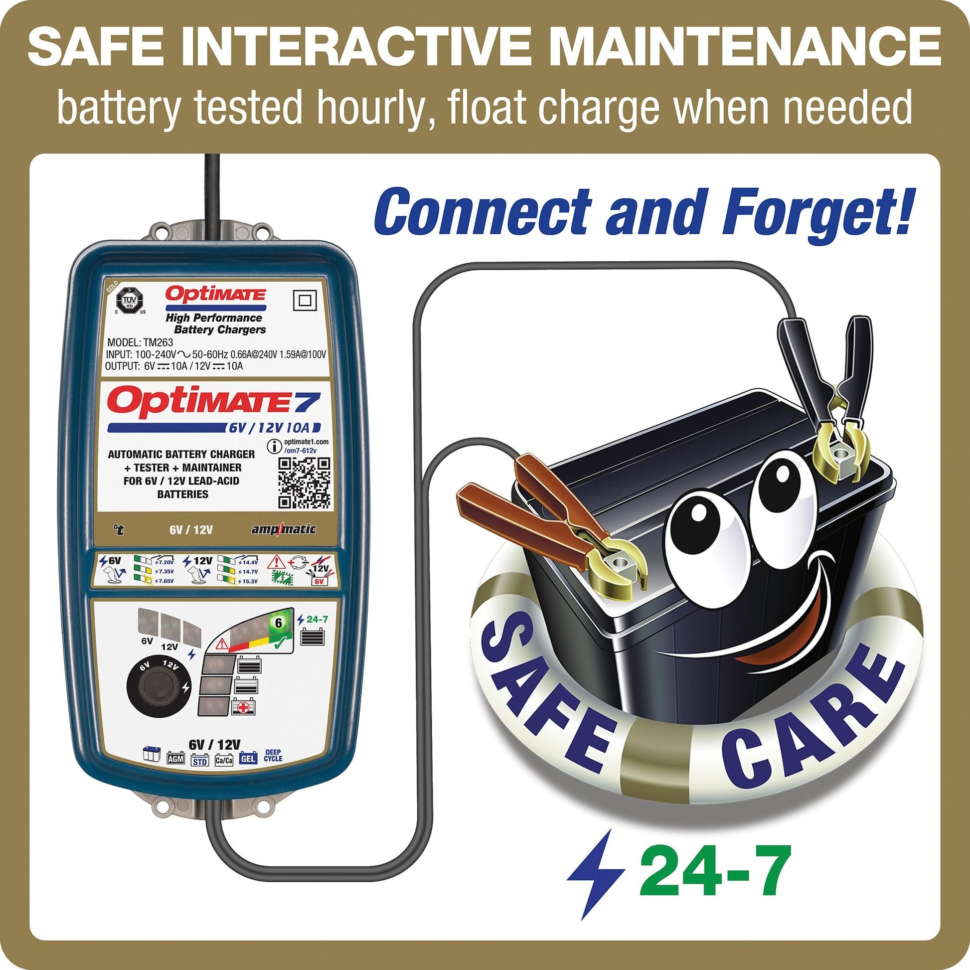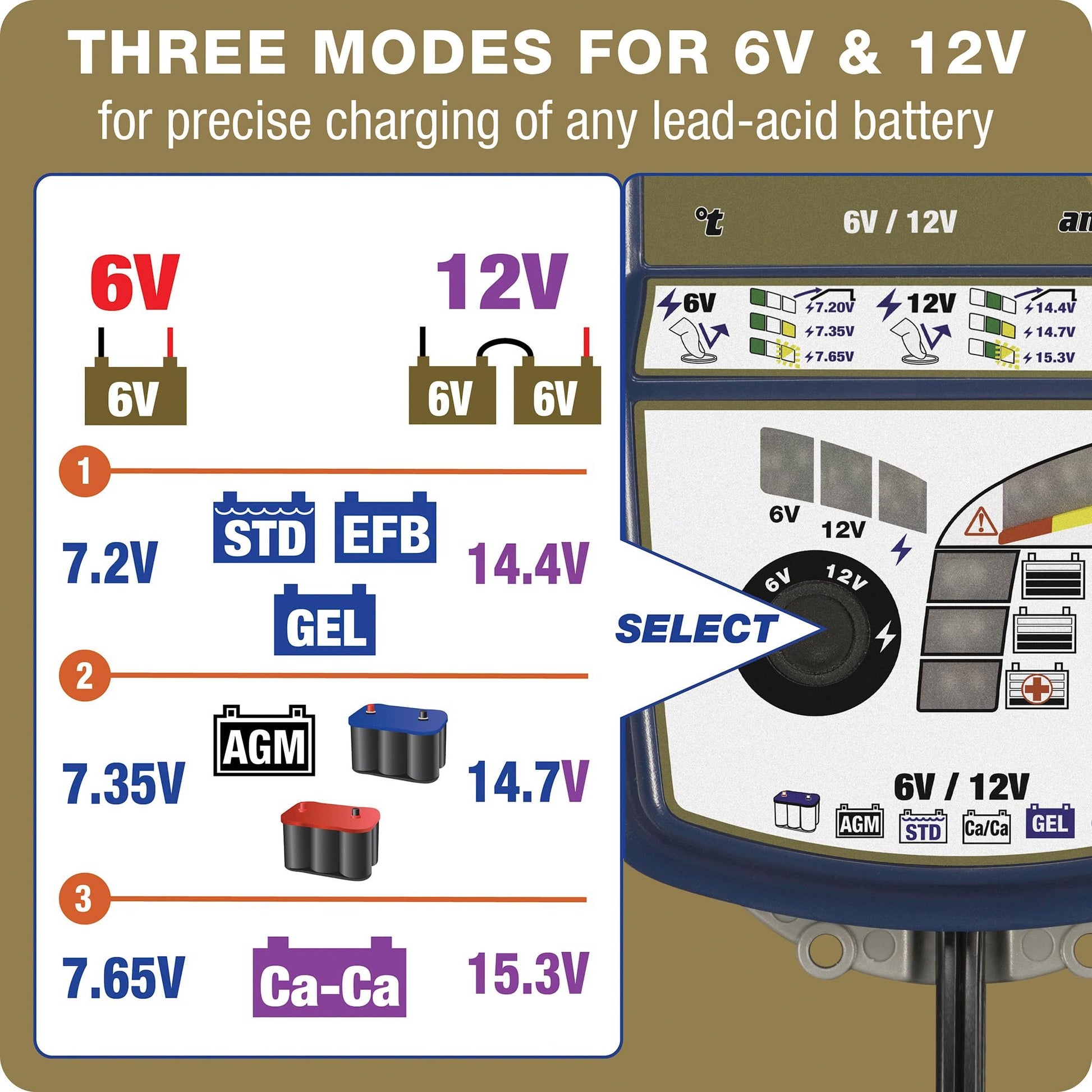 Optimate7 6V/12V - 10A, High Performance Battery Saving Charger & Maintainer for Automotive, AGM, Deep-Cycle and RV Batteries (TM-263)Designed to optimize performance and extend the life of 6V and 12V deep cycle batteries in your RV or Marine craft, also works great for any starter battery in cars, pickup trucks, ATV or motorcycle.Precise charging with three 6 Volt charge modes and three 12V charge modes, dialing in the right charge level for flooded batteries, sealed AGM and GEL or lead-calcium CA-CA batteries. Scroll down for technical specifications.Your charge mode selection remains in memory even if the AC power is lost or battery is disconnected. Safe selection ensures you don’t accidentally charge a 6V battery if you previously selected a 12V mode.Charging is fully automatic and worry free. Ampmatic charge control with built-in temperature compensation automatically adjusts charge rate according to battery size and condition and ambient temperature, guaranteeing an optimal charge every time.The automatic 8-step program saves a deep discharged battery from as low as 0.5 Volts and will then charge and maintain the battery, all automatically with long term maintenance mode that keeps the battery at its optimal level 24-7.