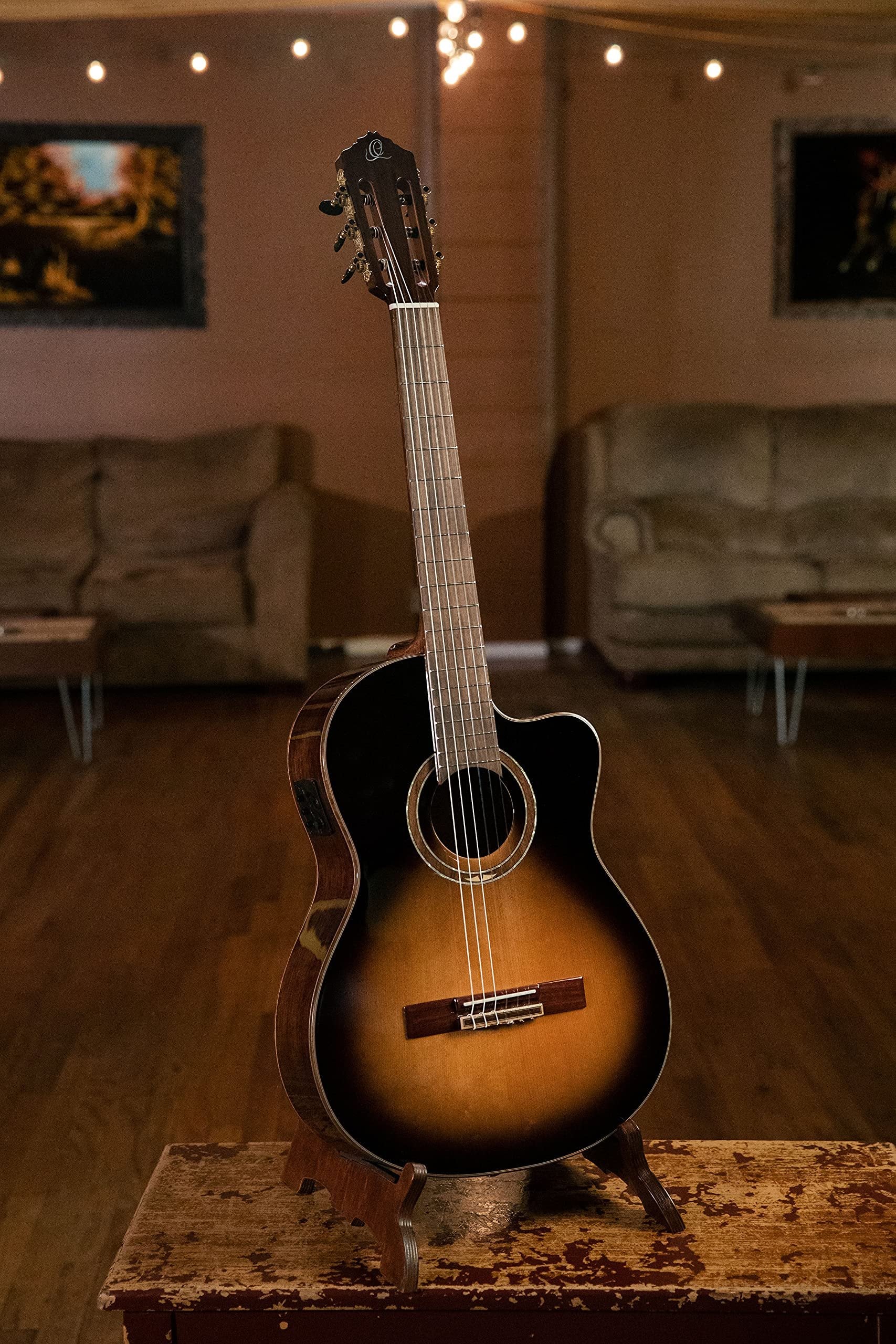 Full Body 650 mm Scale - 102 mm Body Depth - 48 mm Nut Width Slim Neck - 19 Frets - Spanish Heel with 2-Way Truss rod - Gold Plated Tuning Machines w/ Black Buttons - Fan Bracing - 12-Hole Bridge: Provides a greater break angle for a cleaner, crisper sound & faster string replacement - Ortega MagusPro preamp/pickup system with built-in tuner - Venetian Cutaway