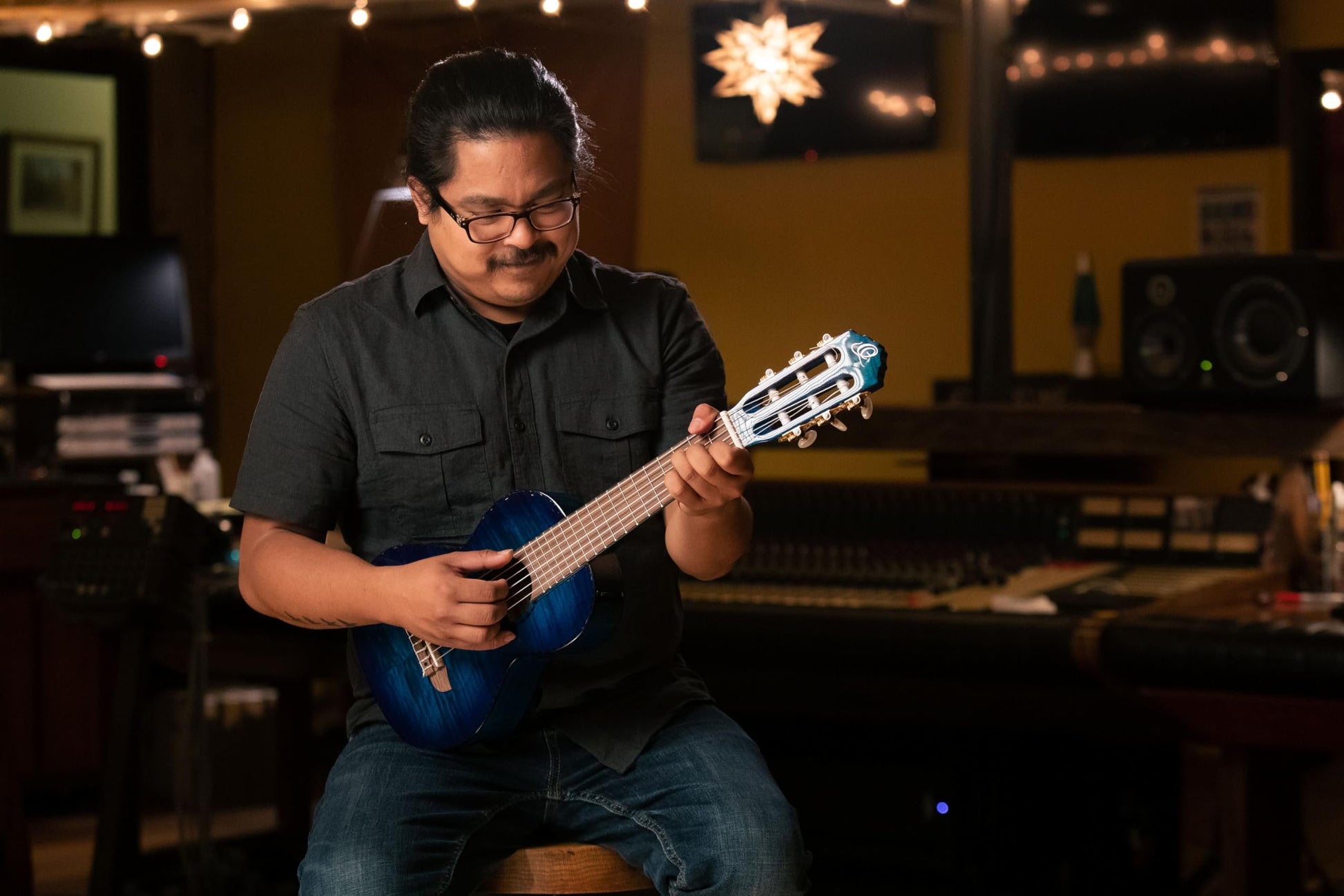 Ortega Guitars 6 String Timber Series Acoustic-Electric Guitarlele w/Bag, Right (RGLE18BLF)RGLE18BLF - 6-String Acoustic/Electric Guitarlele - Timber SeriesFlamed Mahogany Top, Back & Sides, Gloss FinishFlamed Mahogany Neck, Gloss Finish - Walnut Fretboard & Bridge - Tortoise Style ABS BindingGuitarlele 435 mm Scale - 68 mm Body Depth - 47 mm Nut Width - 18 Frets - Gold Plated Tuning Machines w/ Pearl Buttons - Ortega MagusUke preamp/pickup system with built-in tunerOrtega Guitars GLNY-6 Guitarlele strings Tuned: A-D-G-C-E-A - Includes Free Deluxe Gig Bag