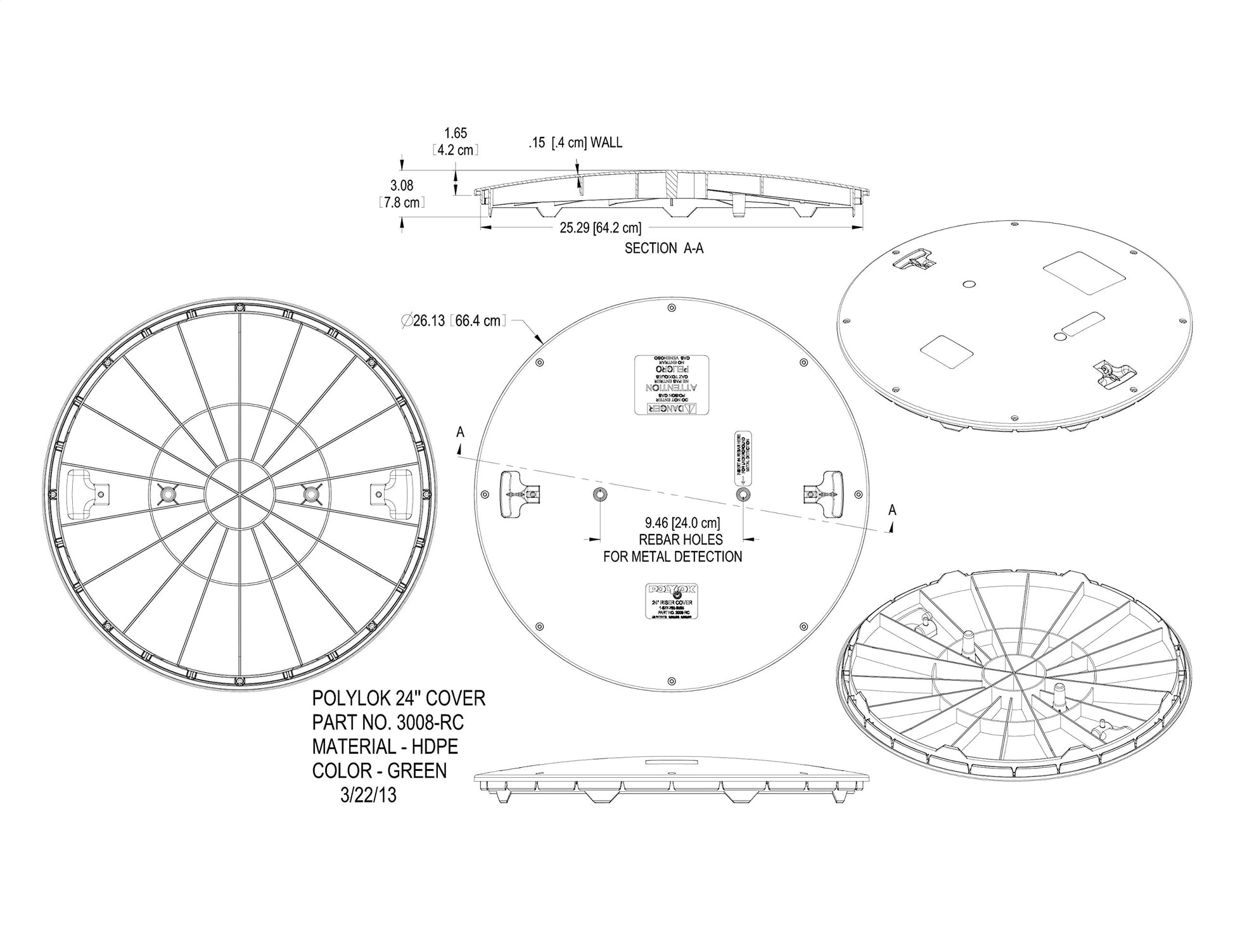 These plastic covers are designed to fit any of the 24” diameter Polylok risers. Polylok's 24” riser covers are made of HDPE with the highest UV protection on the market today. These covers will withstand normal residential and light commercial traffic. Fade resistant, available in green.Designed to fit Polylok 24" risers, Polylok 24" adapter rings, and Polylok 24" d-boxes. (Will not work with other manufacturer's risers or corrugated pipe.)Cover with handlesFactory installed water-tight gasketStainless steel screws providedHighest UV protection on the market