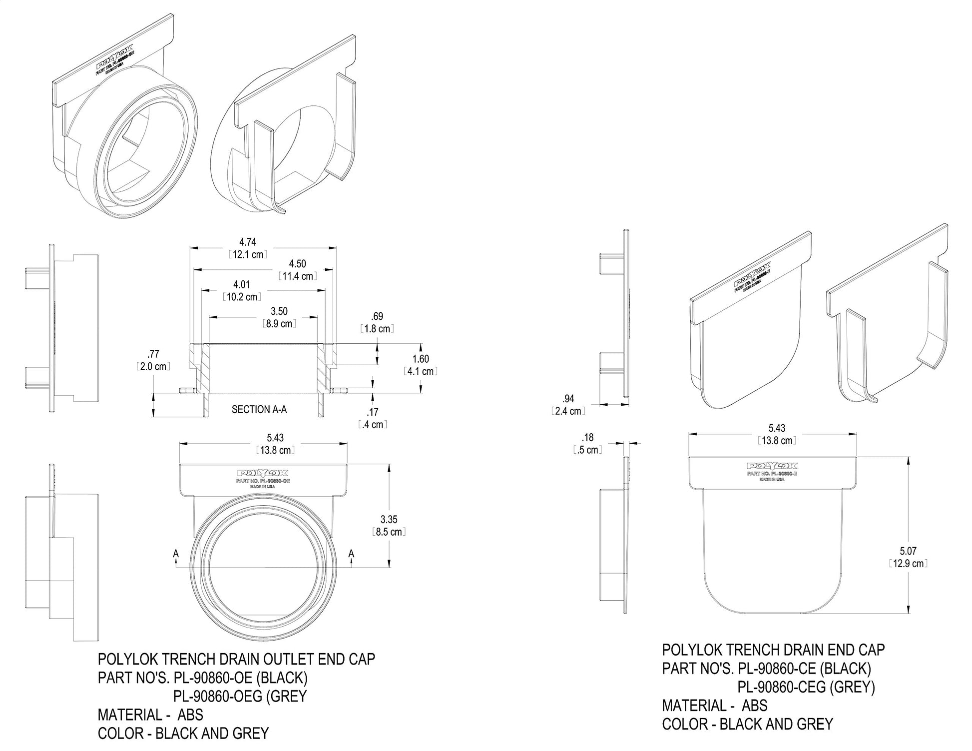 The Polylok Heavy Duty Trench Drain Open Outlet End Cap is to be used with the Polylok Heavy Duty Trench Drain & Grate system. The Polylok Open Outlet End Cap will accept various size pipe. These end caps will fit either end of the Polylok Heavy Duty Trench Drain & Grate system.Colors available in Black, Gray, Green and TanOutlet ports accept 3" SCHD 40 pipe, 4" SDR 35 pipe & 4" SCHD 40 pipeOpen end caps are available and will accept various size pipeOptional closed end caps are also availableBoth end caps will fit either end of the trench drain