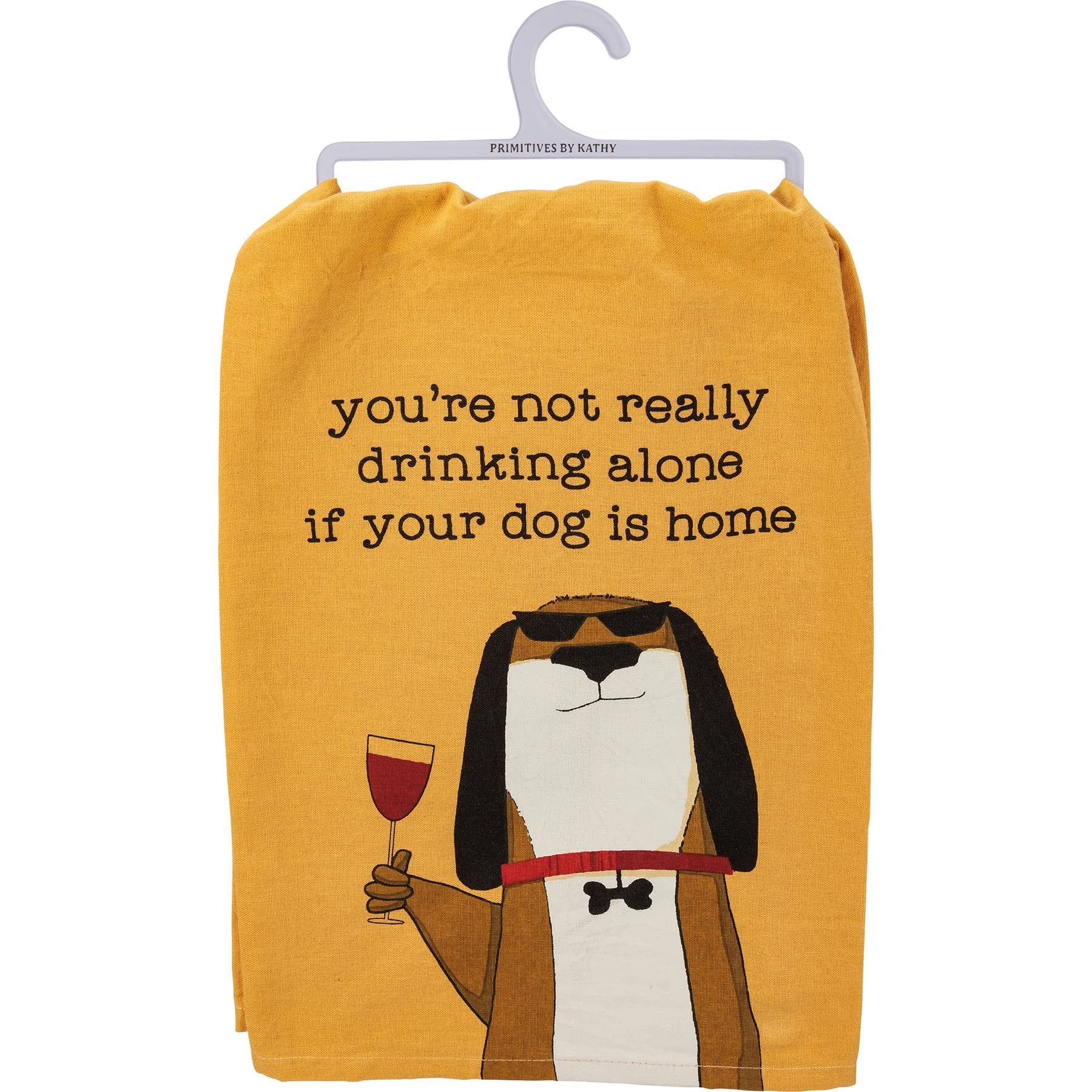 Primitives by Kathy 113839 Kitchen Towel Not Drinking Alone If Dog is Home, CottonBOLD KITCHEN DÉCOR: Fun kitchen towel featuring sentiment and rustic design of a dog holding a glass of wineEASY TO CLEAN: This soft cotton kitchen towel is machine-washableSAY IT WITH SASS: Hilarious, sarcastic or heartwarming - Primitives by Kathy has just the right gift to tell them how you really feelSENTIMENT READS: You're Not Really Drinking Alone If Your Dog Is HomeDESIGNED IN THE USA: Proudly designed in the USA.