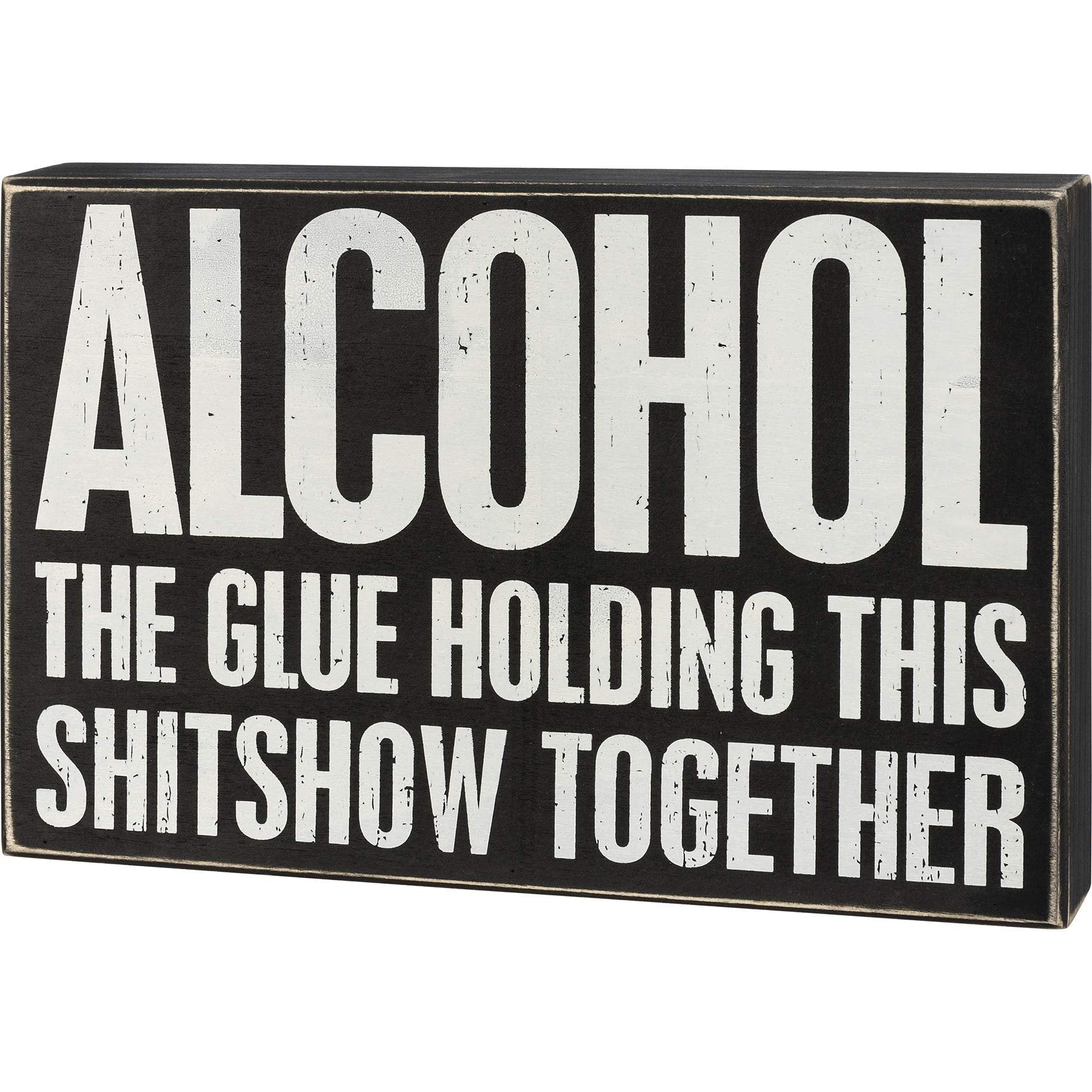 A classic black and white wooden box sign featuring a distressed "Alcohol The Glue Holding This Shitshow Together" sentiment. Easy to hang or can free-stand alone. Dimensions: 12" x 8" x 1.75" Material: Wood Catalog Page: 322 UPC: 190134103491 Artist: Primitives by Kathy Featured: BEST Product Text: ALCOHOL THE GLUE HOLDING THIS SHITSHOW TOGETHER