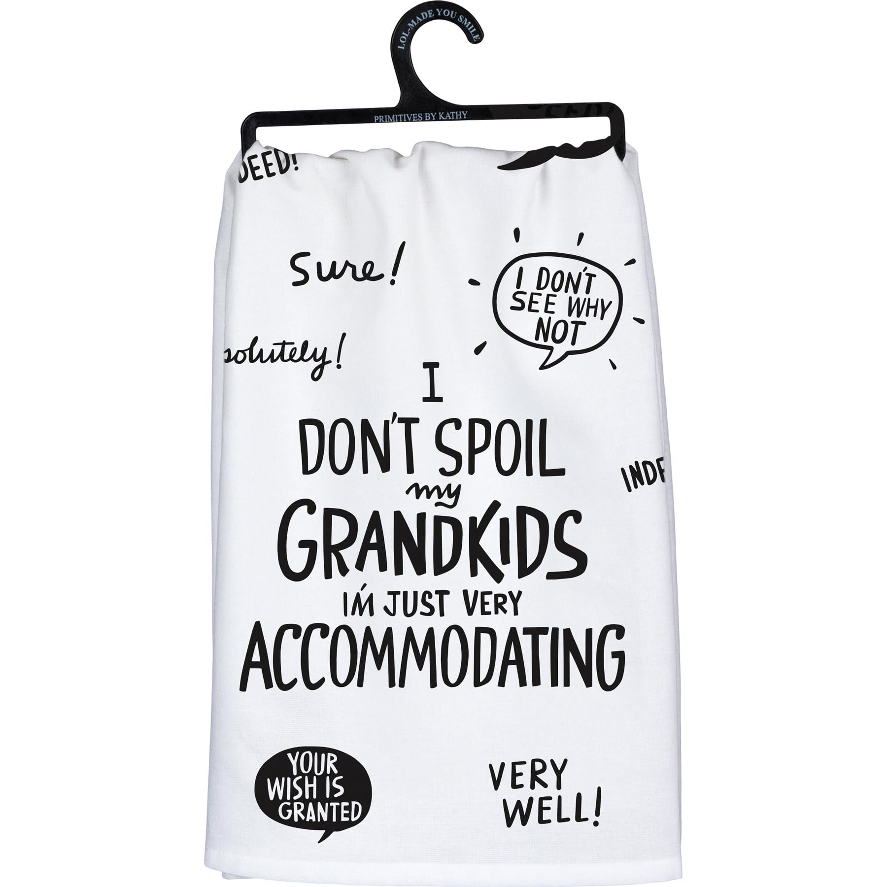 Primitives by Kathy Decorative Kitchen Towel - I Don't Spoil My Grandkids - I'm Just Very AccommodatingCOTTON TOWEL: Kitchen towel made with soft absorbent cottonPLAYFUL DESIGN: Features a fun hand illustrated design with humorous grandparent-themed sentimentEASY TO CLEAN: Kitchen towel is machine-washable for convenient cleaningSENTIMENT READS: I Don't Spoil My Grandkids - I'm Just Very AccommodatingDESIGNED IN THE USA: Proudly designed in the USA