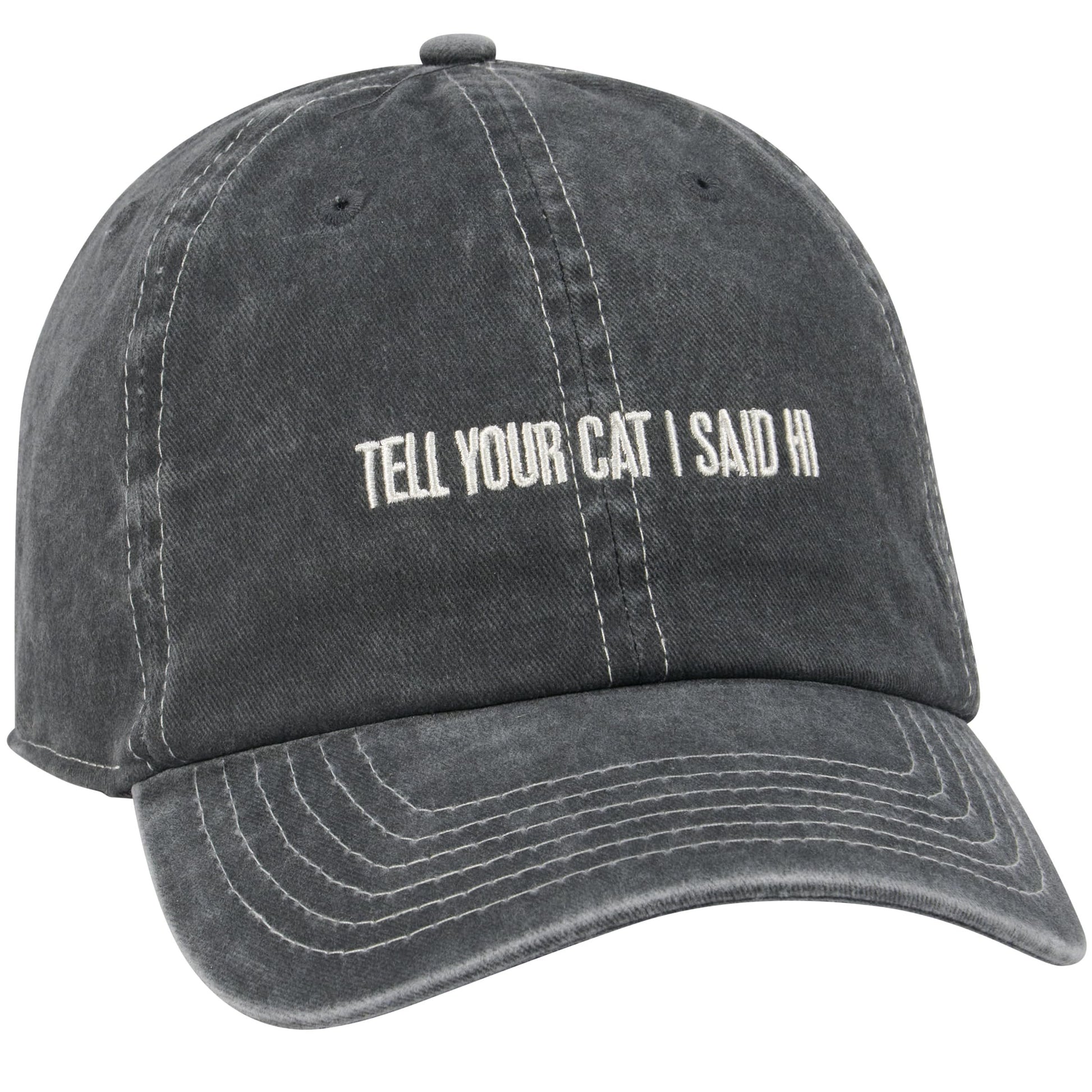 SENTIMENT READS: A cotton baseball cap with an adjustable brass closure on the back. Features "Tell Your Cat I Said Hi" sentiment embroidered in cream onto charcoal base. One size fits most. Hand-wash only.